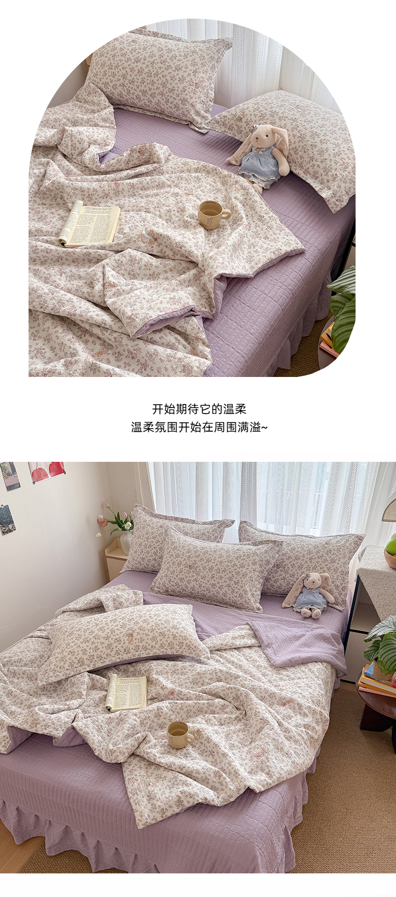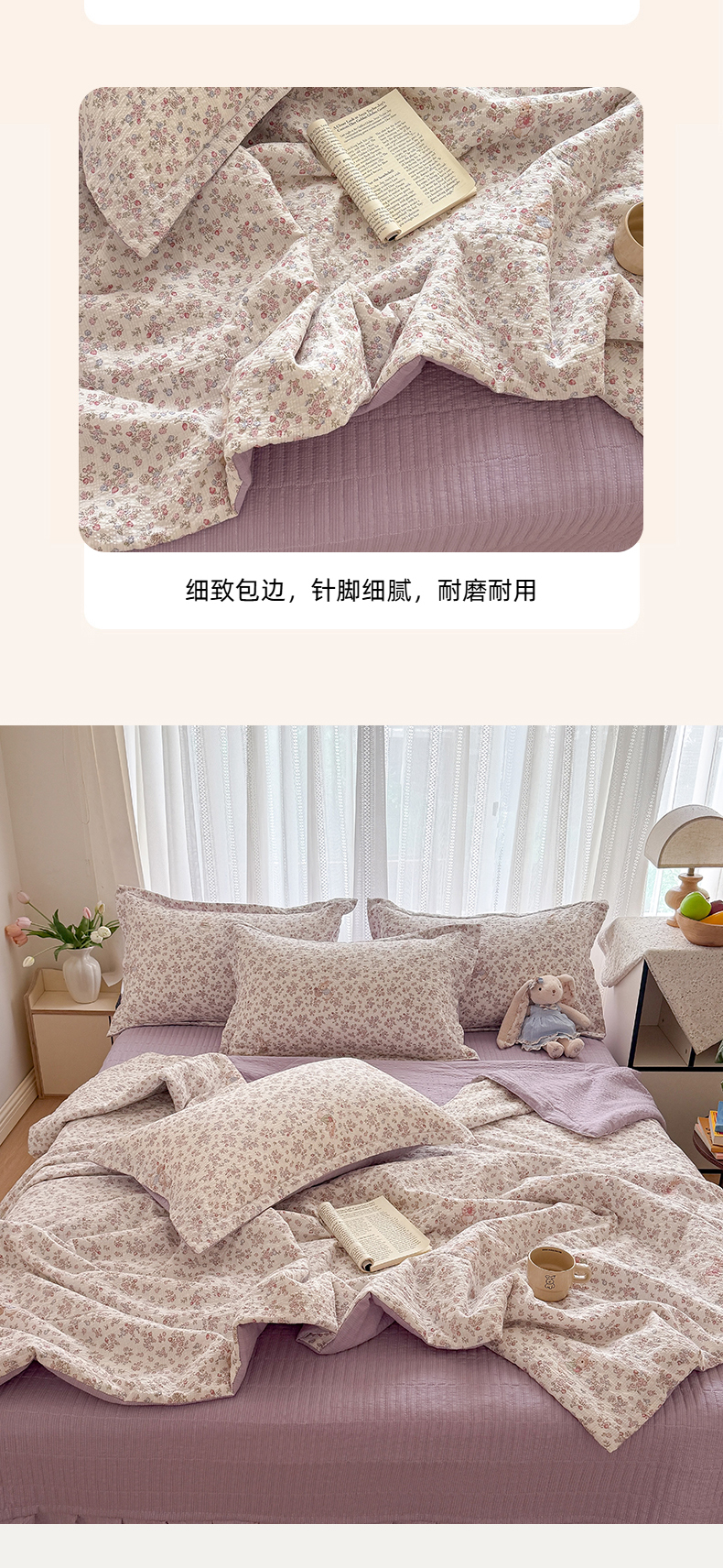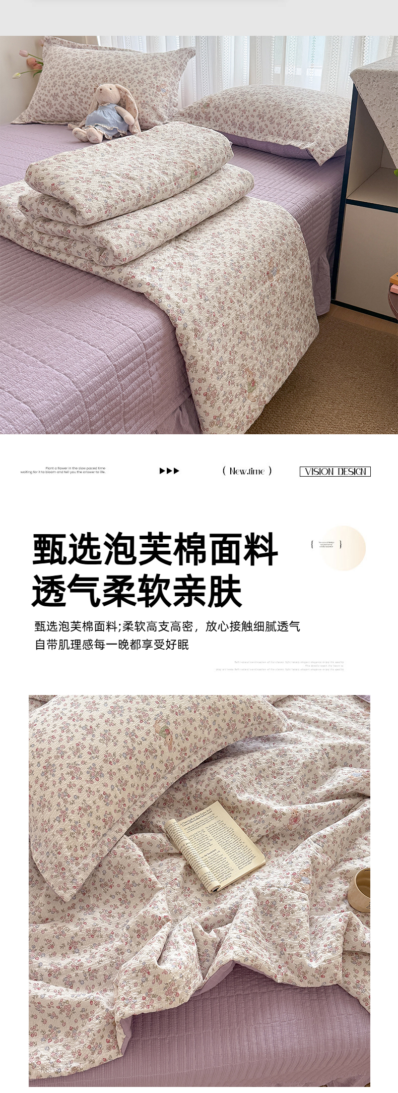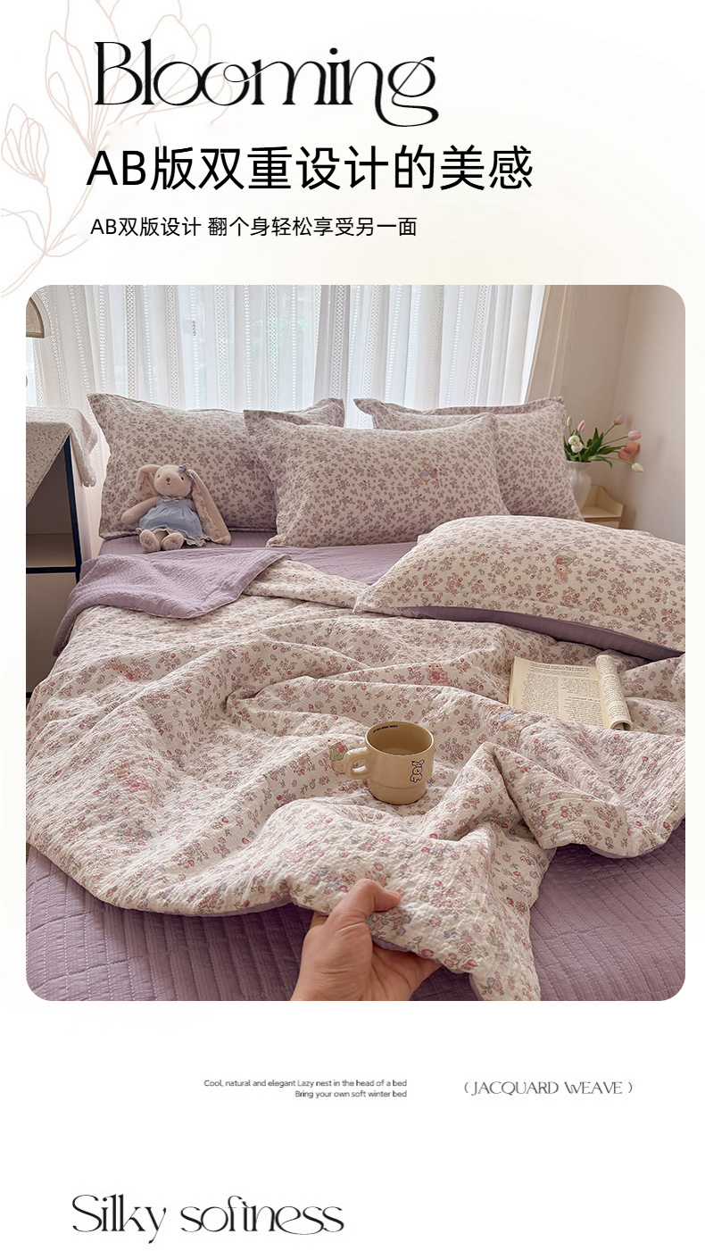 (总)梵希雅 2026新款A类木棉皱皱纱夏被,薄荷奶绿,蜜桃花田,奶油彩糖,青格花信,樱粉星野,紫雾花野,组合图