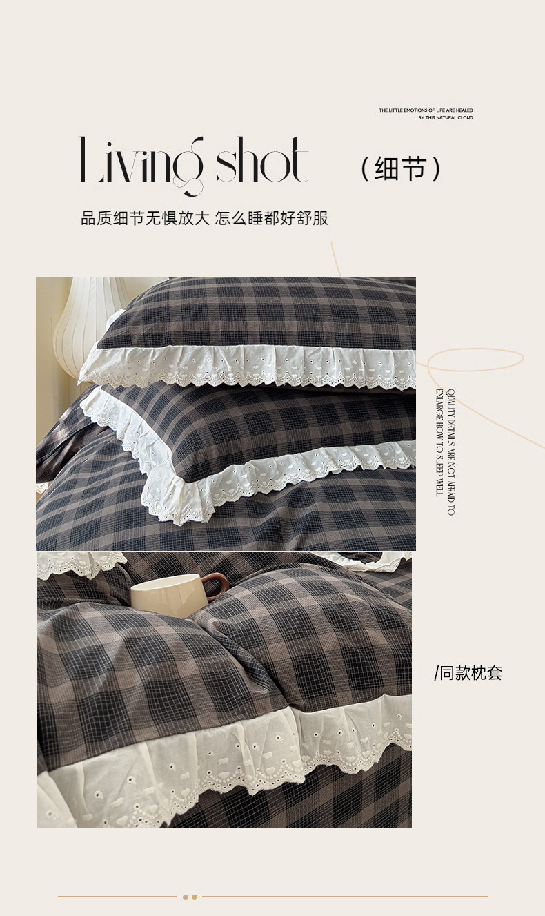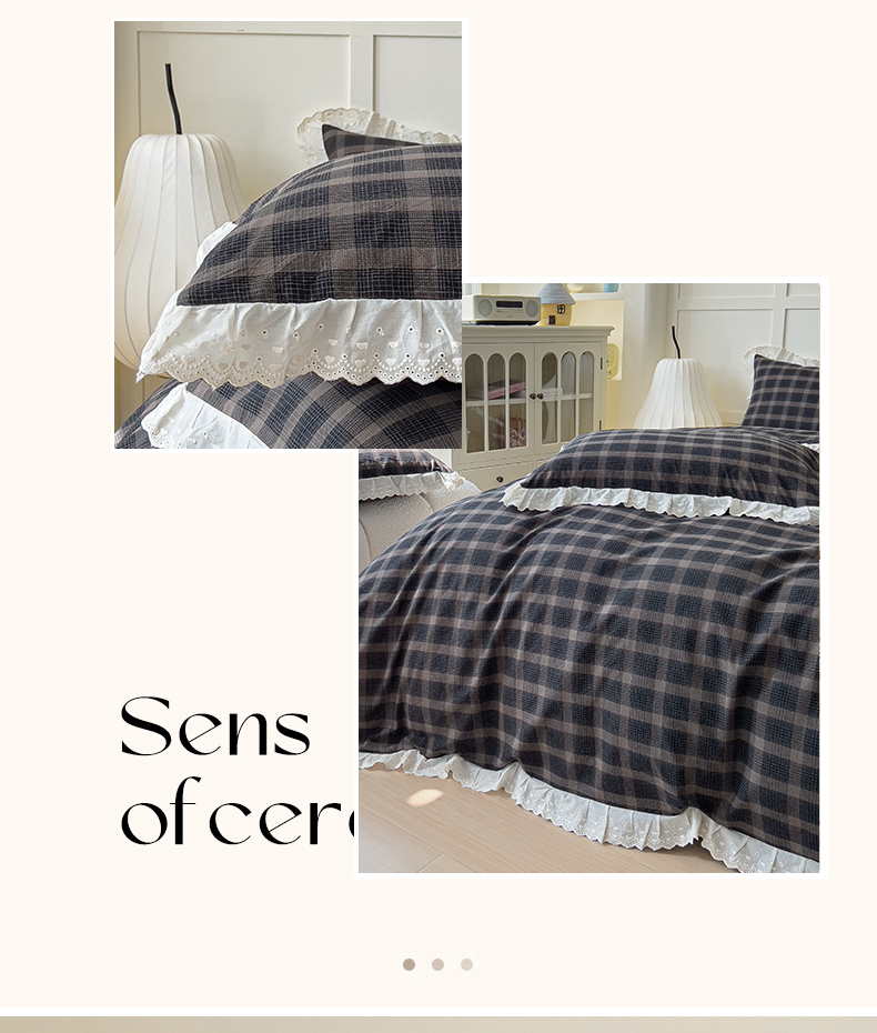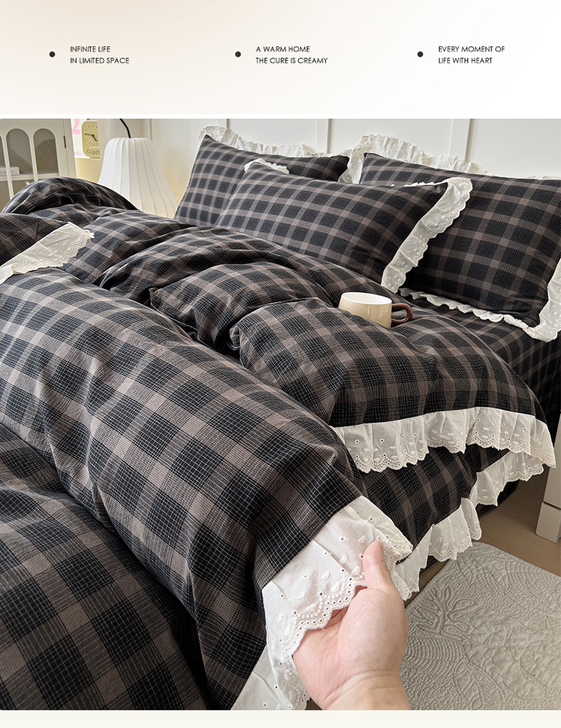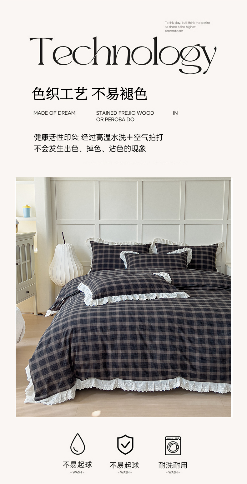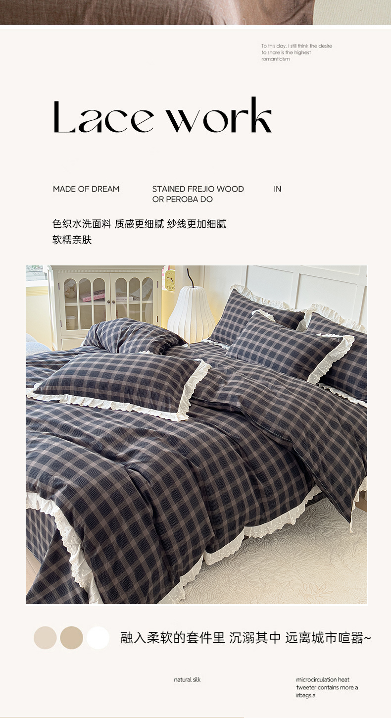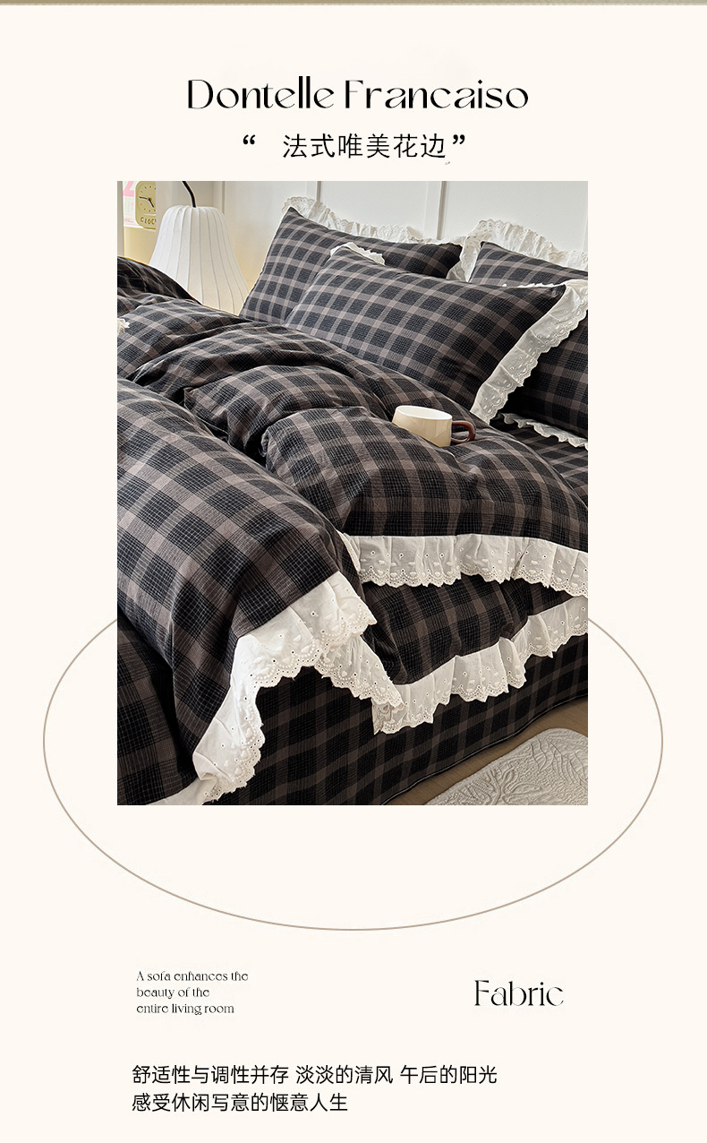 (总)花香四季家纺 2026全棉色织水洗棉法式公主风花边床单款床笠款四件套,初见咖,高智黑,米兰红,南初咖,云漫黑
