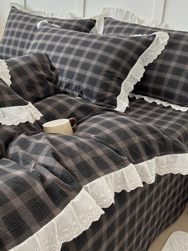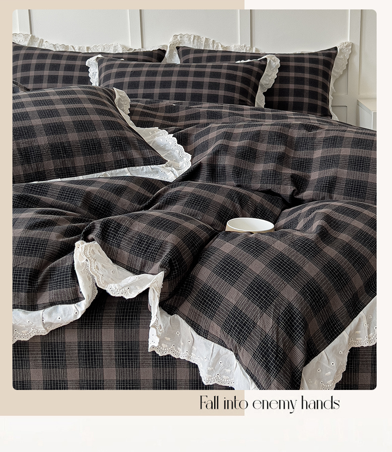 花香四季家纺 2026全棉色织水洗棉法式公主风花边床单款床笠款四件套 高智黑