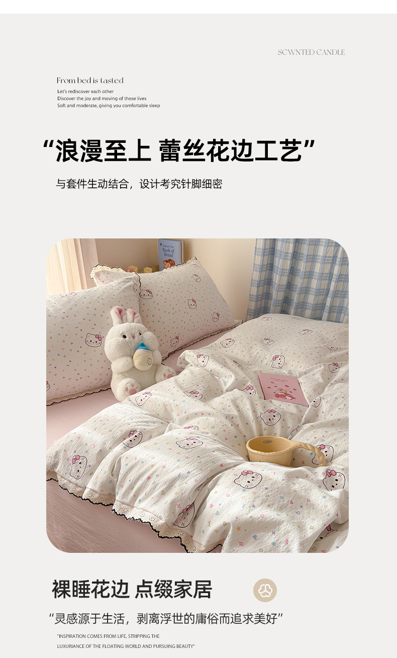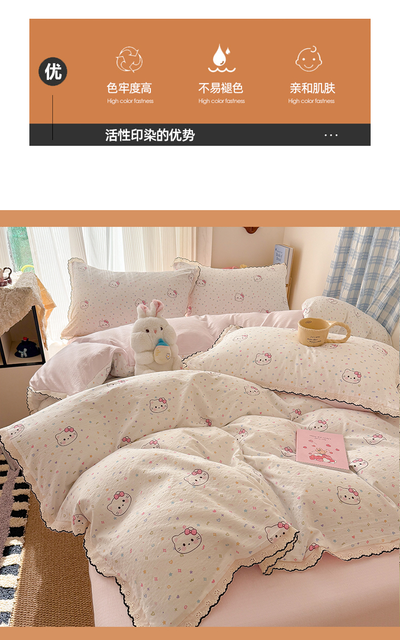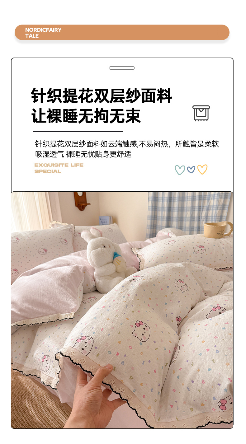 商品名称:温眠家纺 2026新款针织提花双层纱全棉蕾丝花边四件套 甜心猫咪