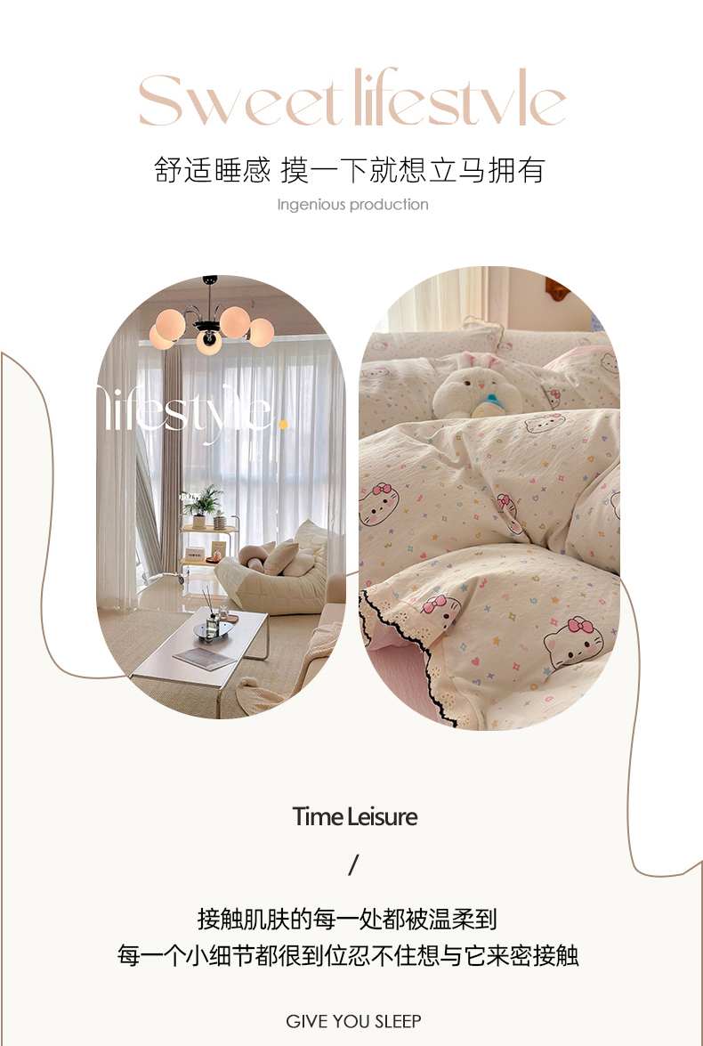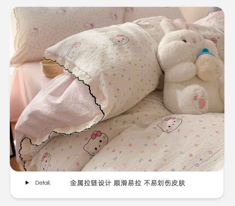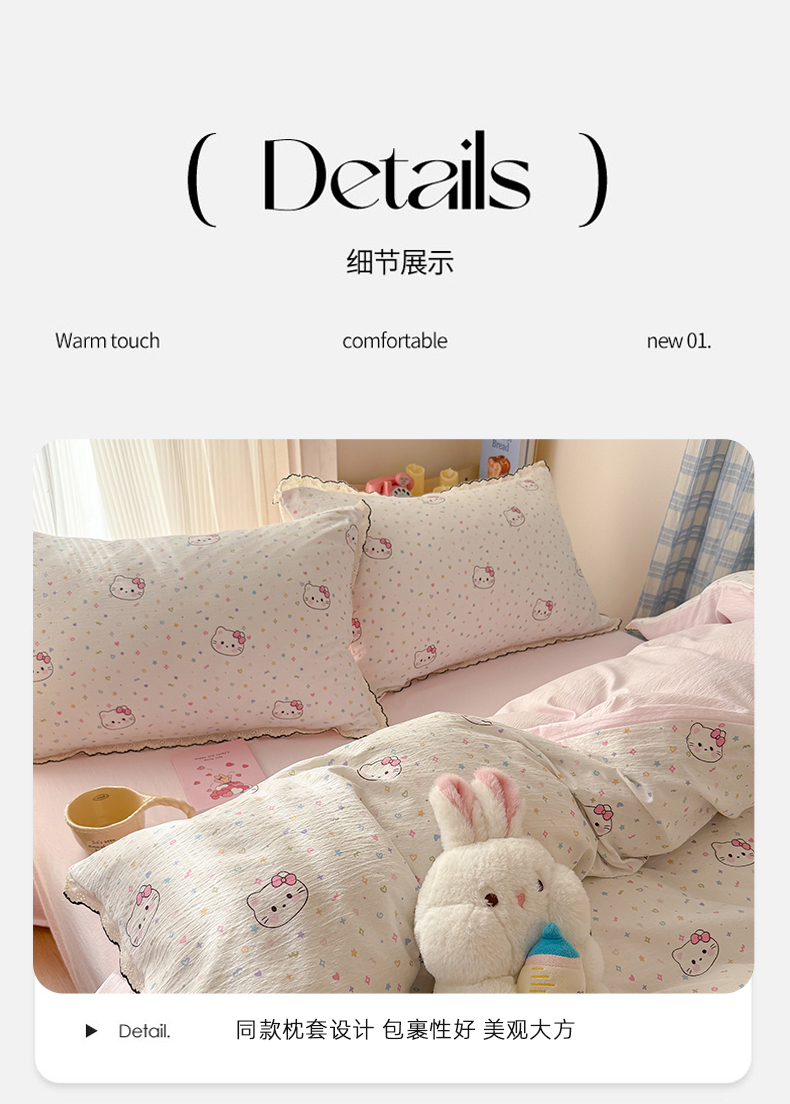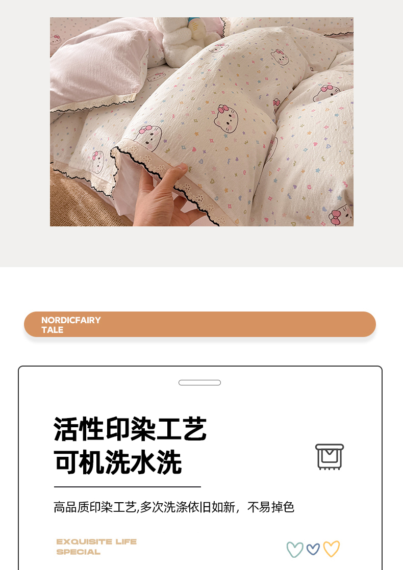 商品名称:温眠家纺 2026新款针织提花双层纱全棉蕾丝花边四件套 甜心猫咪