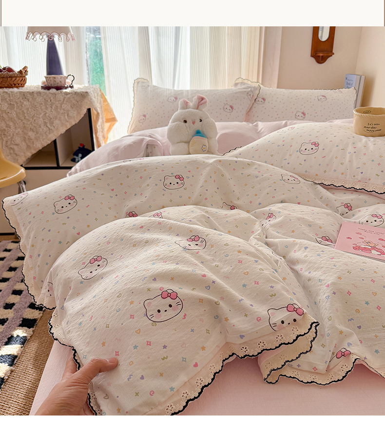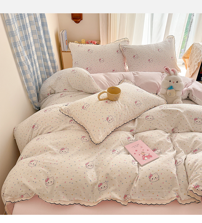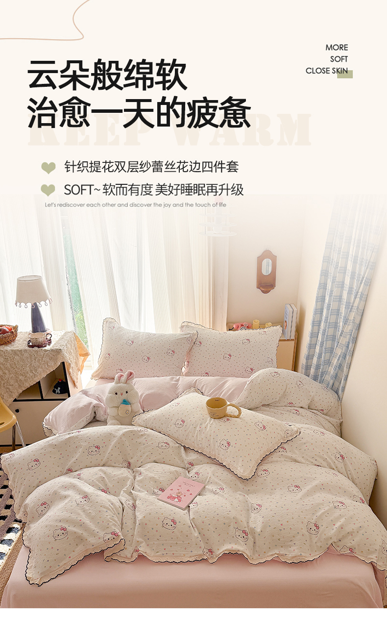 温眠家纺 2026新款针织提花双层纱全棉蕾丝花边四件套 甜心猫咪