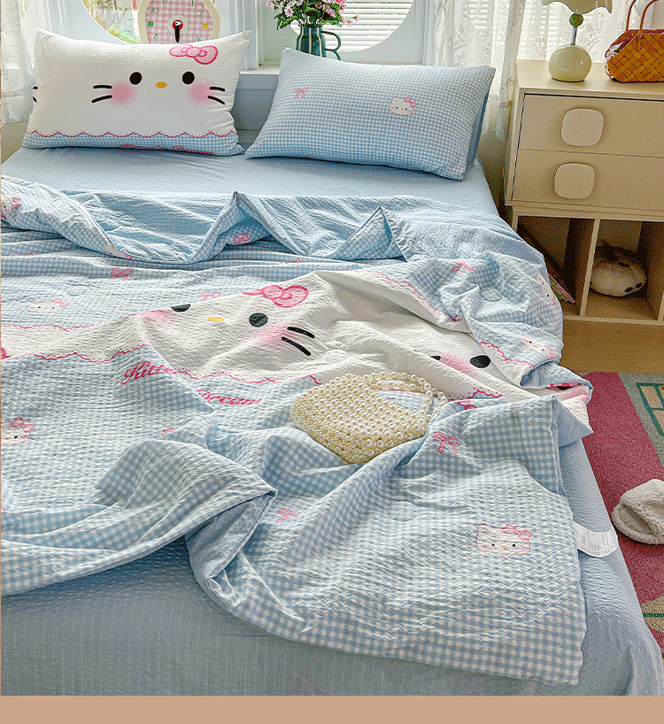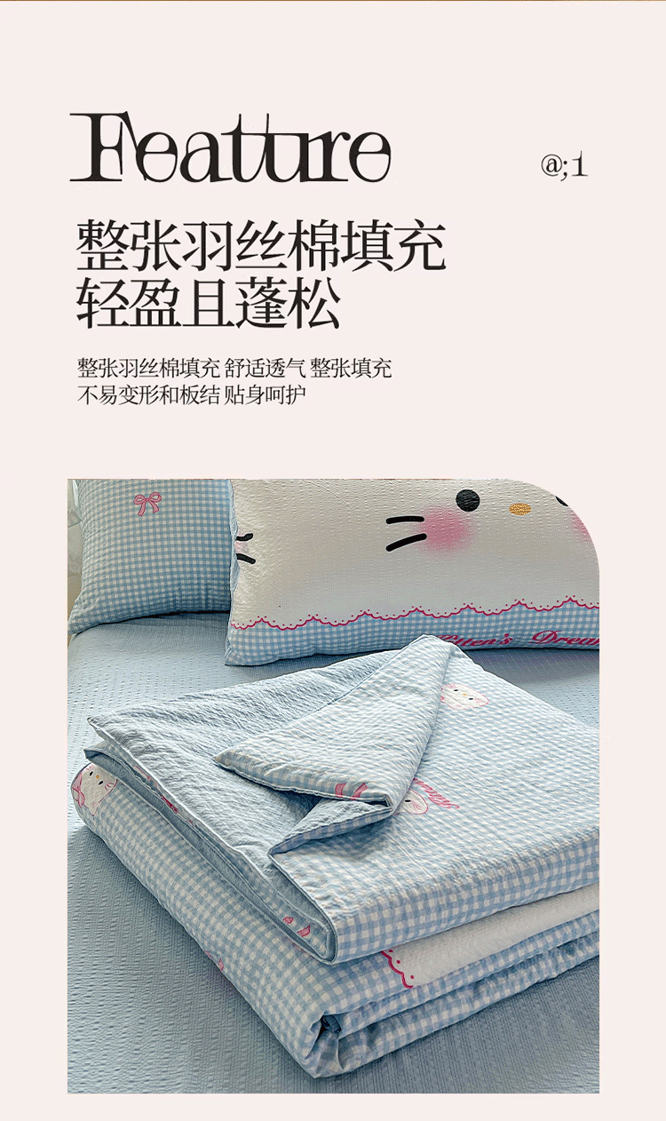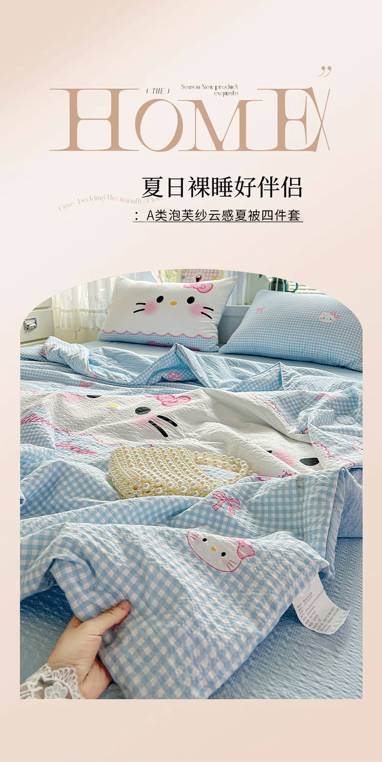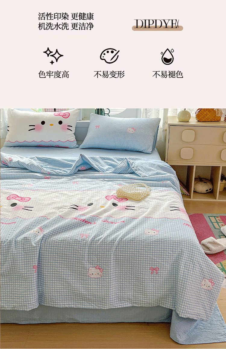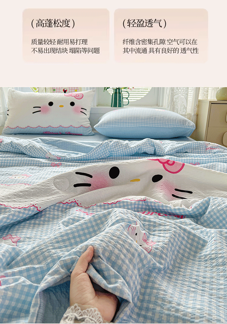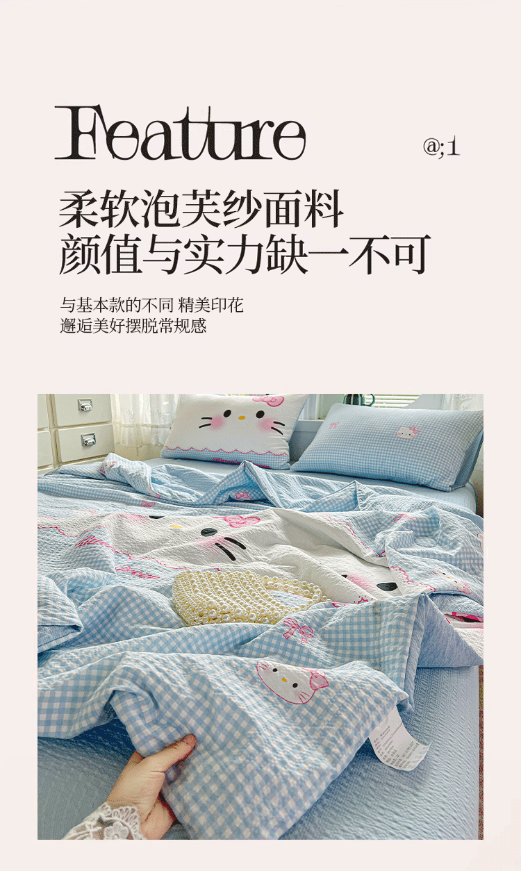 商品名称:小桃姐家纺 2026新款泡芙棉双层纱夏被空调被四件套小清新泡泡纱夏被卡通夏凉被空调被 蓝格Kitty