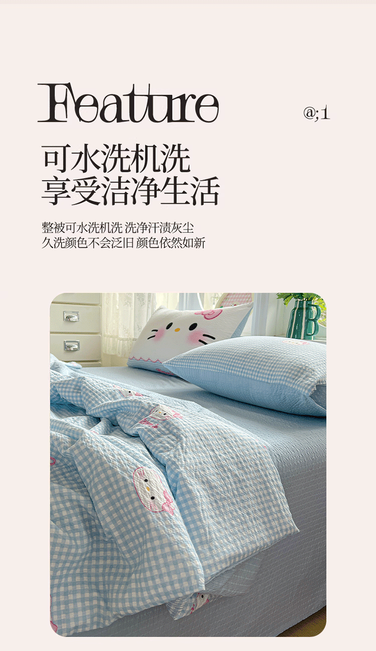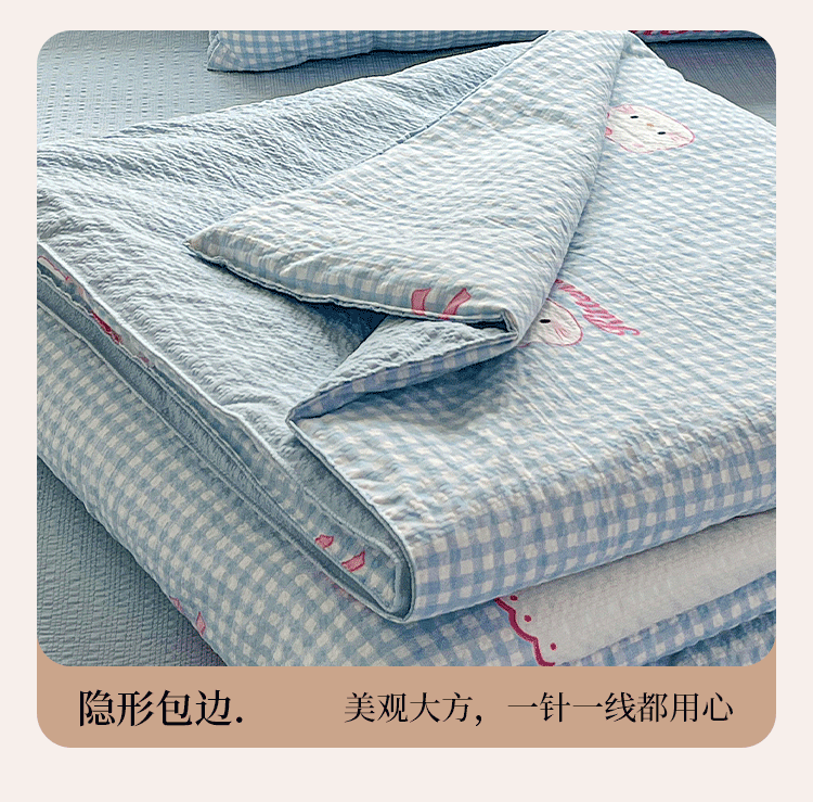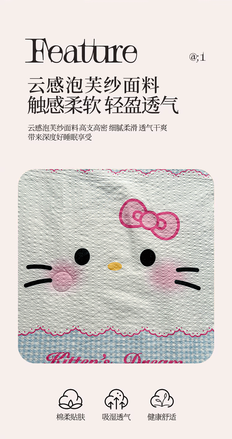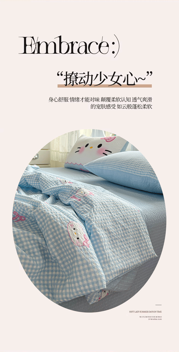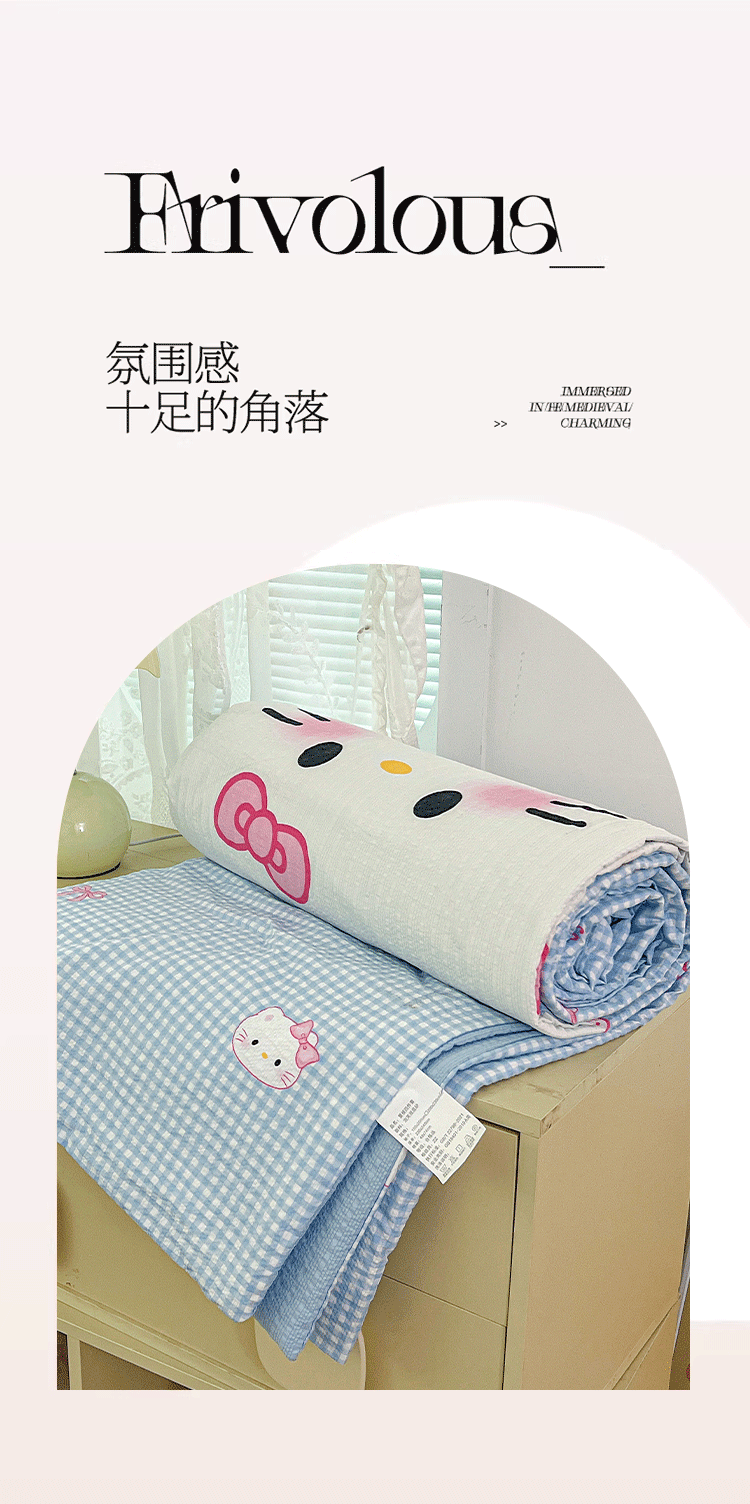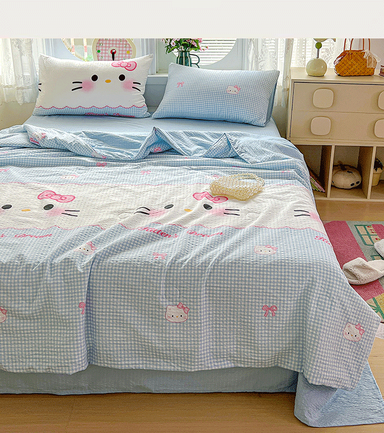 商品名称:小桃姐家纺 2026新款泡芙棉双层纱夏被空调被四件套小清新泡泡纱夏被卡通夏凉被空调被 蓝格Kitty