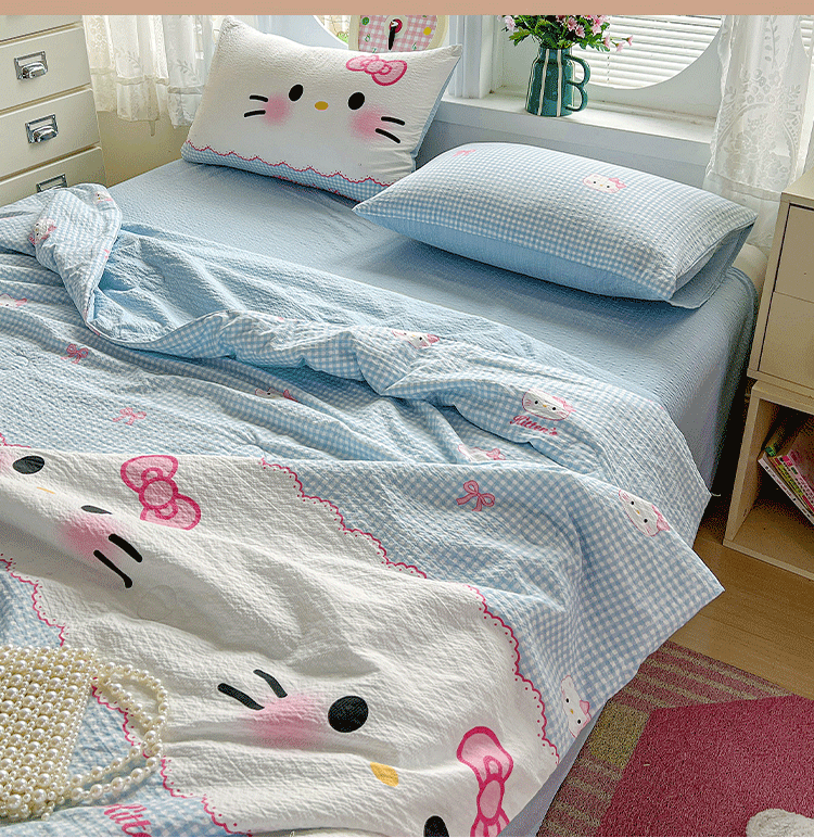 被子 > 夏被 > 小桃姐家纺 2026新款泡芙棉双层纱夏被空调被四件套小清新泡泡纱夏被卡通夏凉被空调被 蓝格Kitty