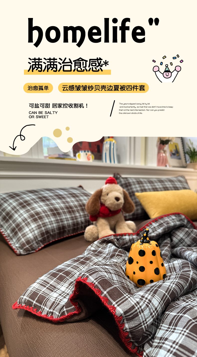 商品名称:水墨江南 2026新款云感皱皱纱贝壳边夏被四件套 夏被-布朗尼咖