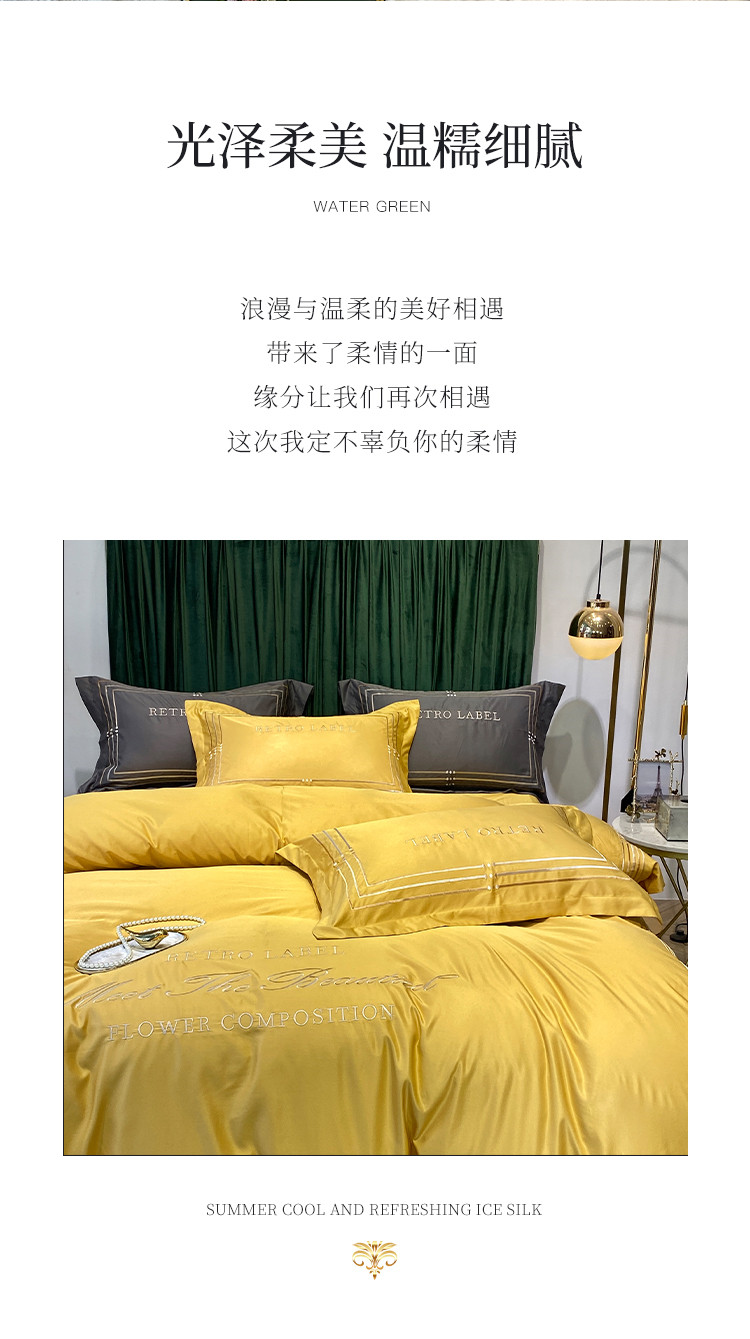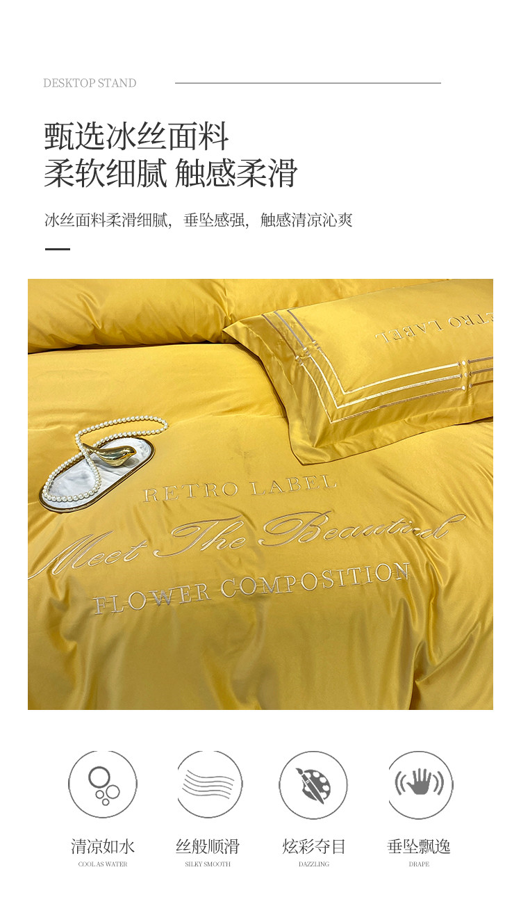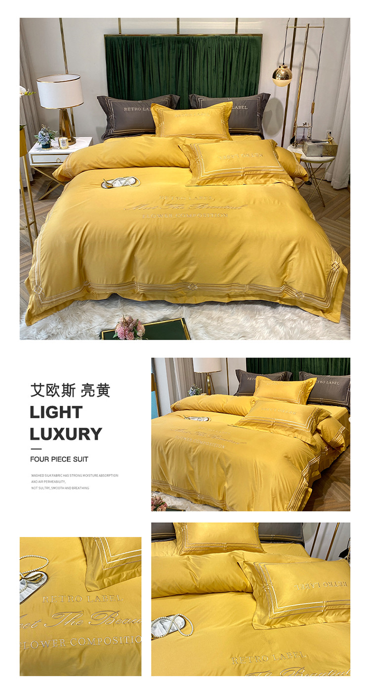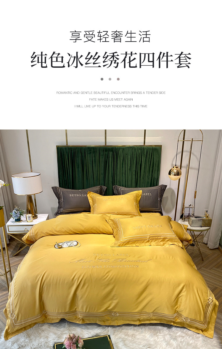 理想家 2020新款纯色冰丝绣花四件套艾欧斯系列 亮黄