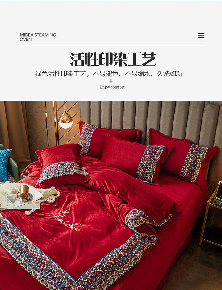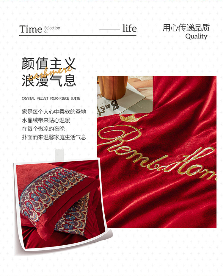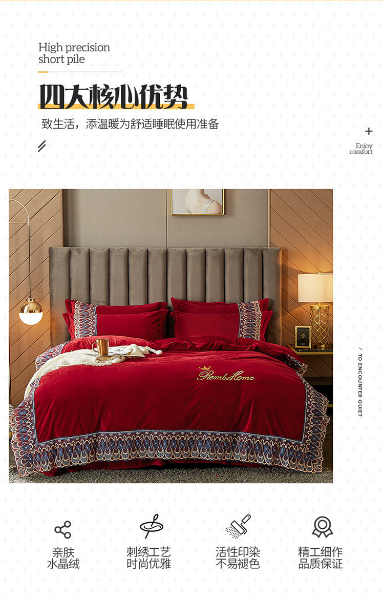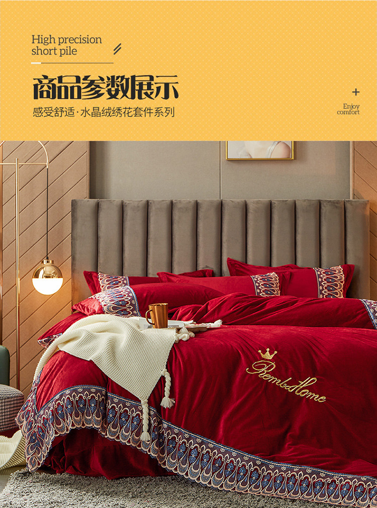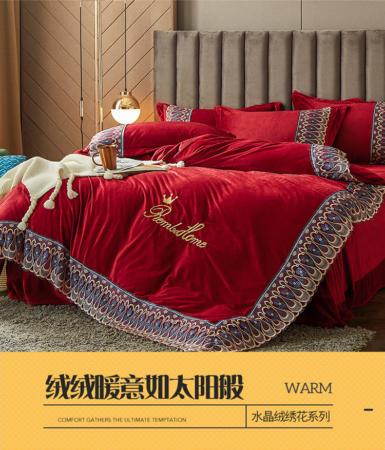 商品名称:金米诺爆款公主风工艺款纯色加厚水晶绒绣花四件套赫拉之恋-酒红