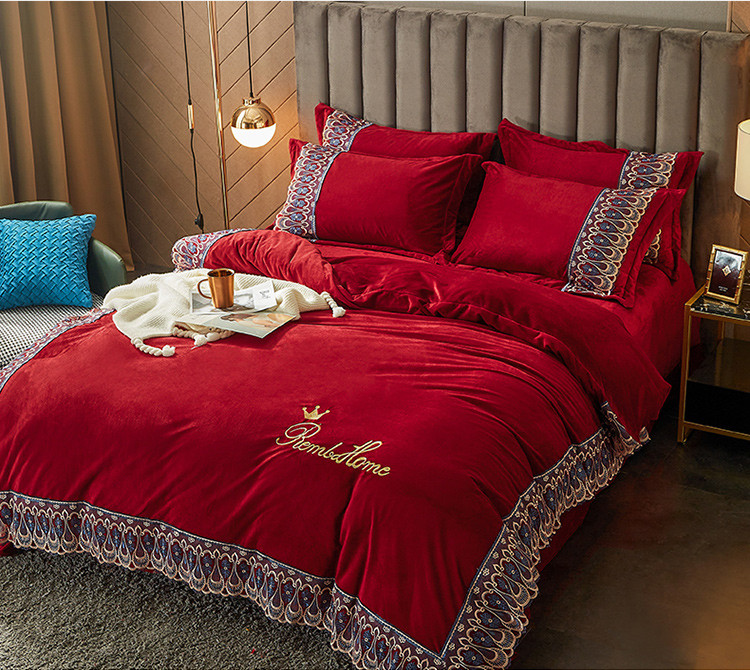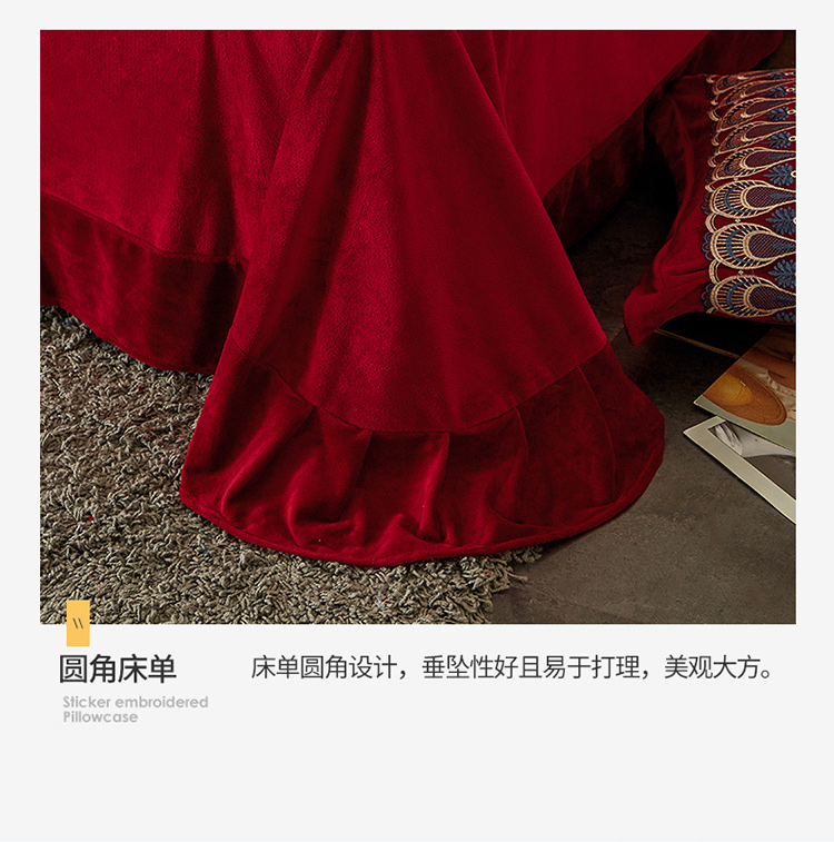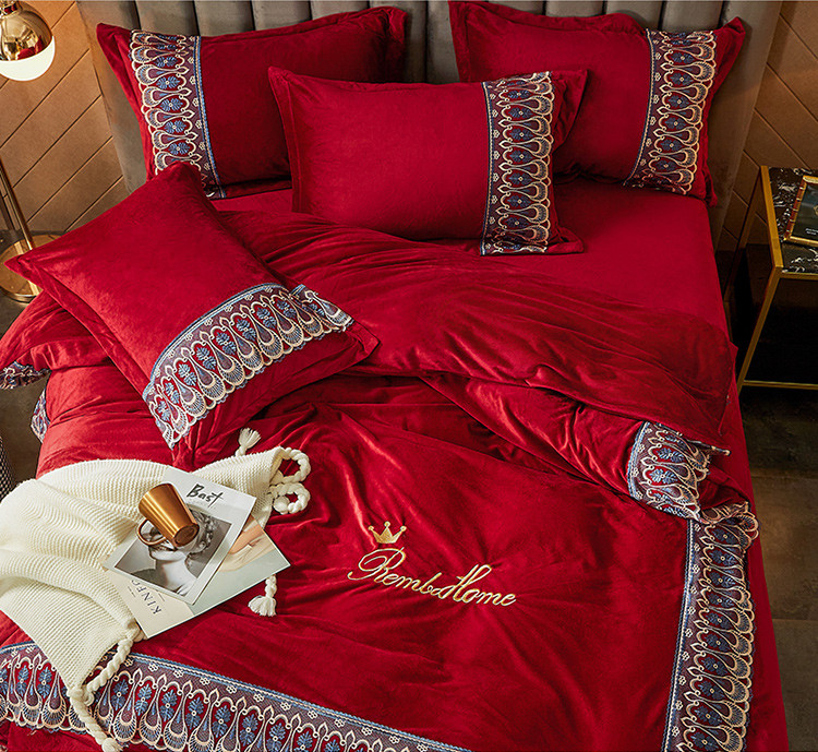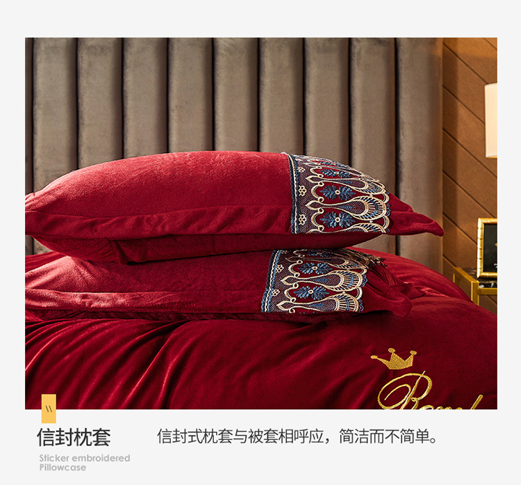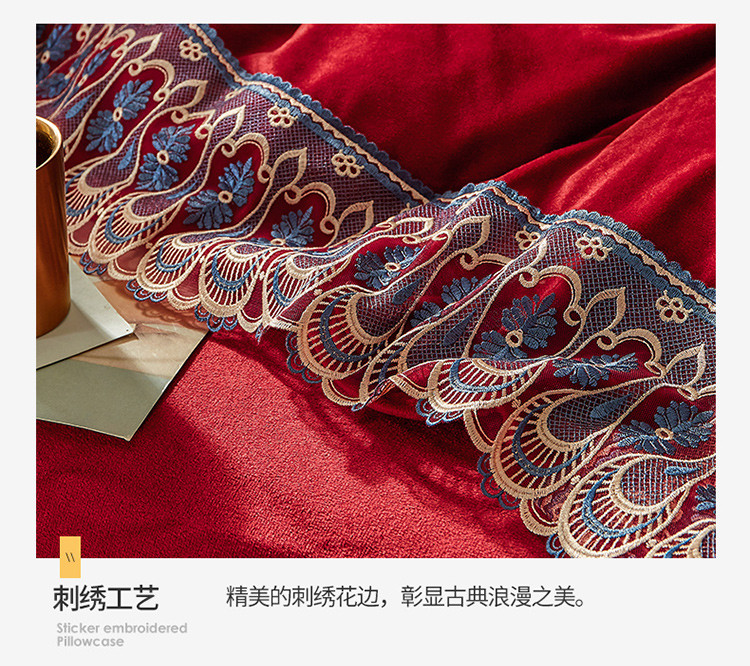金米诺爆款公主风工艺款纯色加厚水晶绒绣花四件套赫拉之恋-酒红