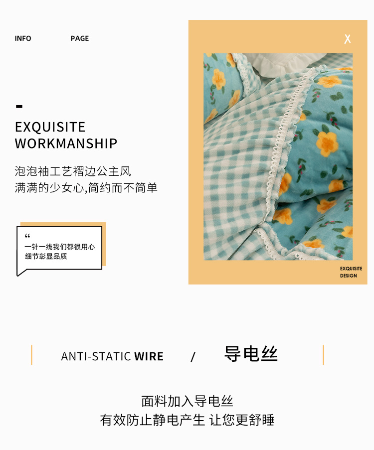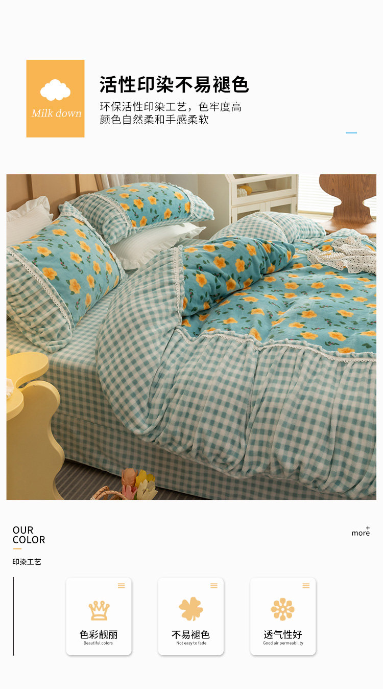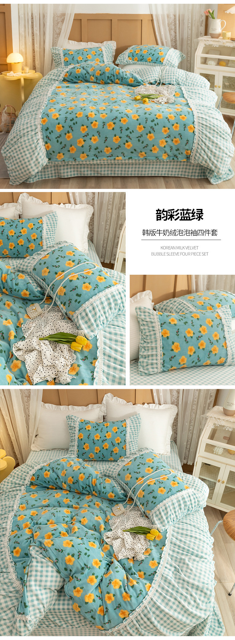 金爱家 2021新款直播热卖牛奶绒220g泡泡袖四件套 韵彩蓝绿