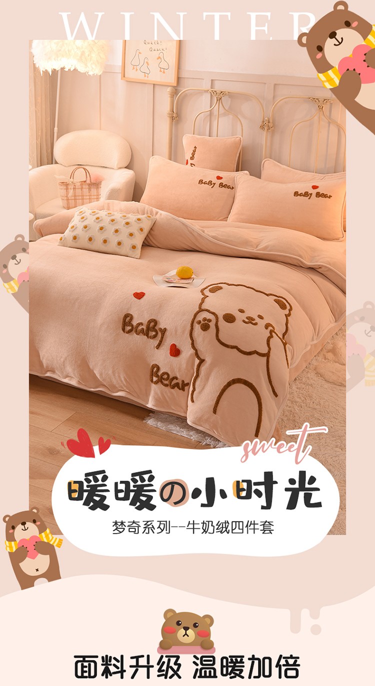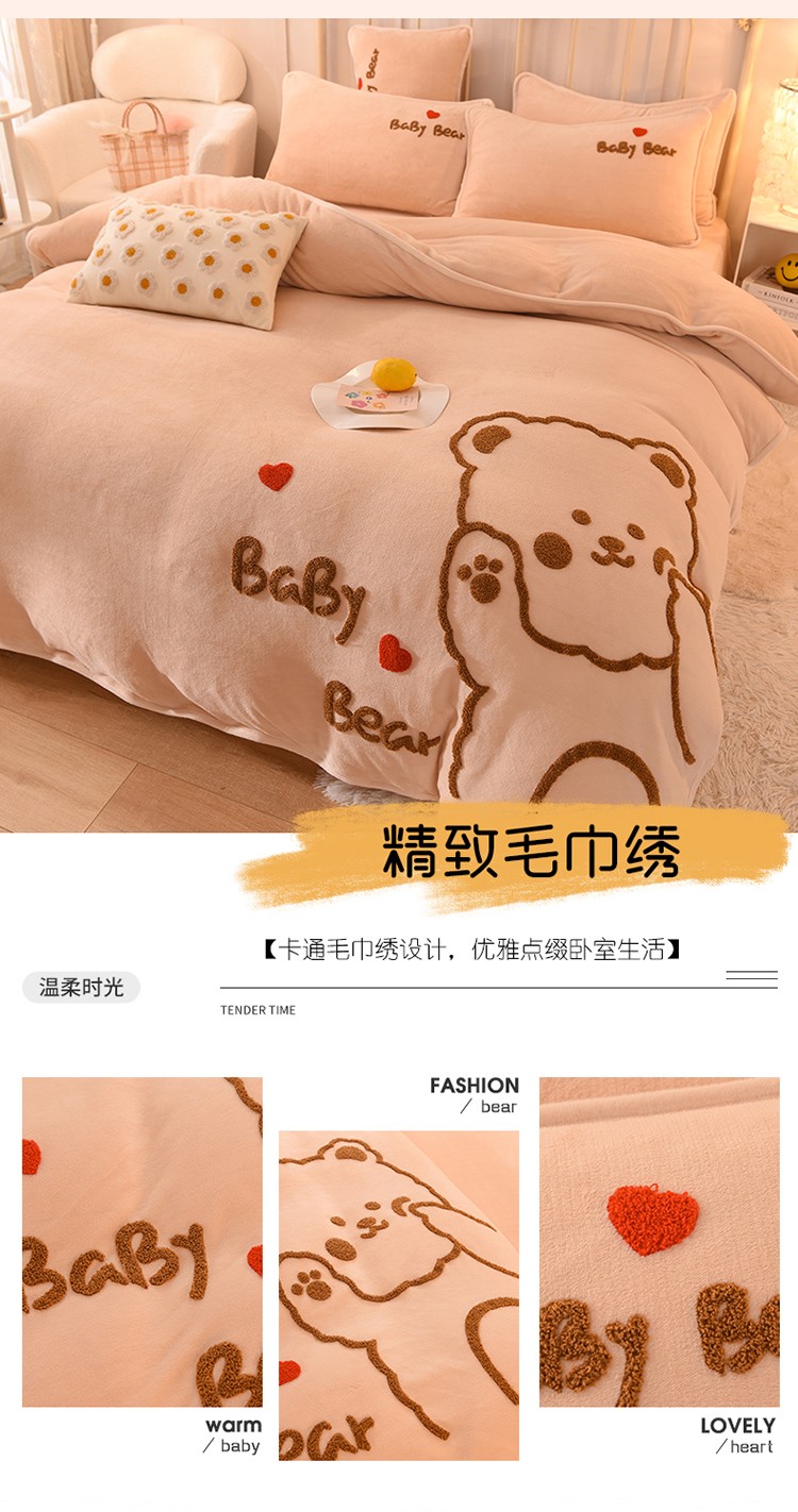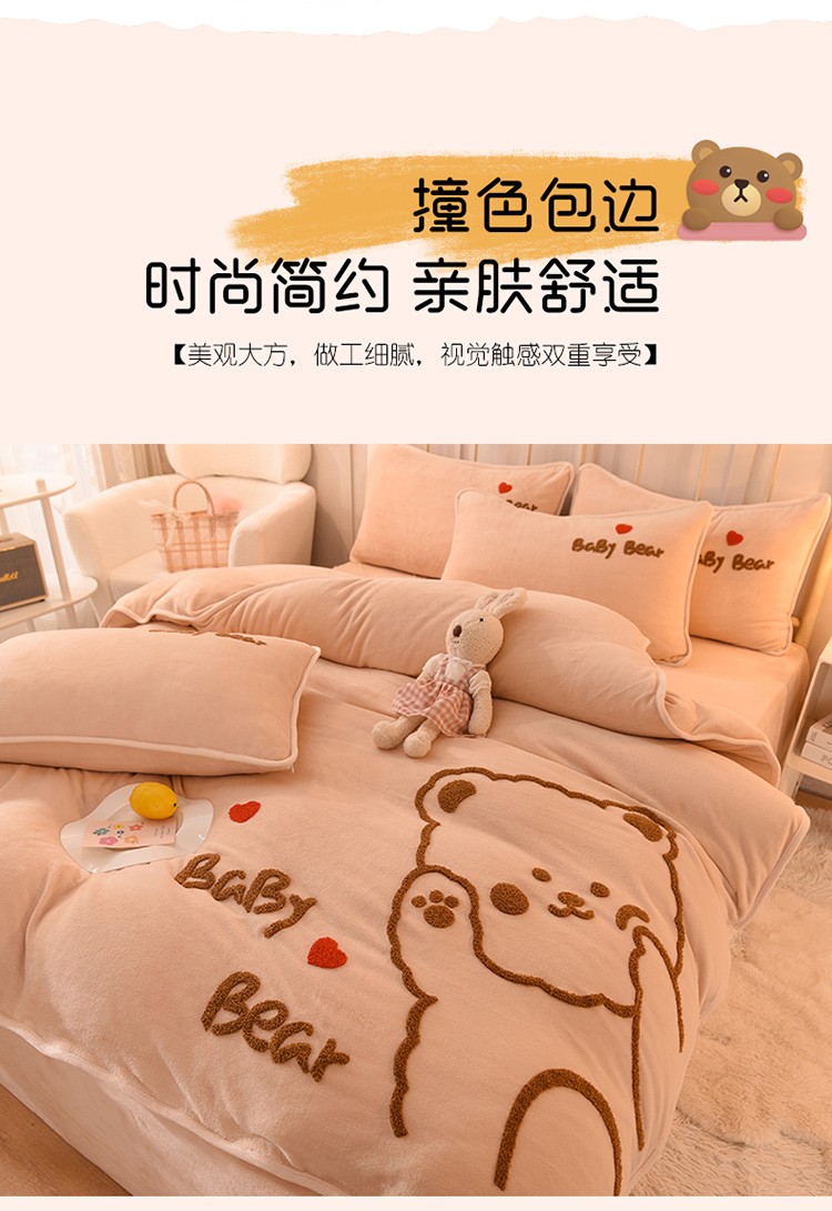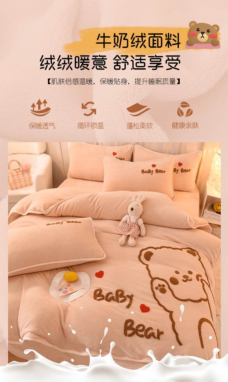 大米家居2023新款卡通毛巾绣牛奶绒宝宝绒四件套梦奇卡其驼
