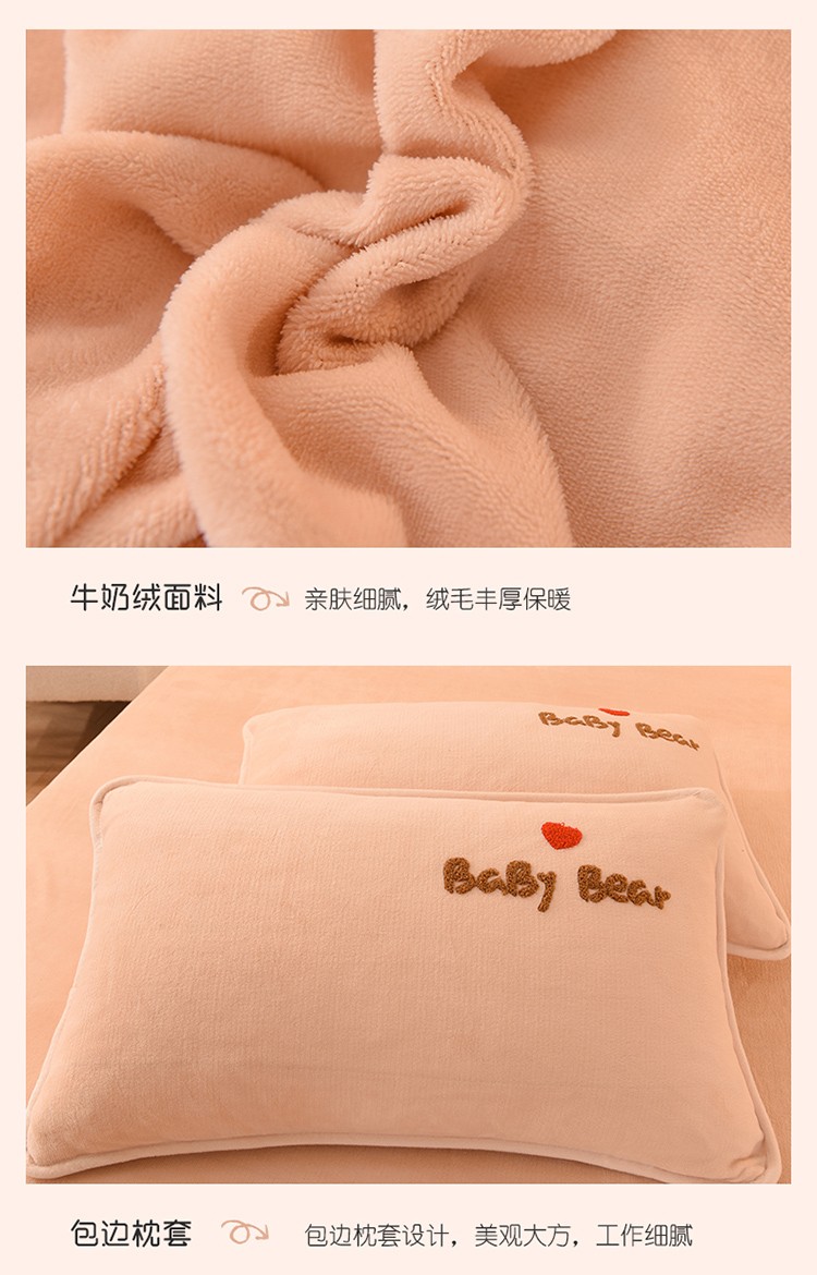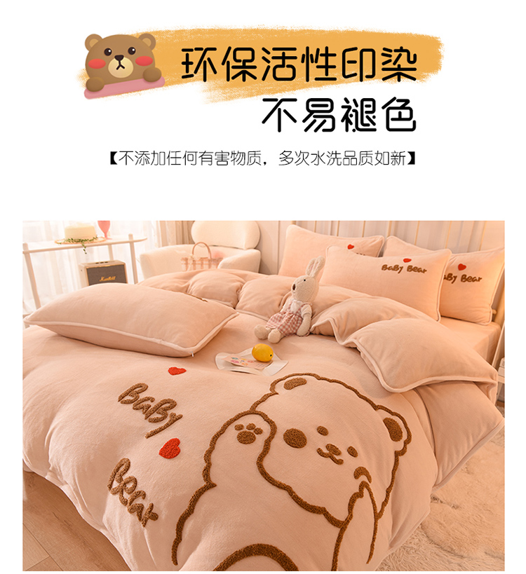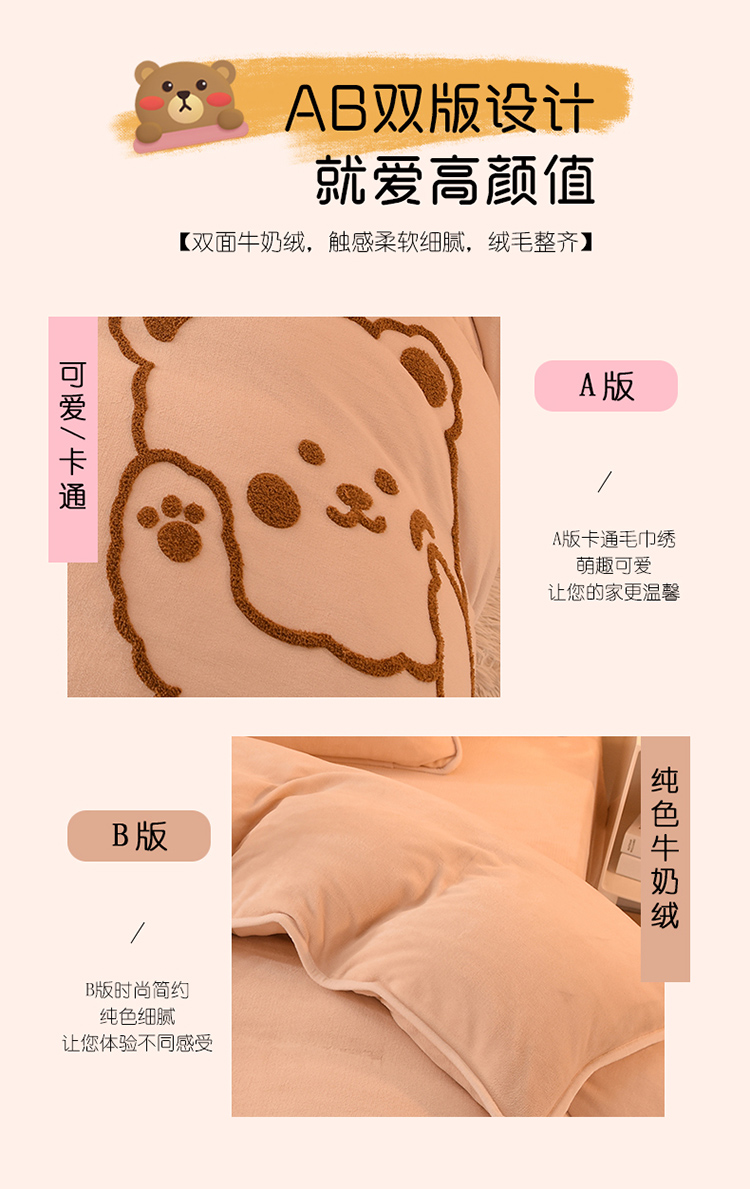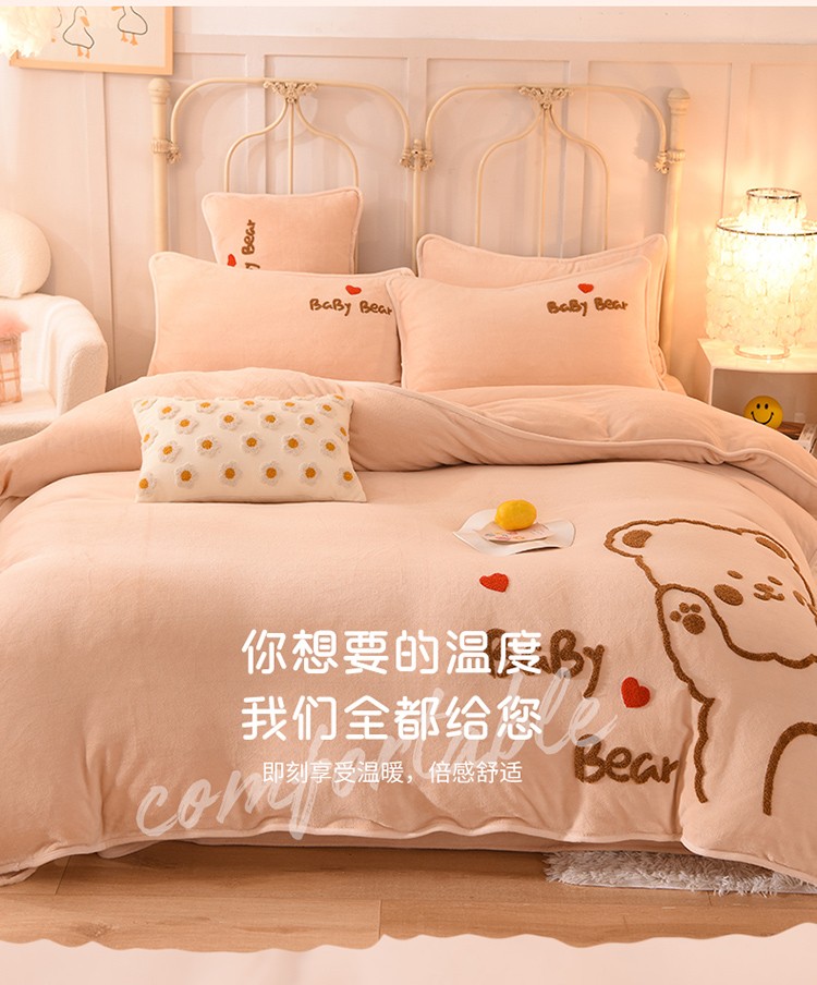 大米家居2023新款卡通毛巾绣牛奶绒宝宝绒四件套梦奇卡其驼
