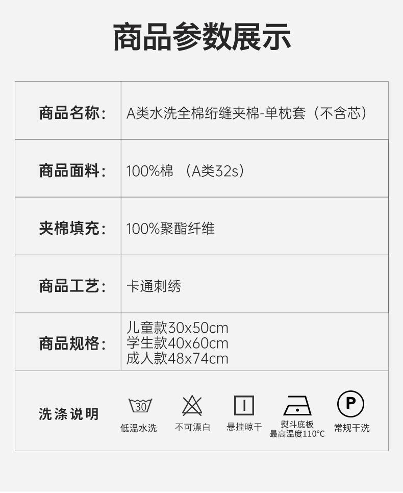 商品名称:(总)昕科 2025新款单品】A类水洗全棉绗缝夹棉--单枕套-色织水洗棉刺绣卡通纯棉儿童幼儿园枕套学生单枕套枕芯枕套枕头