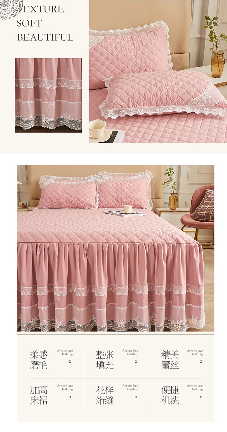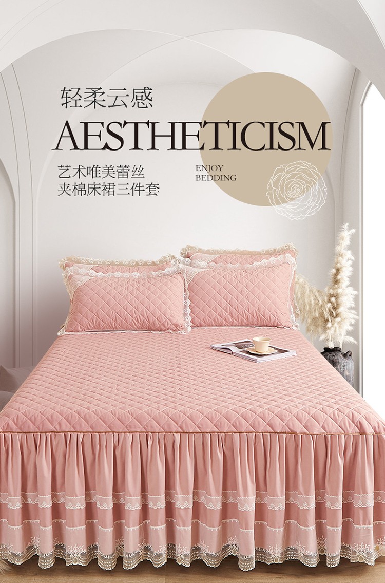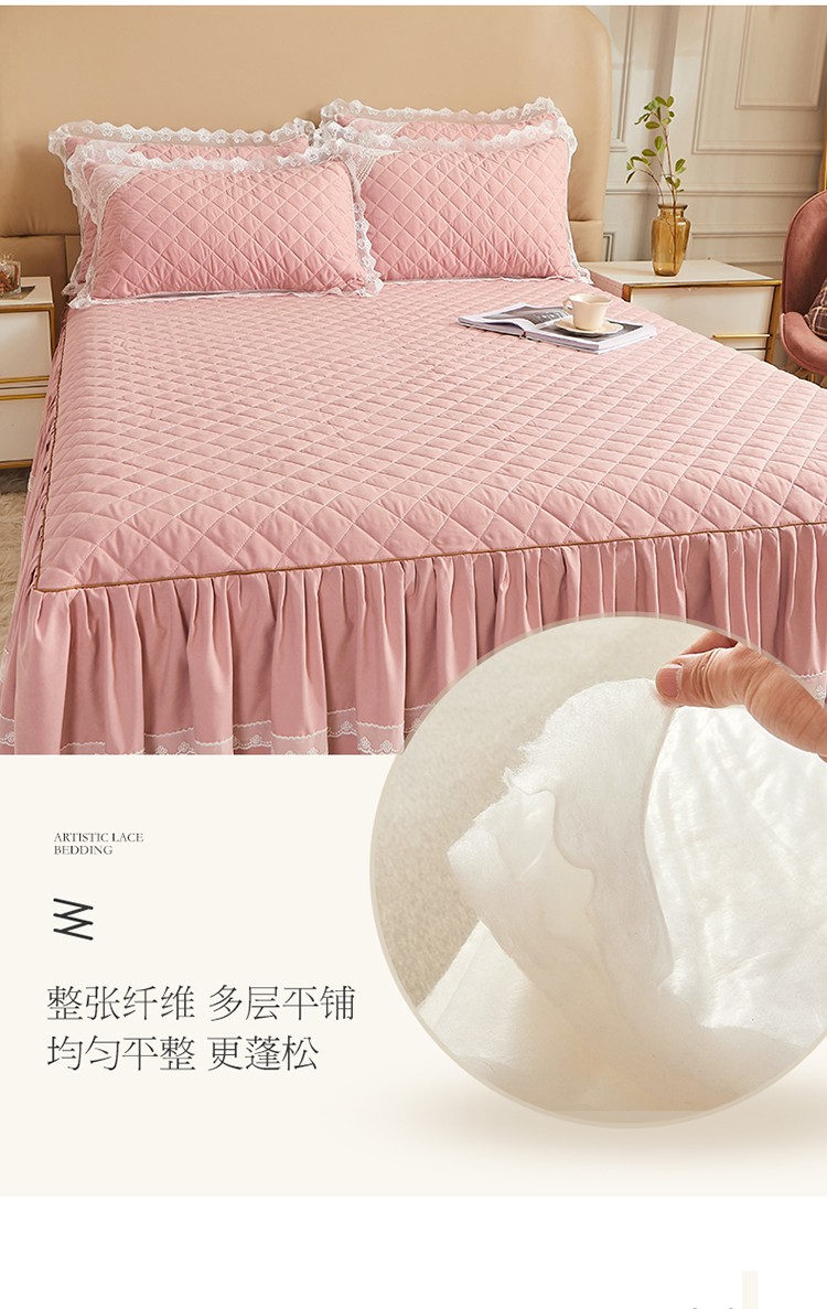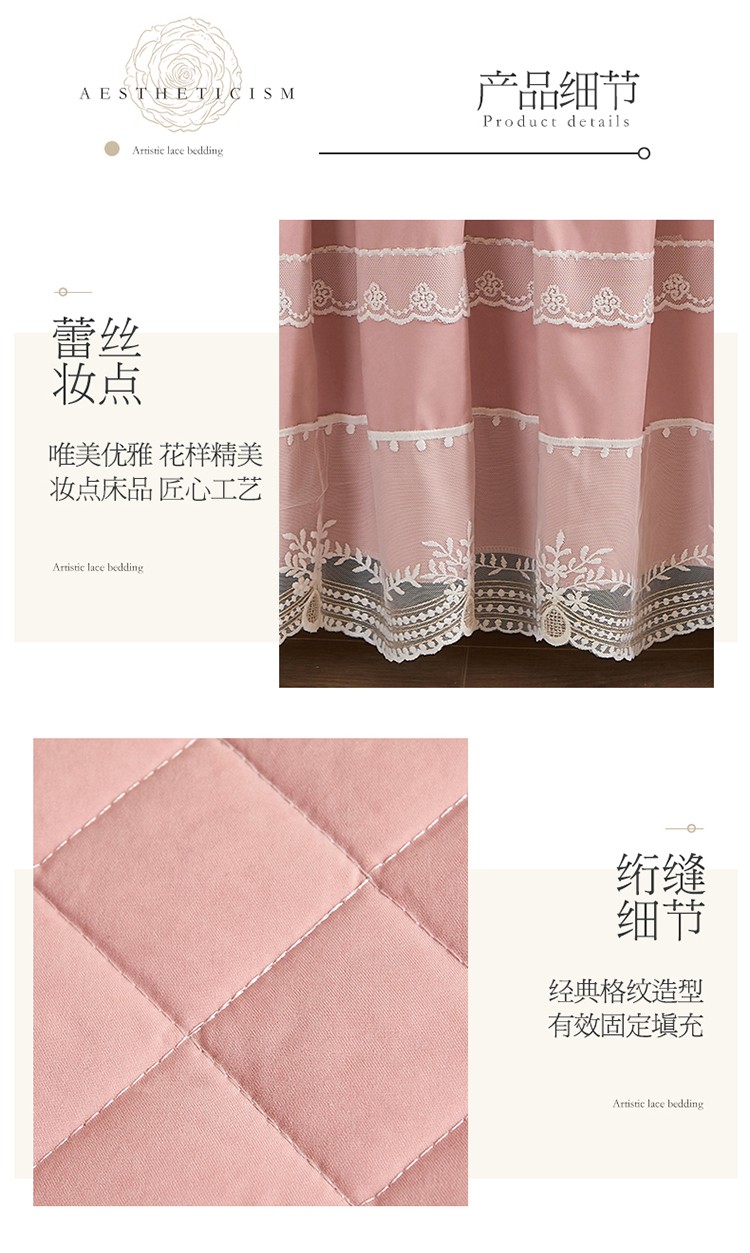 商品名称:网红馆 2025新款唯美蕾丝夹棉床裙三件套婉约佳人 桃花粉