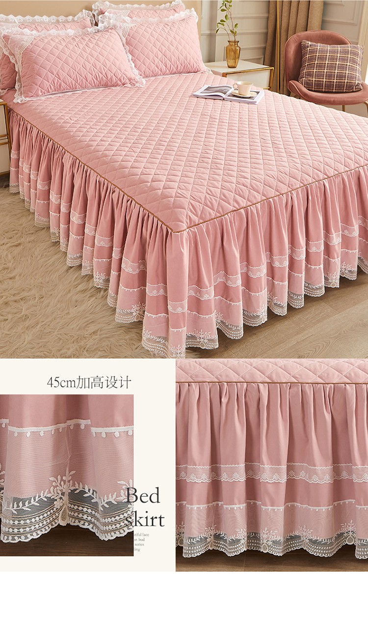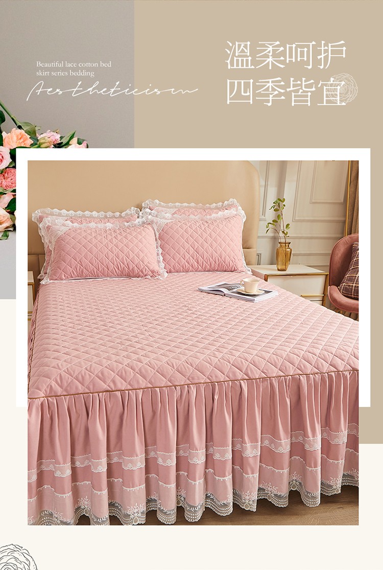 网红馆 2025新款唯美蕾丝夹棉床裙三件套婉约佳人 桃花粉