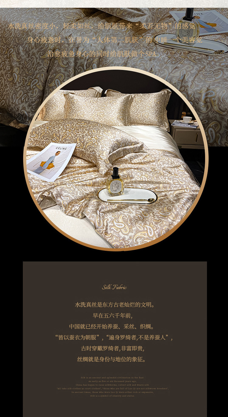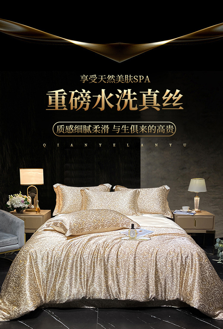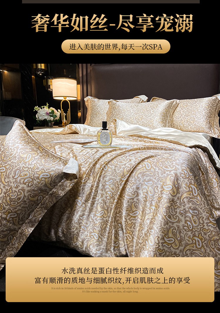 商品名称:黄鹂鸟 2025新款高端轻奢丝滑裸睡丝绸数码印花水洗真丝天丝四件套系列 -风格二 腰果米