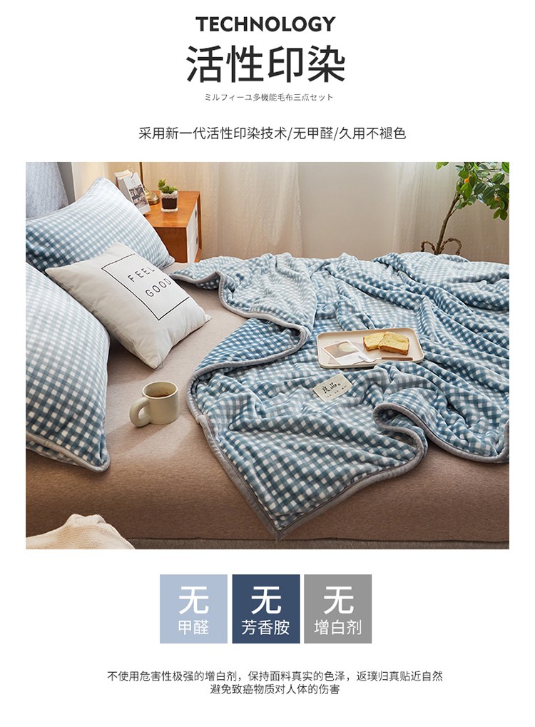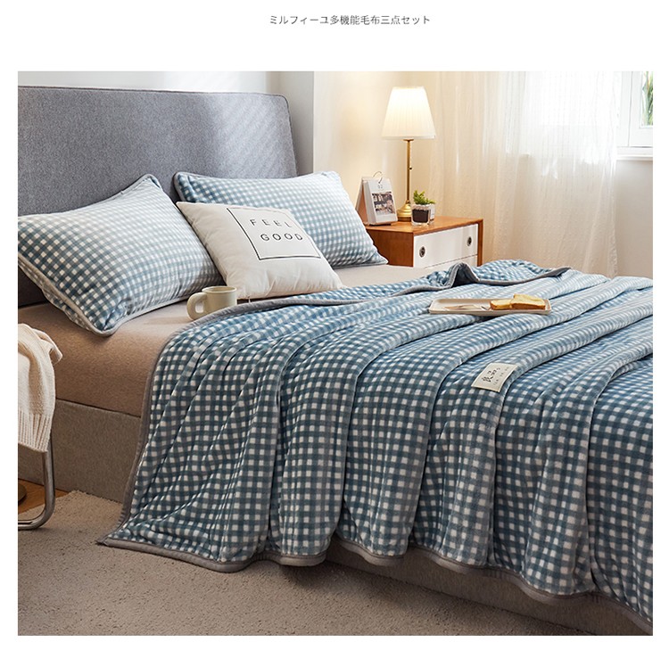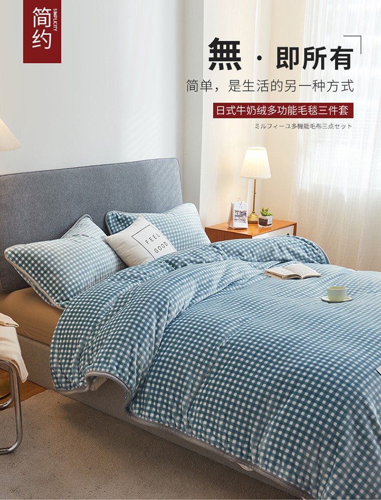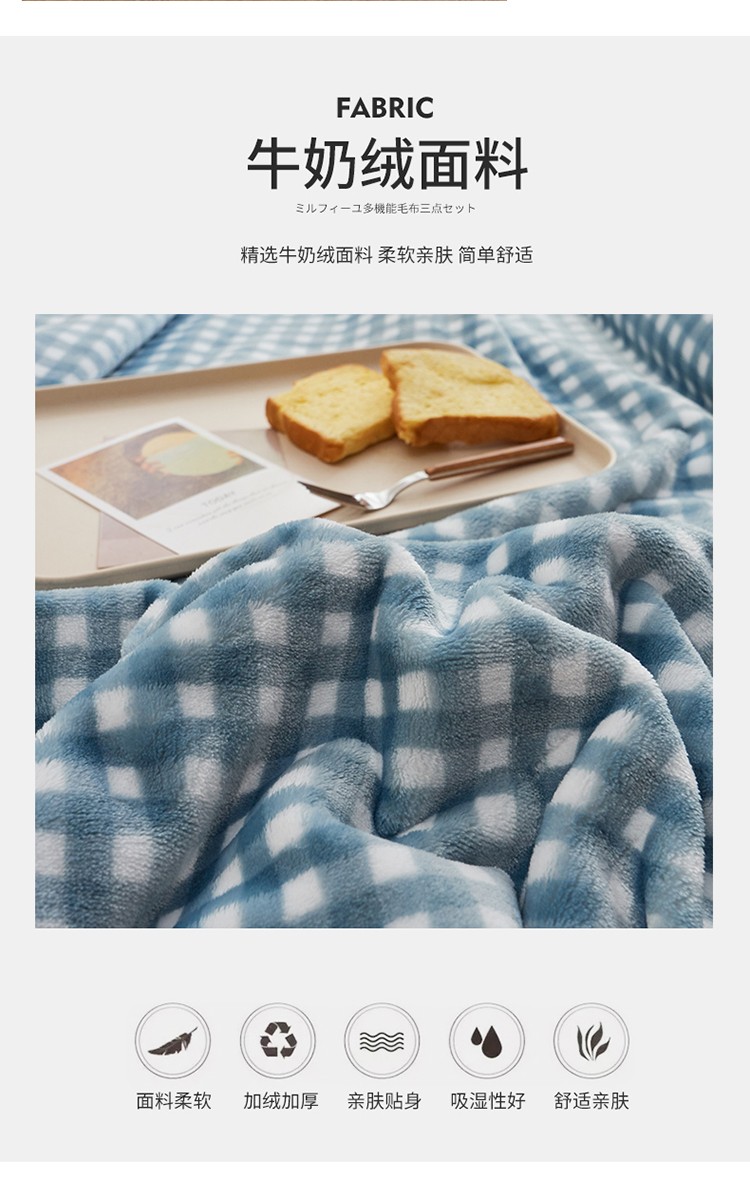 当前位置: 91家纺网 > 商品网购 > 床品套件 > 三件套 > 丝幔 2025新款日式牛奶绒多功能毛毯三件套 蓝小格