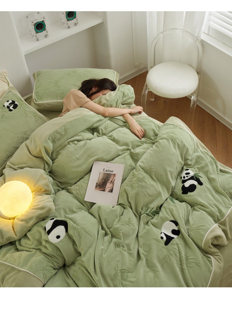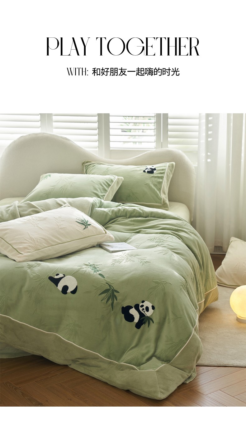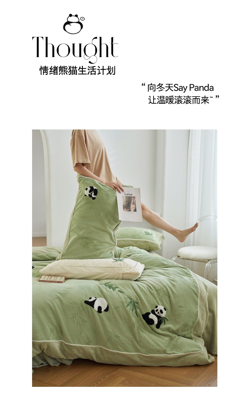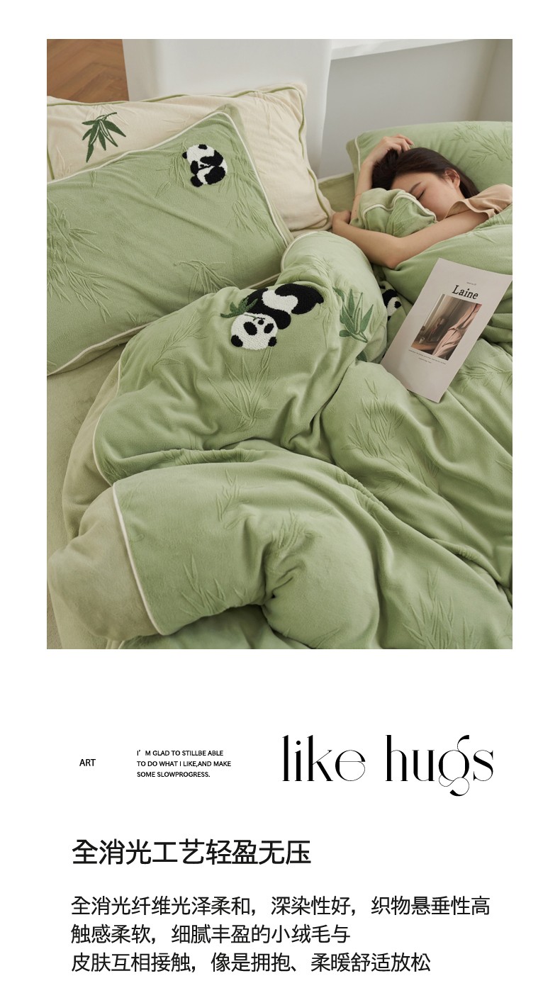 2022锦芙牛奶绒250克全消光绣花四件套,情绪熊猫-绿竹