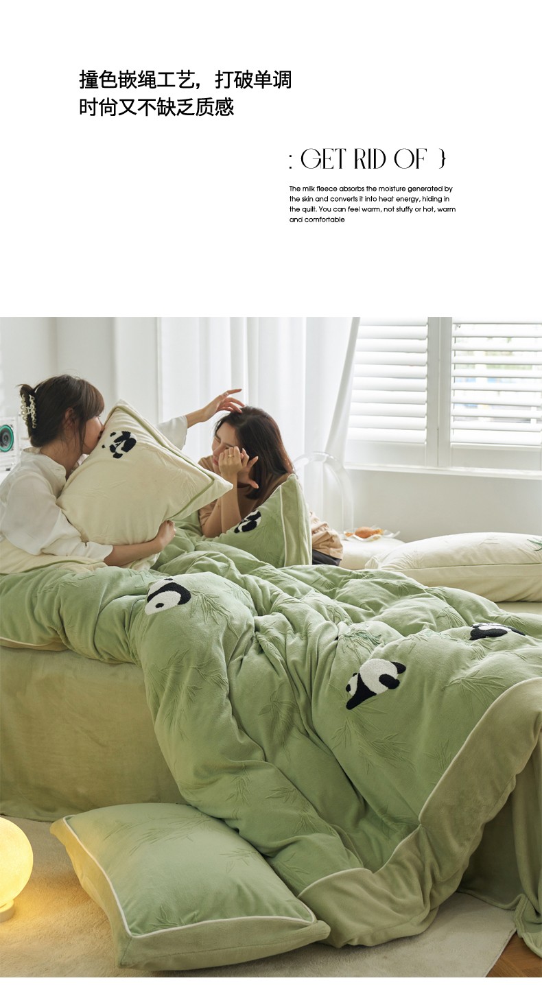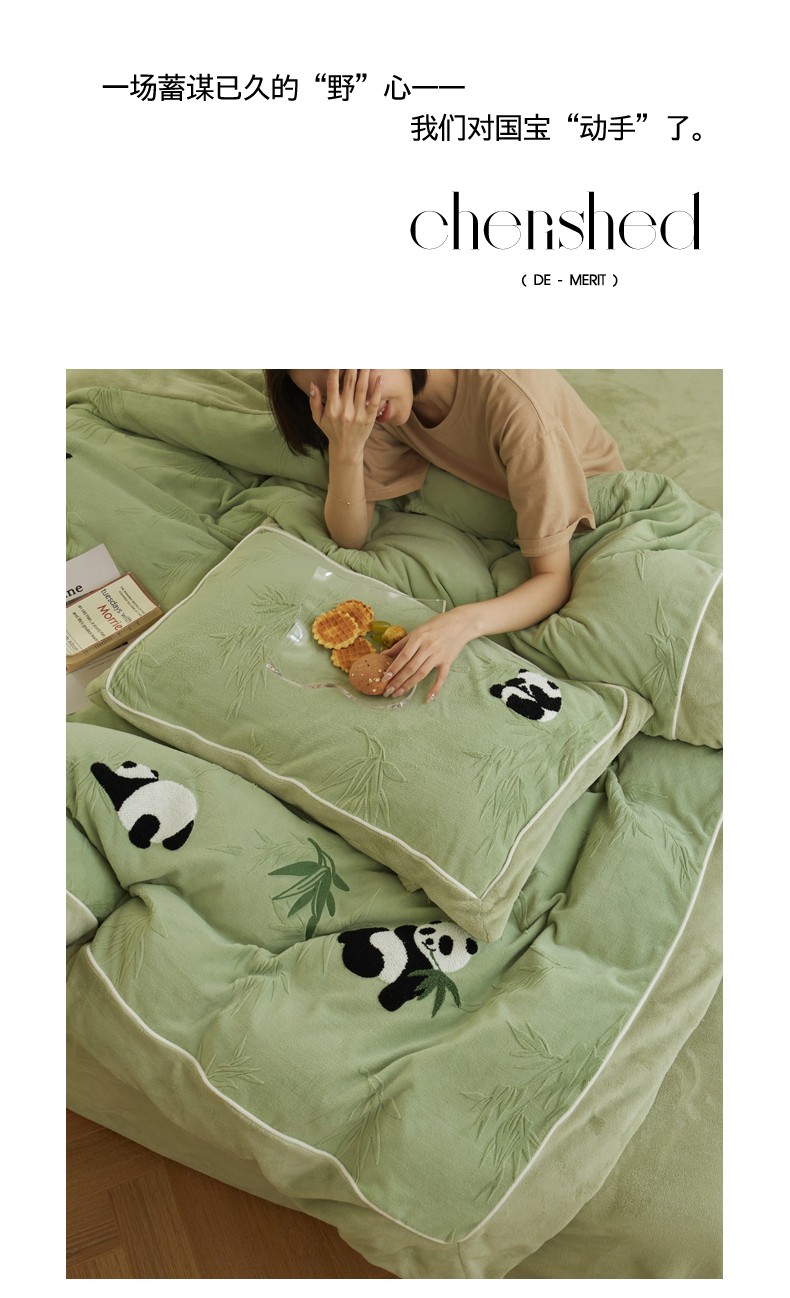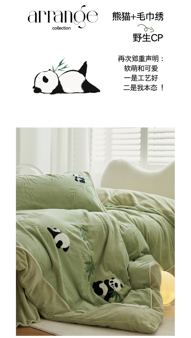 2022锦芙牛奶绒250克全消光绣花四件套,情绪熊猫-绿竹