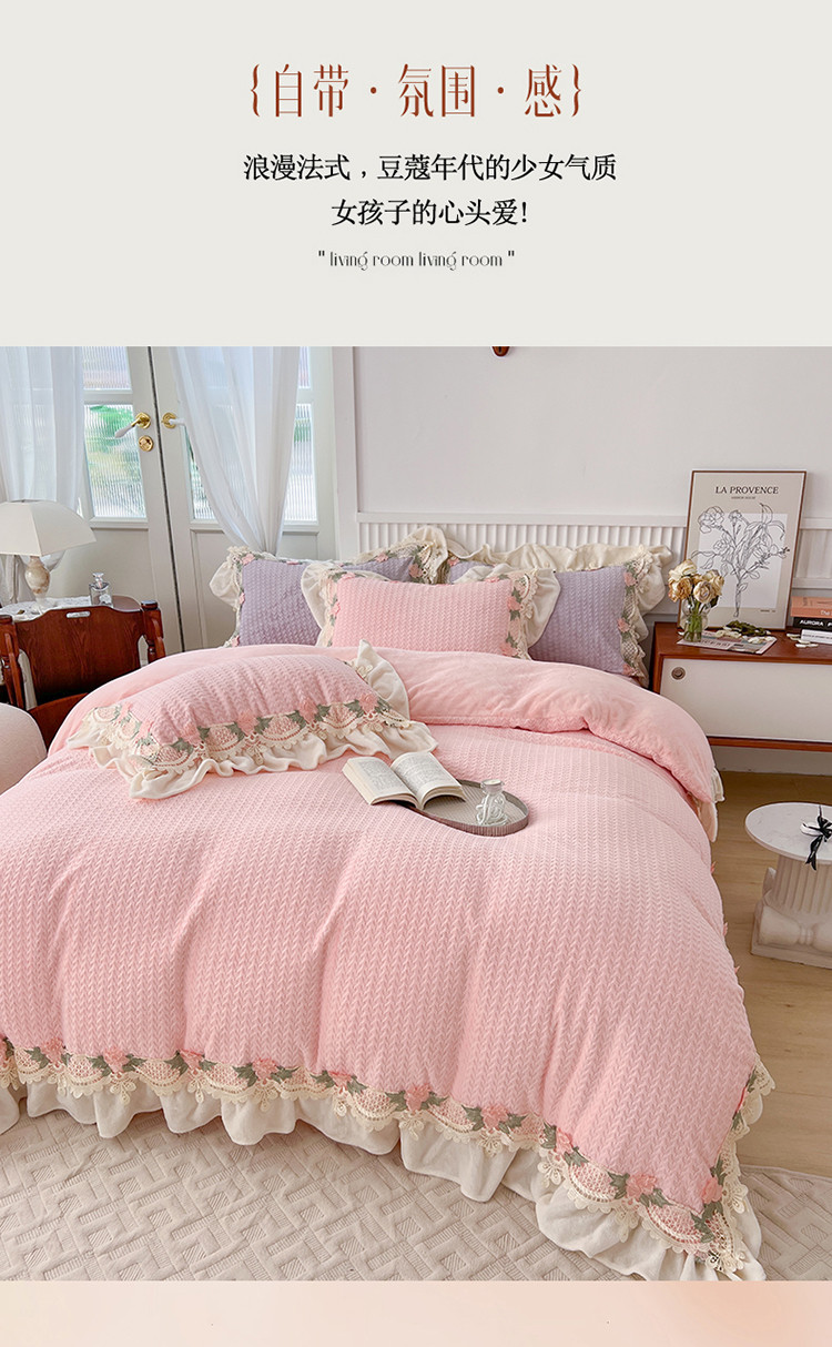 商品名称:玛奇朵 高定蕾丝边全消光云芙暖绒四件套-唯 一(场景2) 唯一-粉