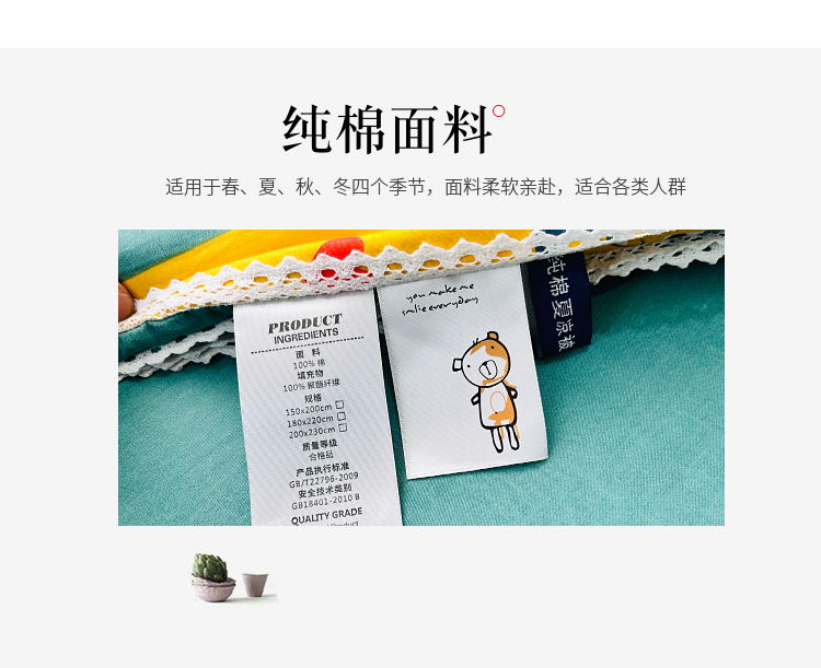 1、通州区市场监督局川姜分局提醒各电商,在纯棉产品中不要宣传100%纯棉,因绣花线花边等材料不一定纯棉。乳胶枕不要宣传纯天然,因其加工过程含化工物质。