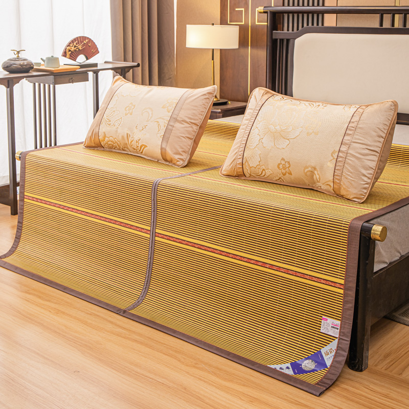 (总)新月家纺 2022新款冰藤席绣花款凉席套件,艾草 金色,艾草 咖色