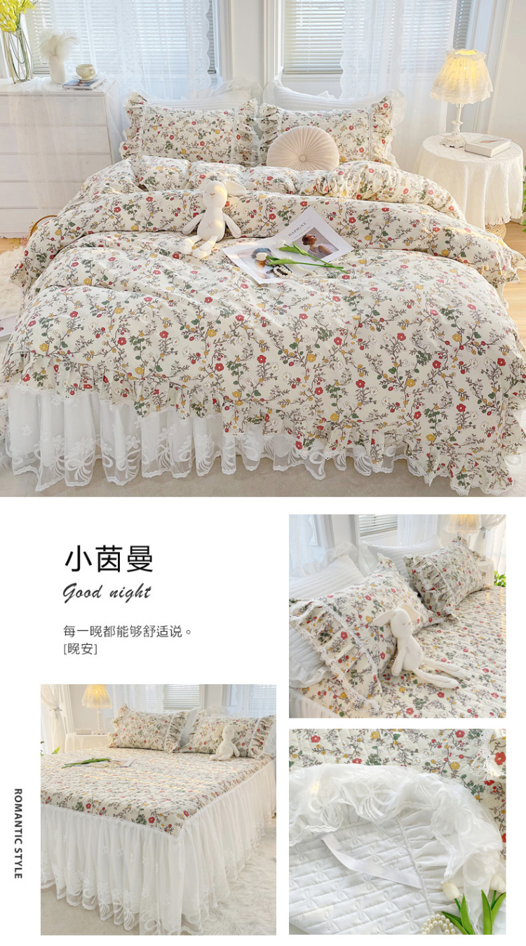 当前位置: 91家纺网 > 商品网购 > 床品套件 > 四件套 > 全棉普通四件套 > 菊上2023新款全棉-法式风蕾丝床裙四件套 6.小茵曼