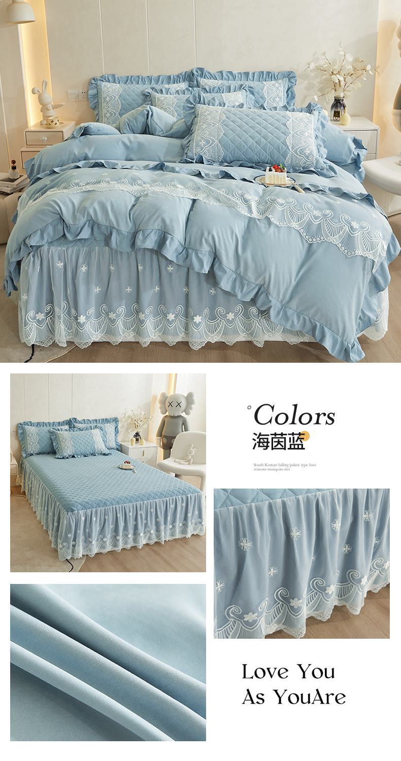 当前位置: 91家纺网 > 商品网购 > 床品套件 > 四件套 > 普通磨毛四件套 > 网红馆 2025新款亲肤蕾丝床裙四件套-梦想生活 海茵蓝