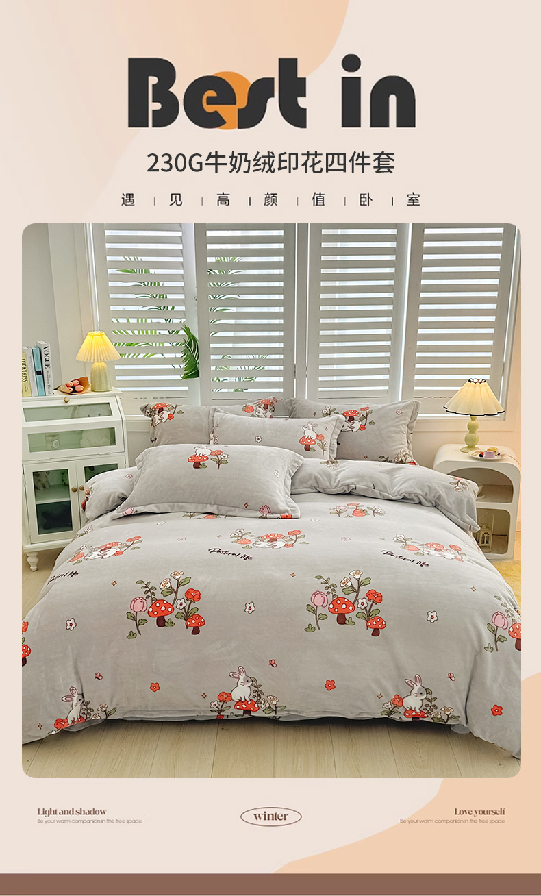 当前位置: 91家纺网 > 商品网购 > 床品套件 > 四件套 > 牛奶绒四件套 > 新款230克高克重印花牛奶绒四件套定做定制尺寸 温馨阁