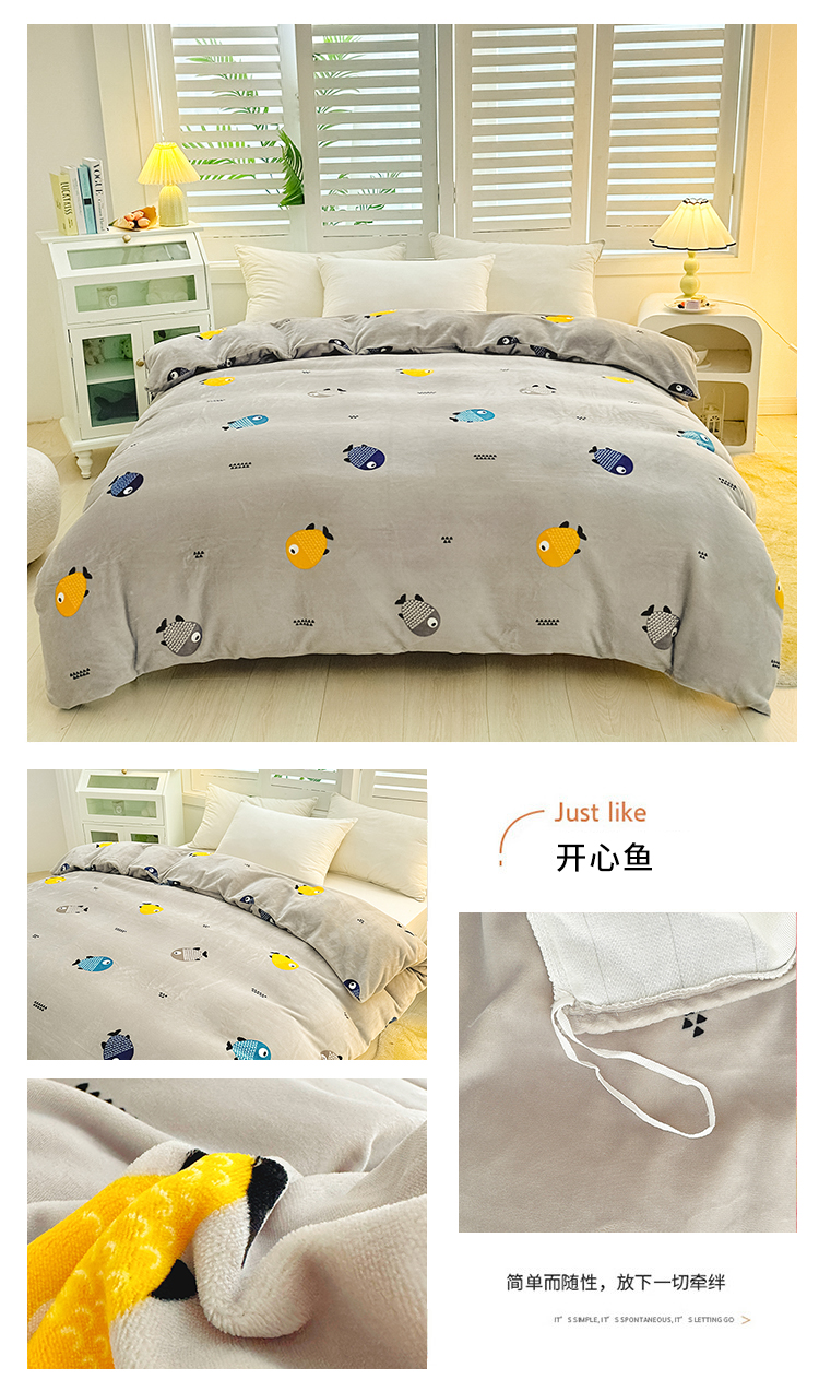 • 91家纺网 家纺一手货源 找家纺 新款230克高克重印花牛奶绒单被套定制定做尺寸 开心鱼