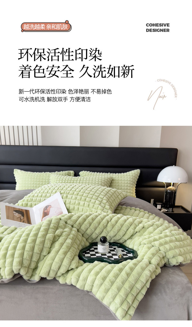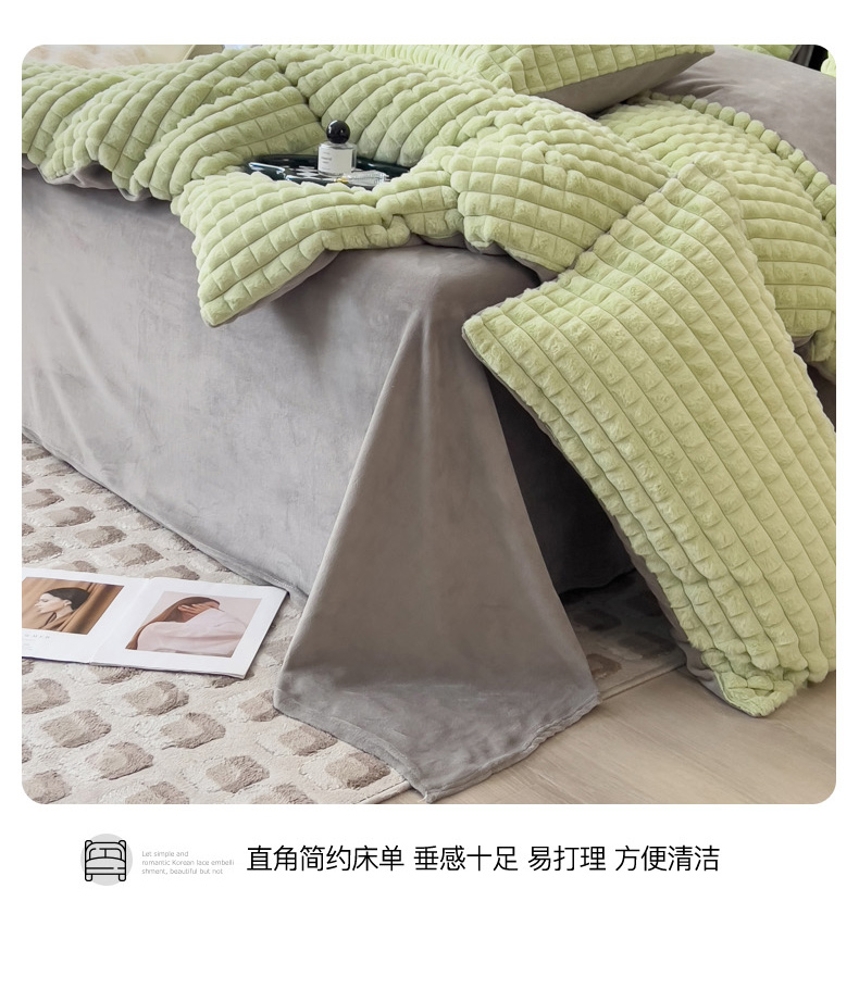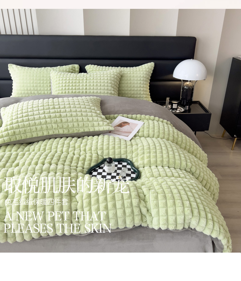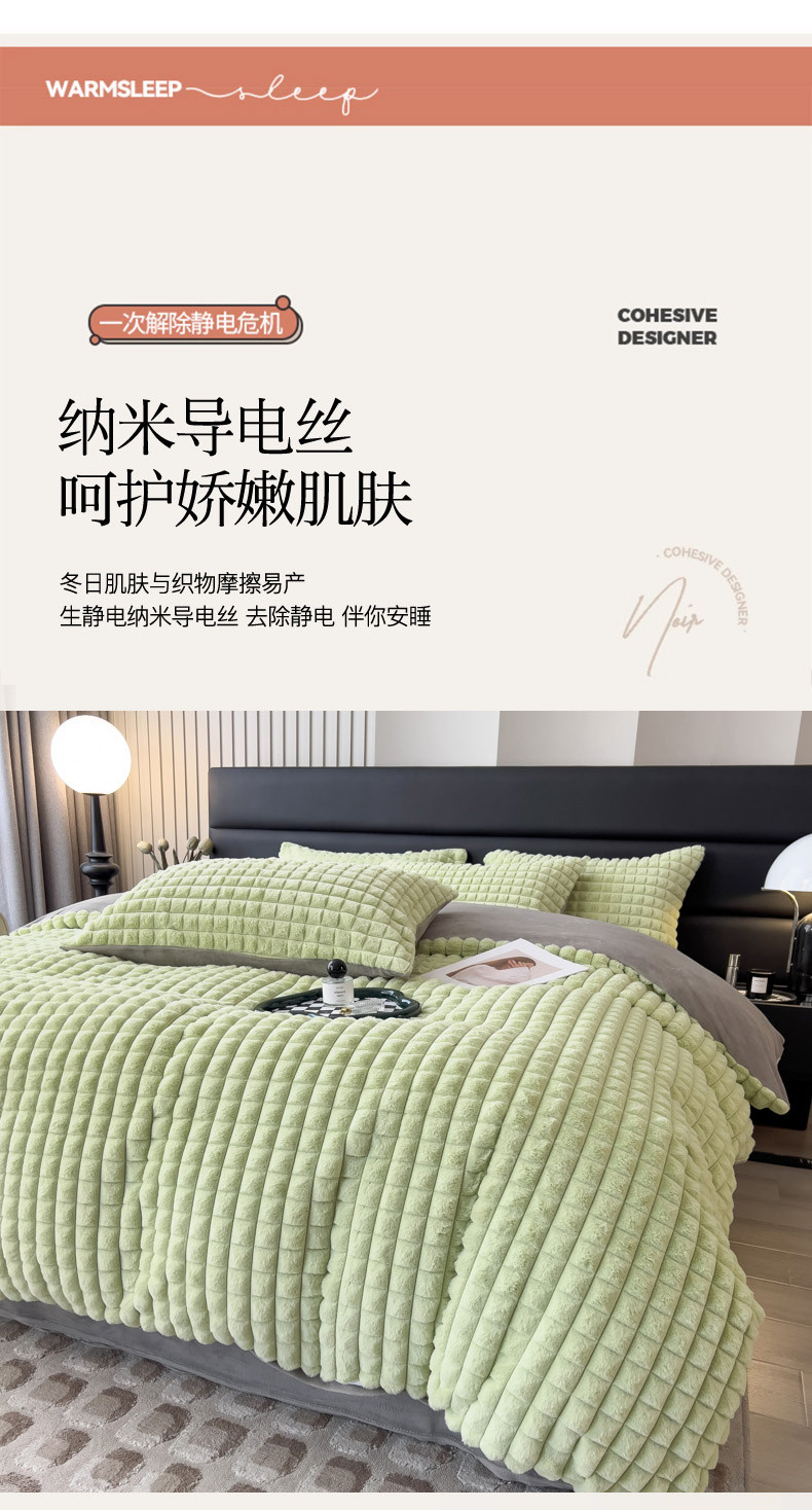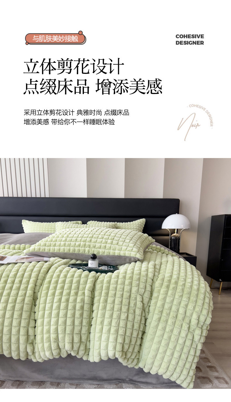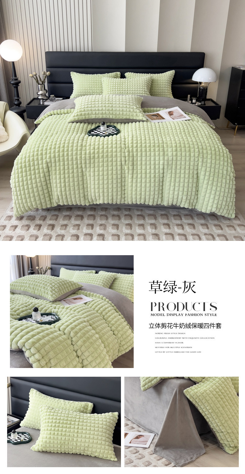商品名称:印季 2024新款立体剪花格子兔毛绒四件套 草绿-灰