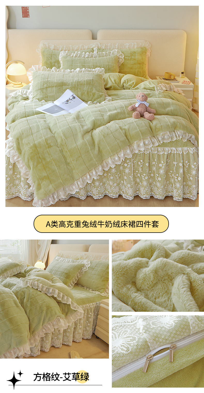 当前位置: 91家纺网 > 商品网购 > 床品套件 > 四件套 > 兔毛绒四件套 > 宜凡家纺 2023新款高克重兔绒牛奶绒床裙四件套 方格纹-艾草绿