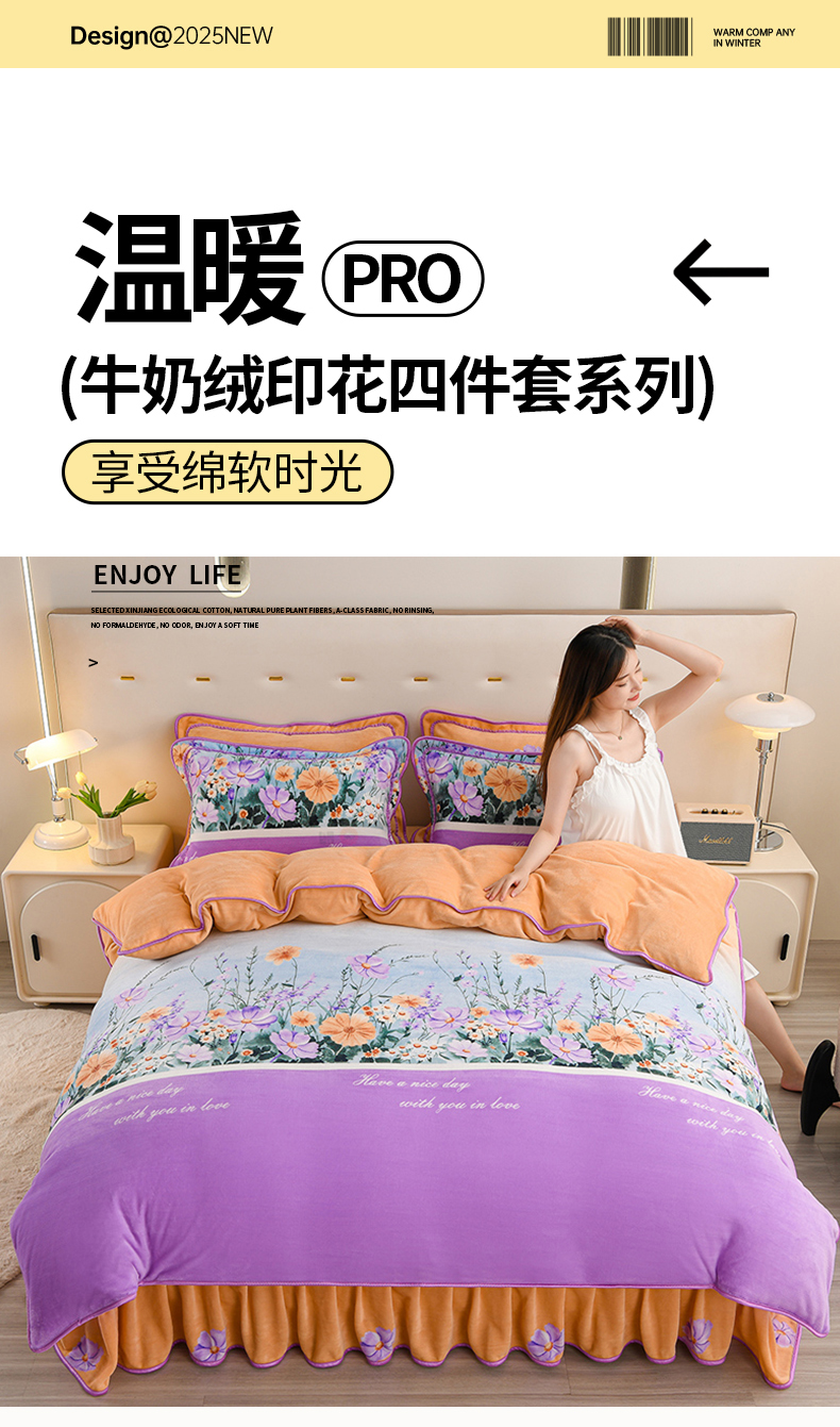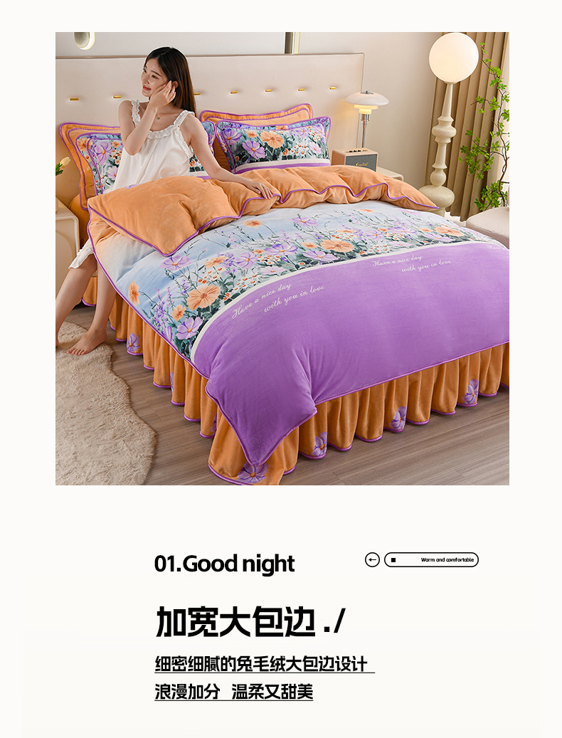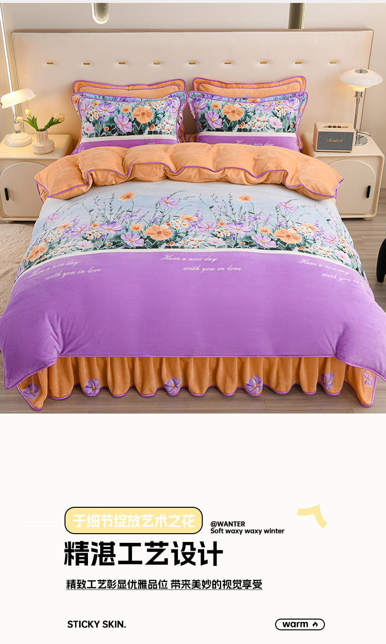 晚静家纺 2024新款8.5斤牛奶绒金貂法莱绒床裙款保暖绒四件套 多彩有杏,多彩有杏
