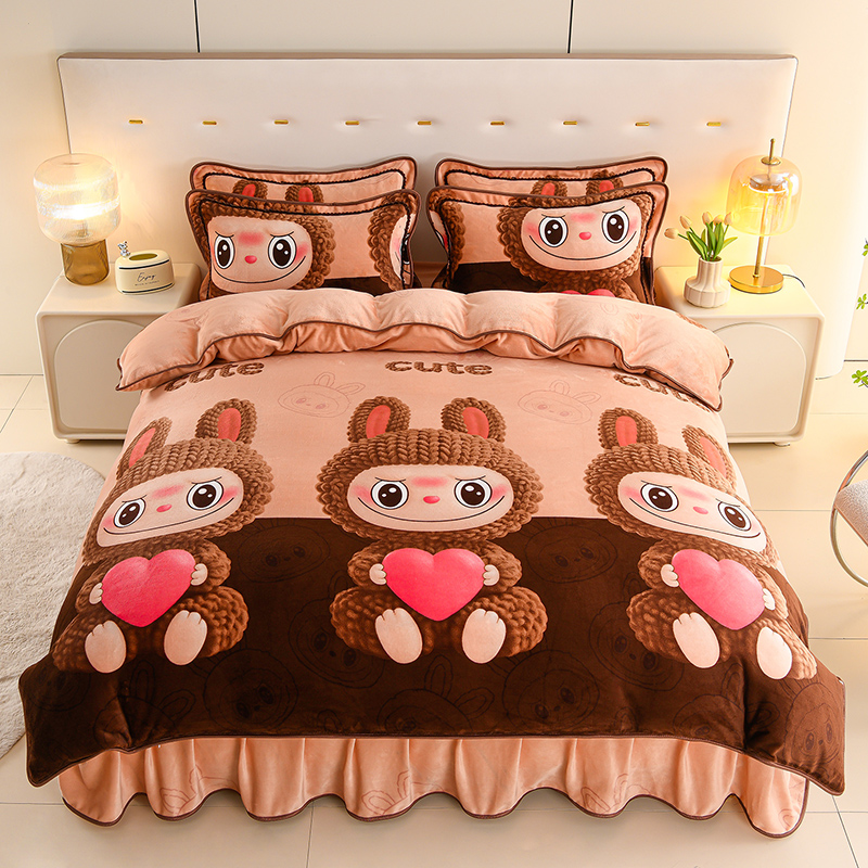 晚静 2025新款7斤牛奶绒四件套金貂法莱绒床裙款保暖绒三件套 可爱拉布,可爱拉布