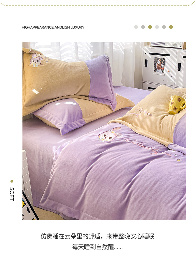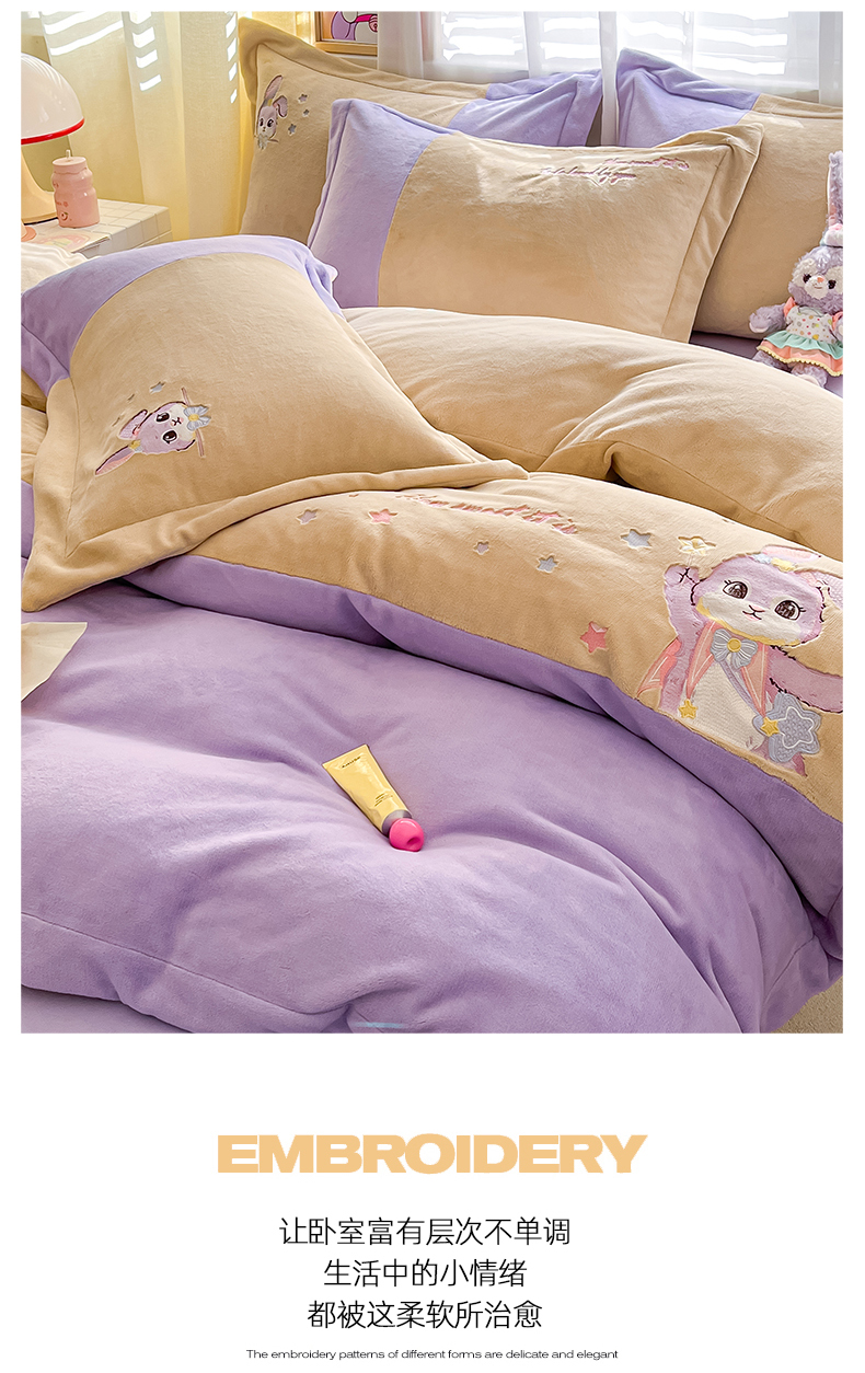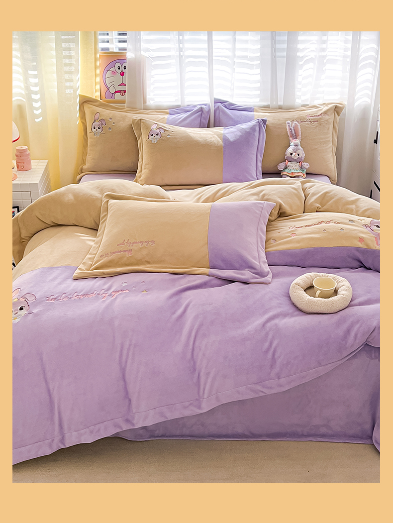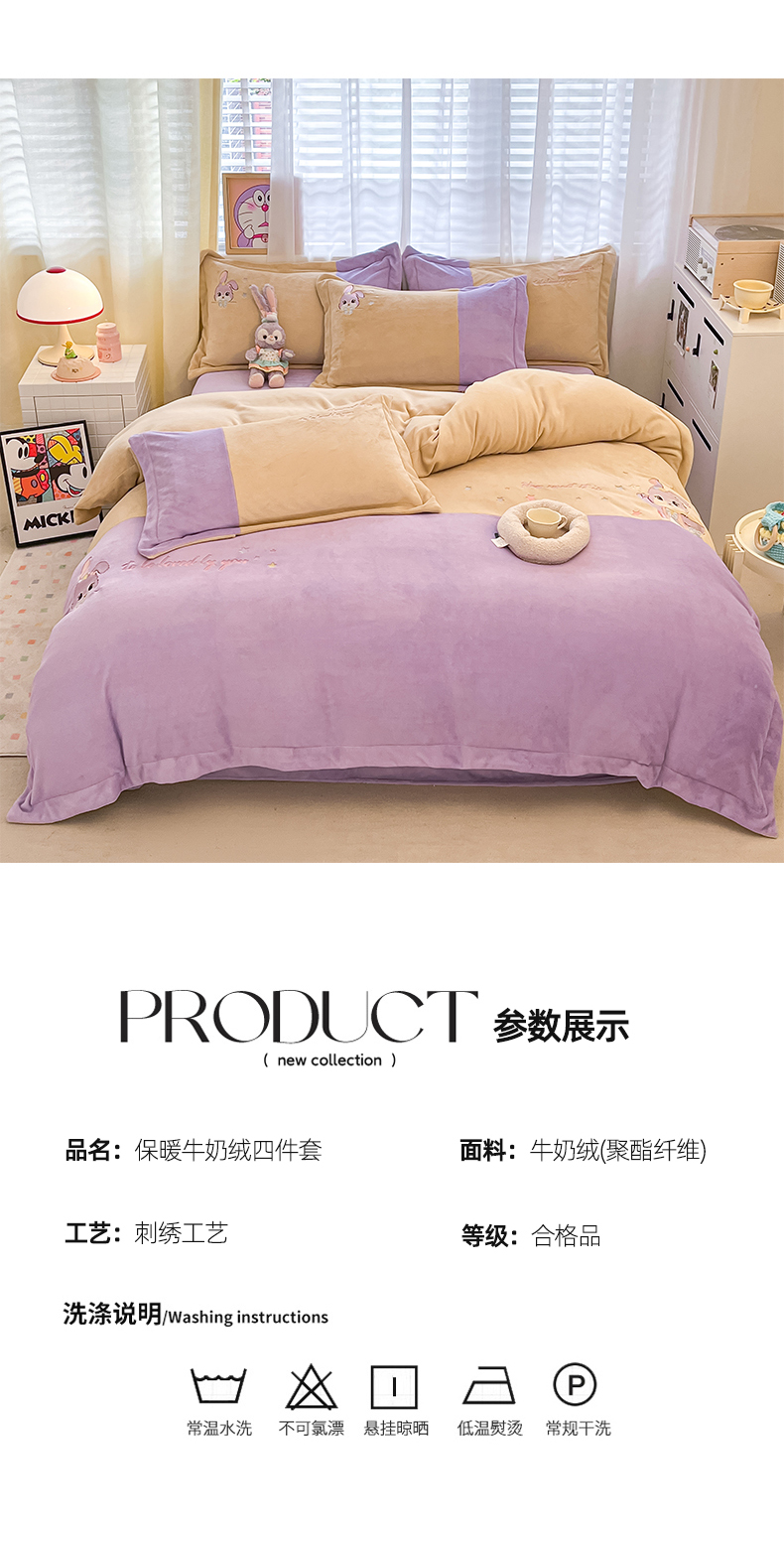 当前位置: 91家纺网 > 商品网购 > 床品套件 > 四件套 > 牛奶绒四件套 > 爱上家居 2023新款保暖加厚卡通刺绣牛奶绒四件套 兔眠-芋泥紫拼黄