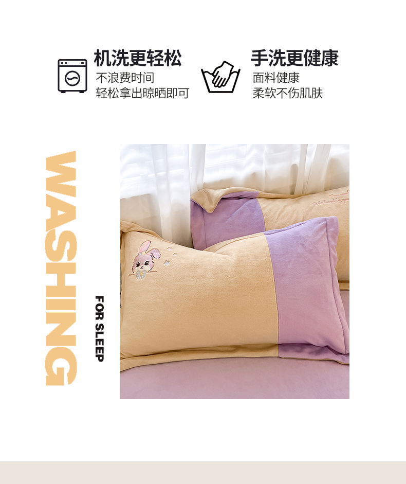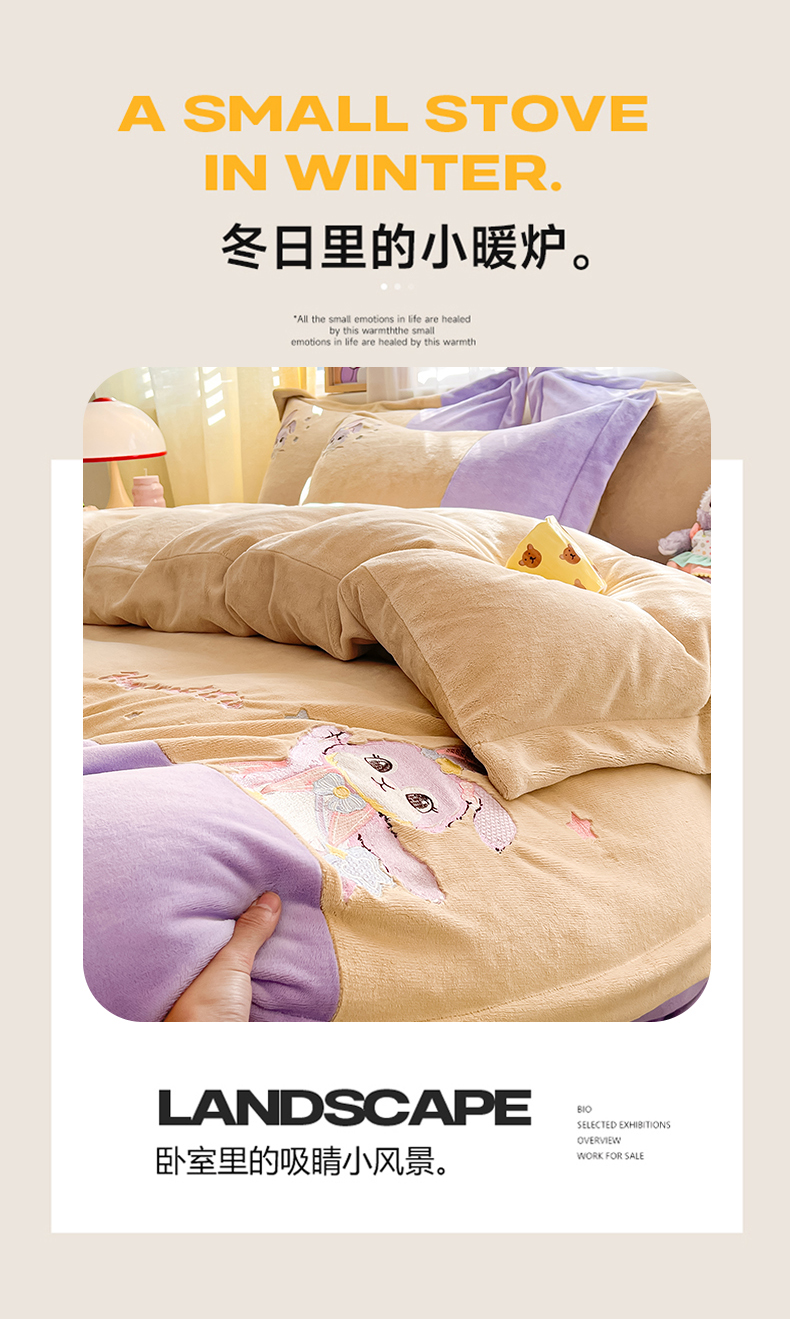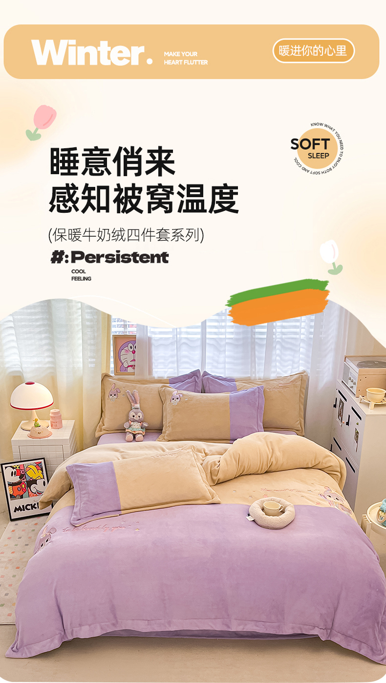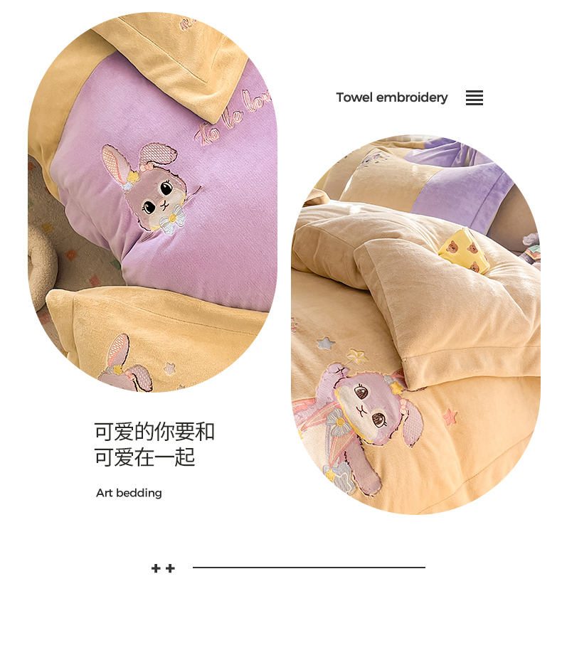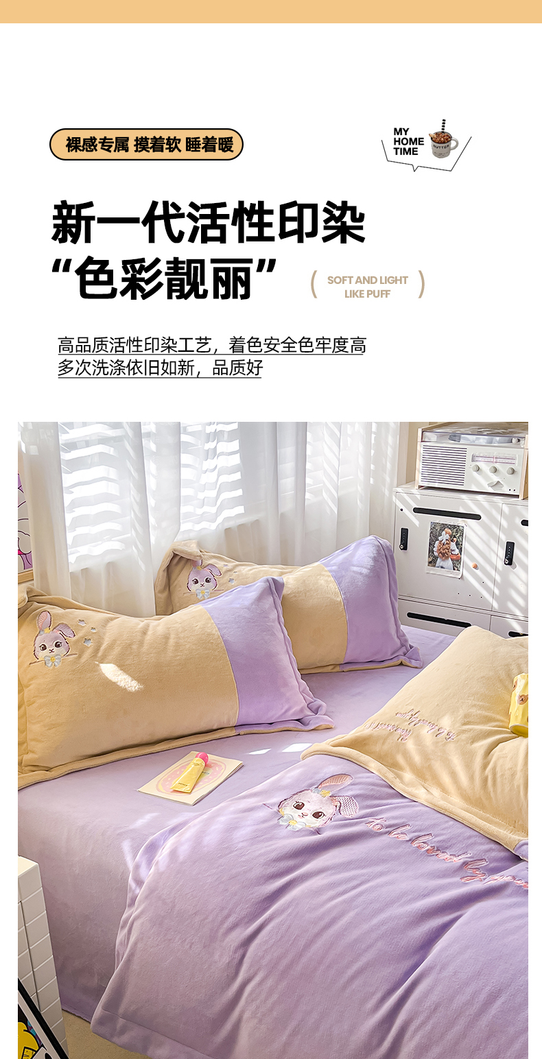 当前位置: 91家纺网 > 商品网购 > 床品套件 > 四件套 > 牛奶绒四件套 > 爱上家居 2023新款保暖加厚卡通刺绣牛奶绒四件套 兔眠-芋泥紫拼黄