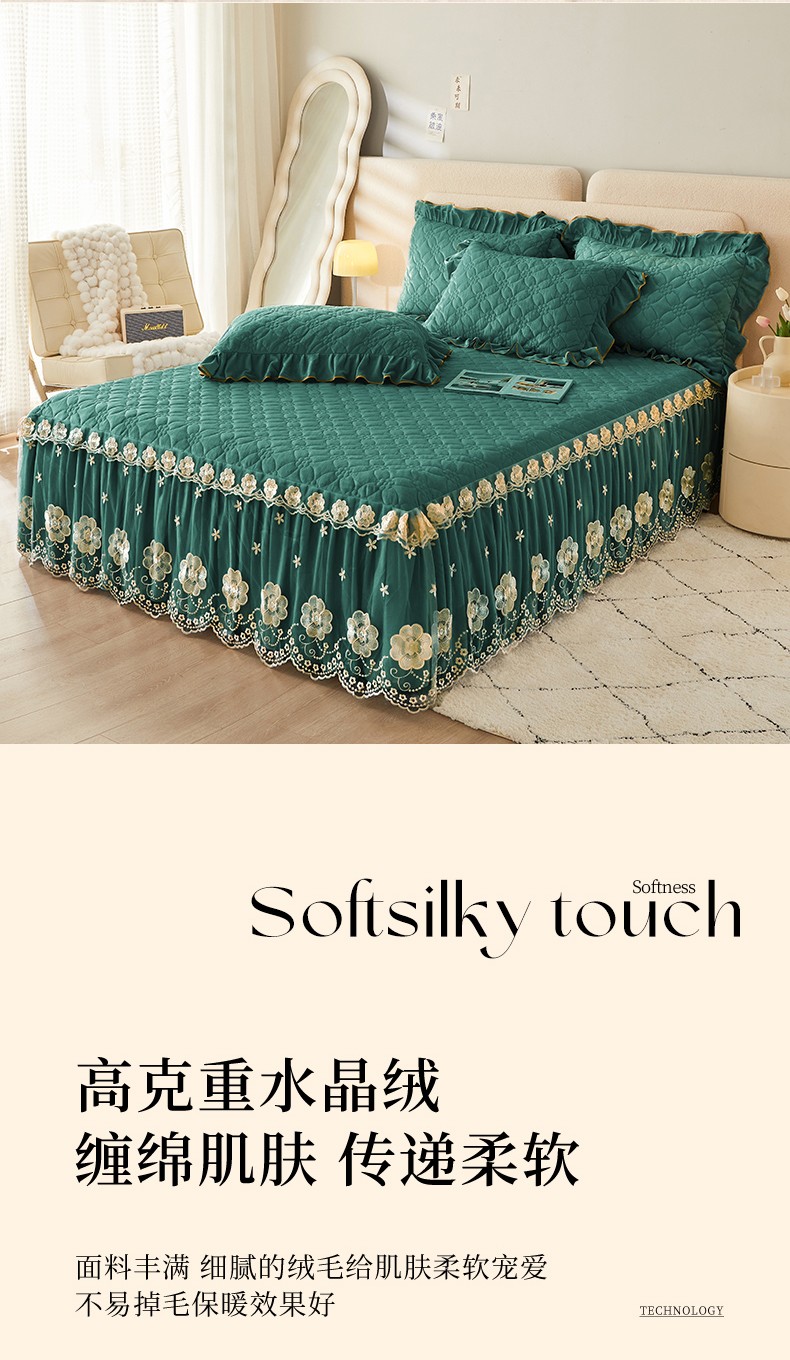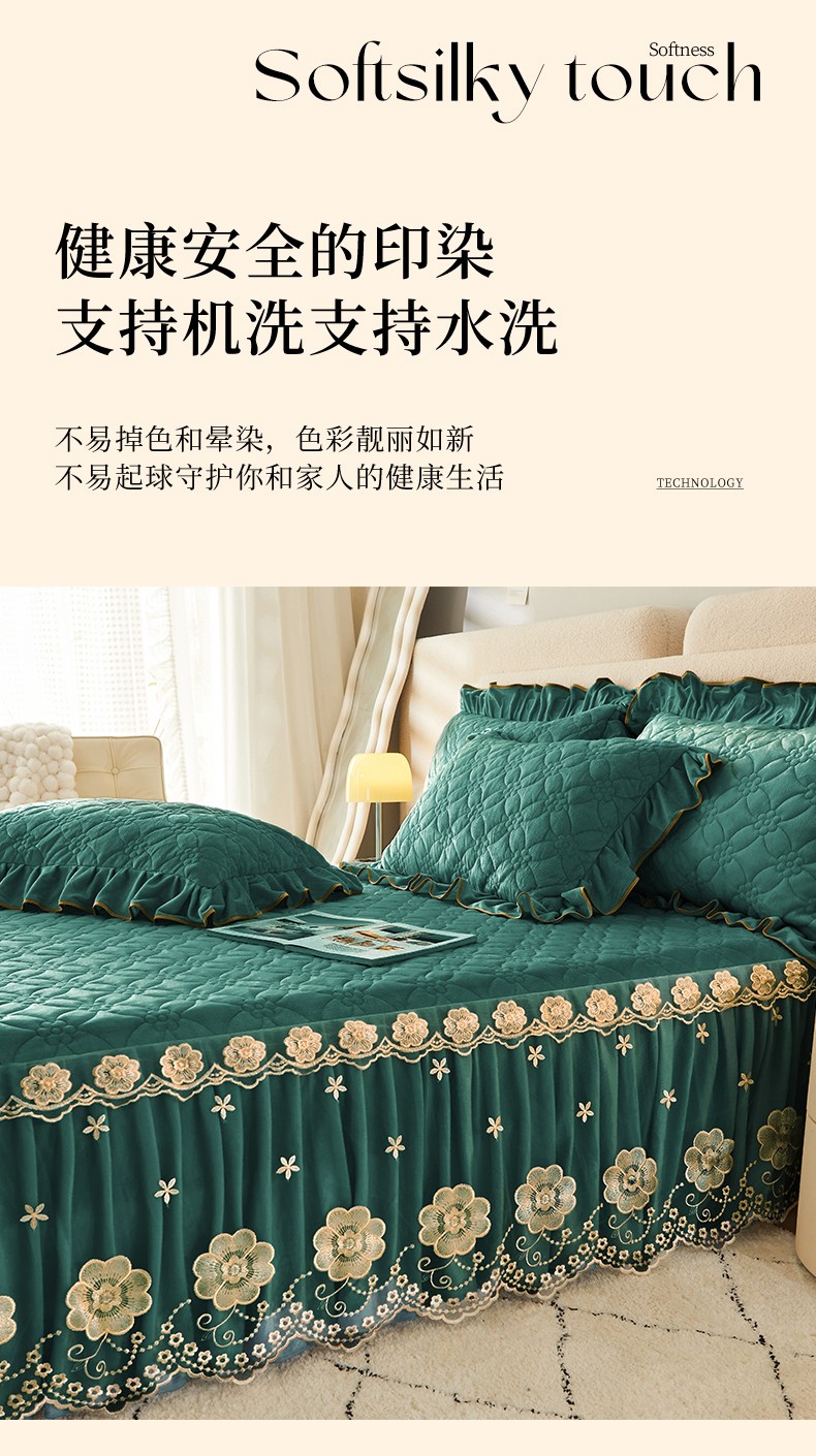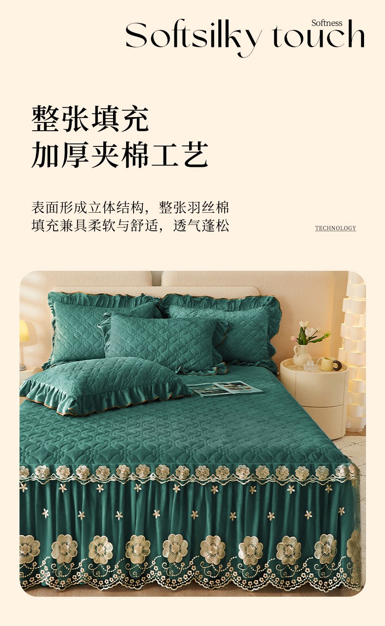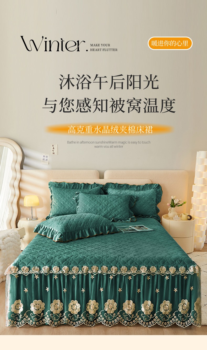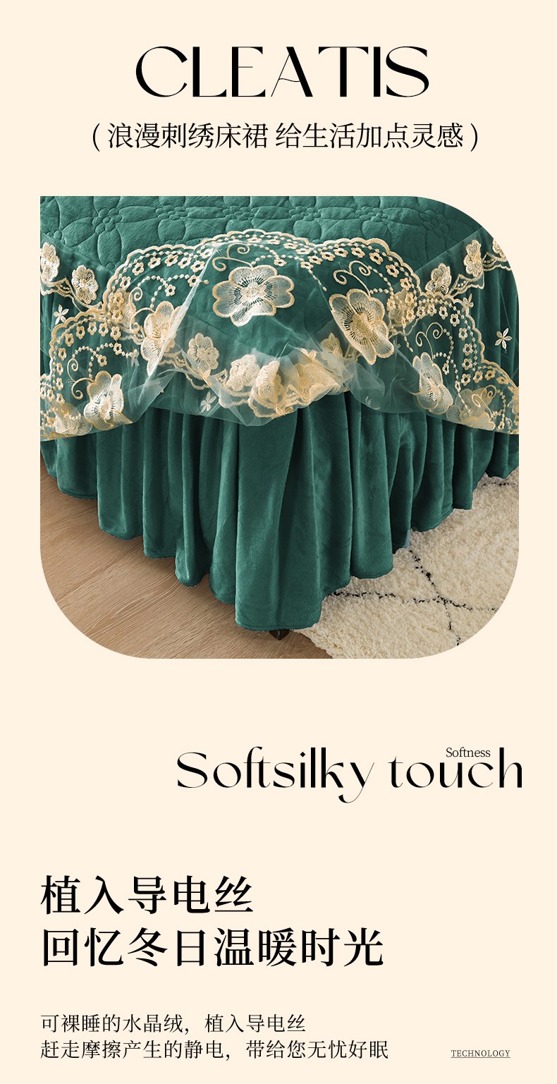 • 91家纺网 家纺一手货源 找家纺 罗艺轩 2024秋冬新款水晶绒花样年华全夹棉加厚床裙三件套 花样年华-橄榄绿