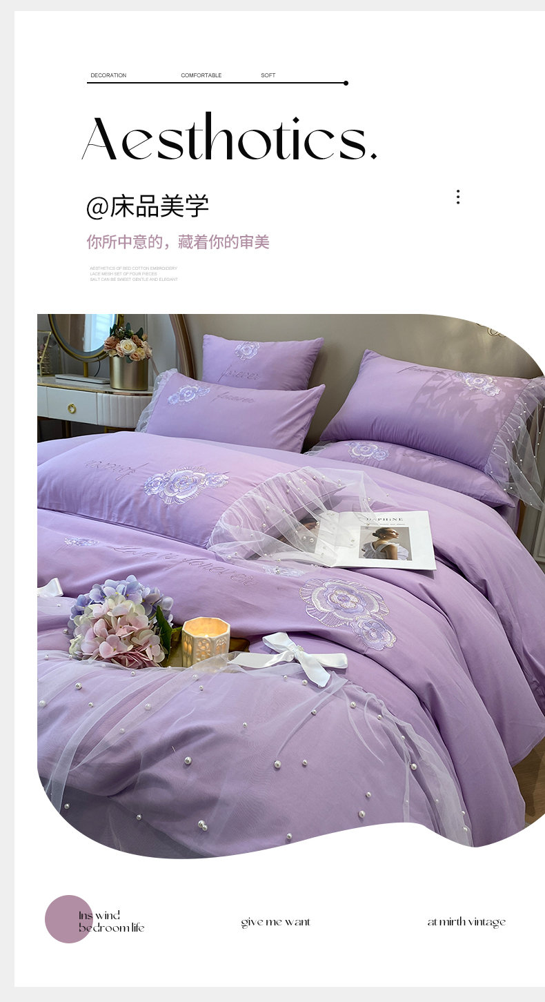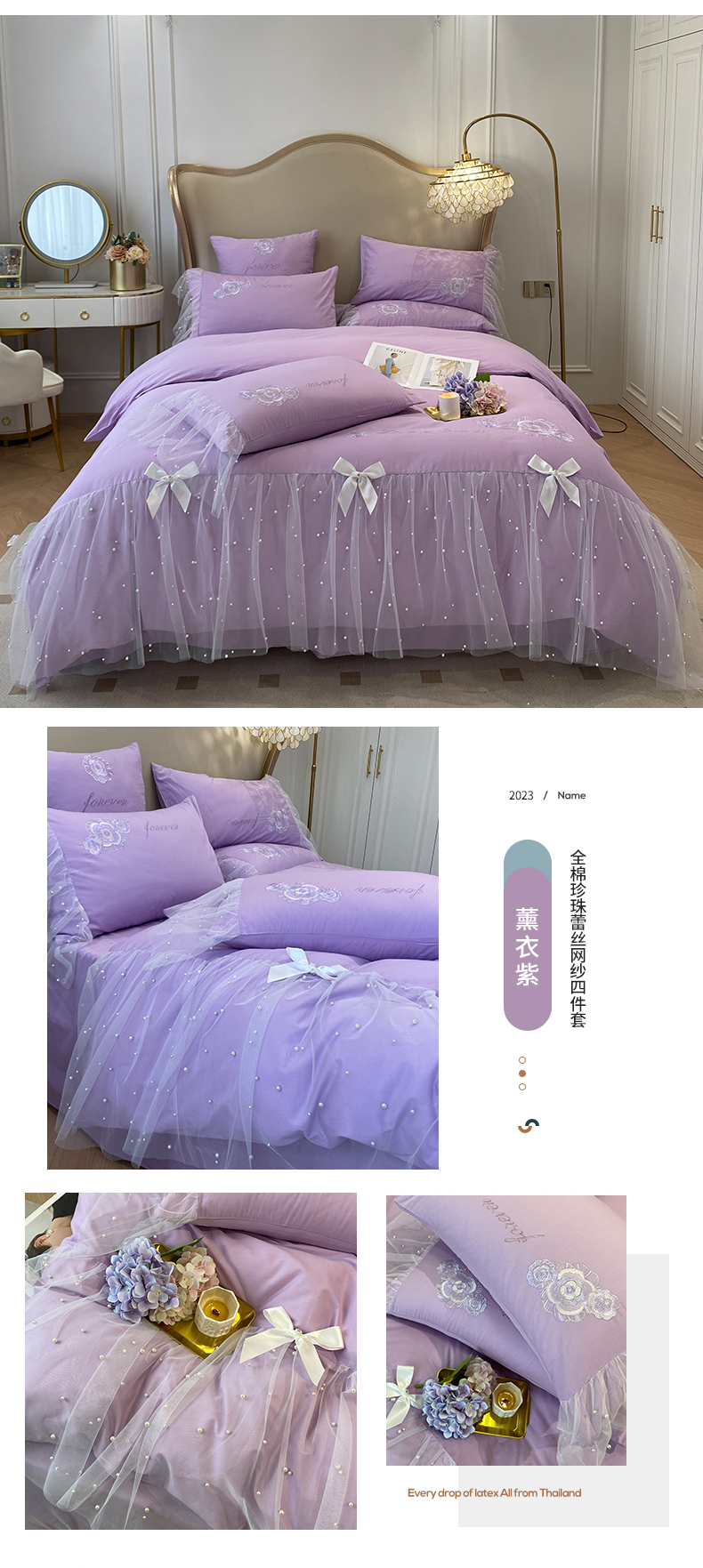 欧冠家纺 2024新款全棉蕾丝珍珠网纱四件套 丽丽贝尔系列 薰衣紫