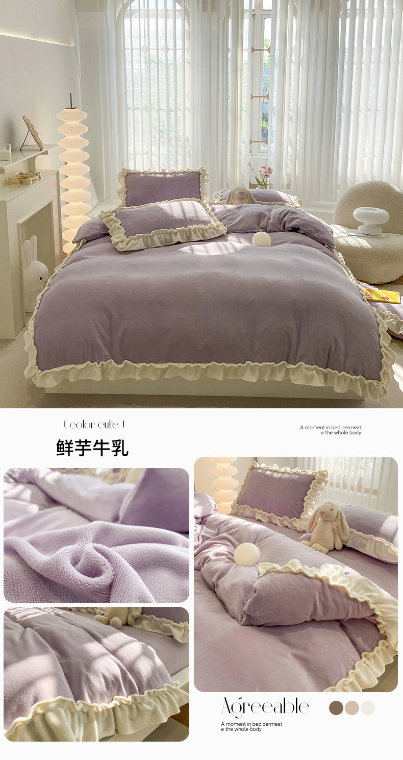 商品名称:小主驾到 2024新款马卡龙系列牛奶绒法式花边款四件套 鲜芋牛乳