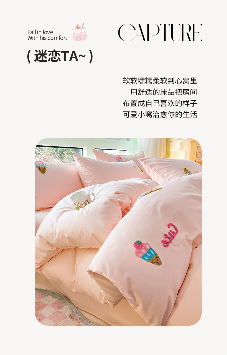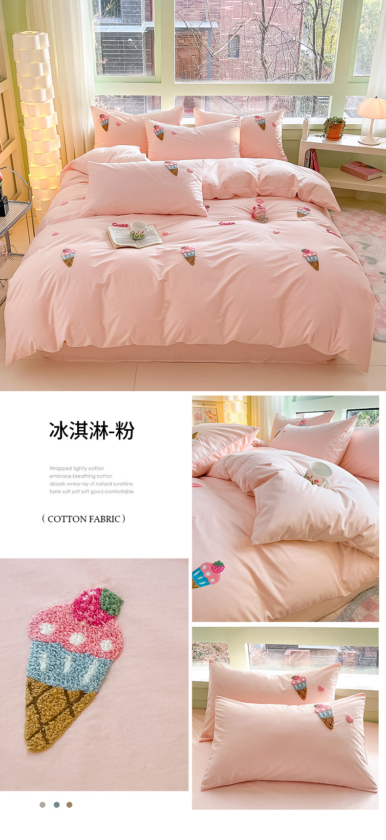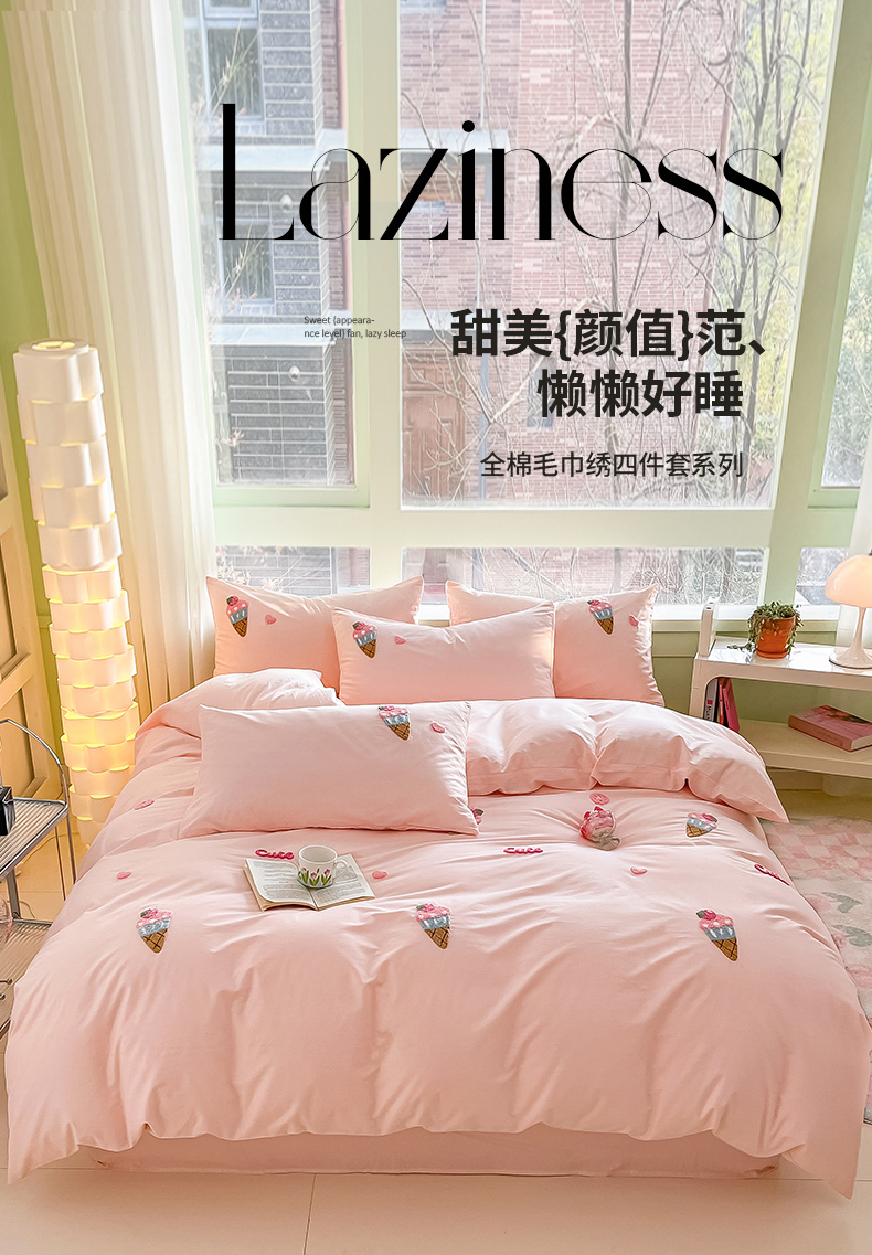 当前位置: 91家纺网 > 商品网购 > 床品套件 > 四件套 > 全棉普通四件套 > 泽西 2024新款全棉13376毛巾绣四件套-冰淇淋系列 冰淇淋-粉