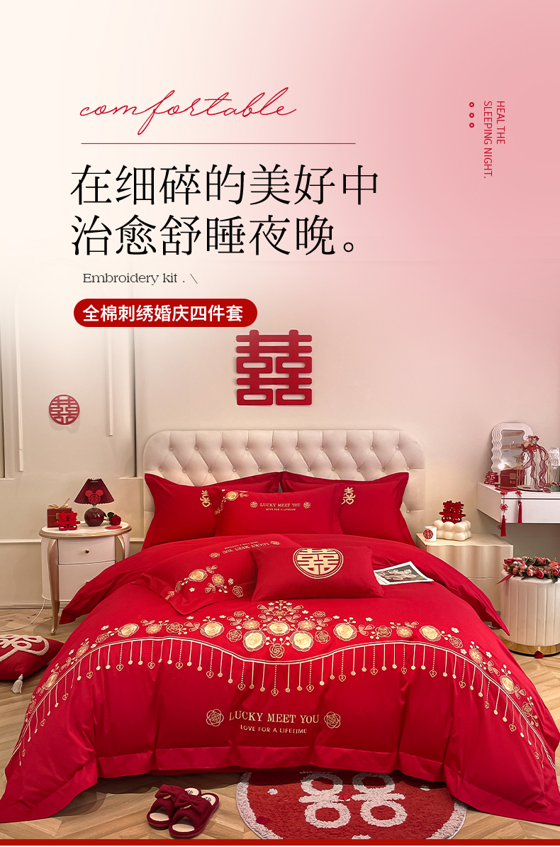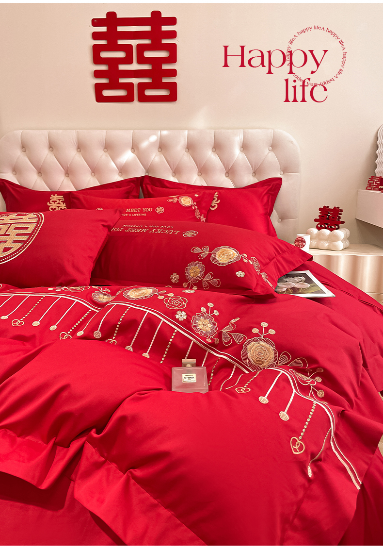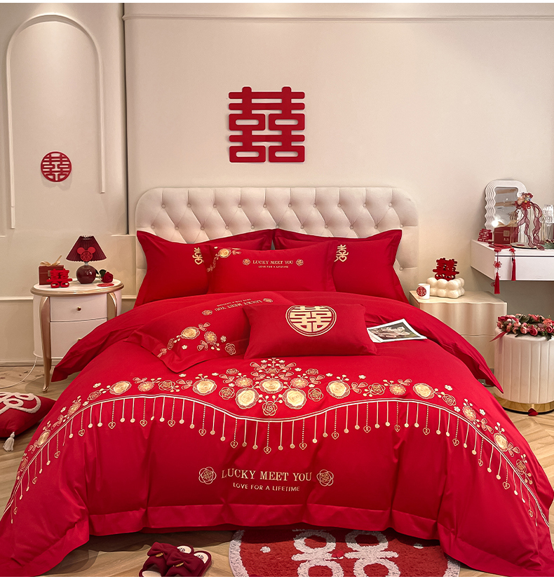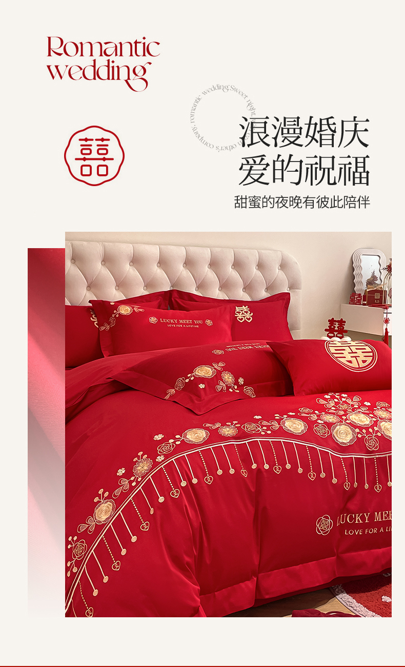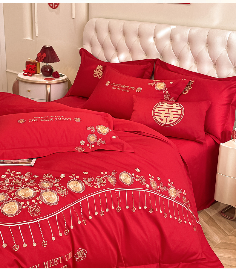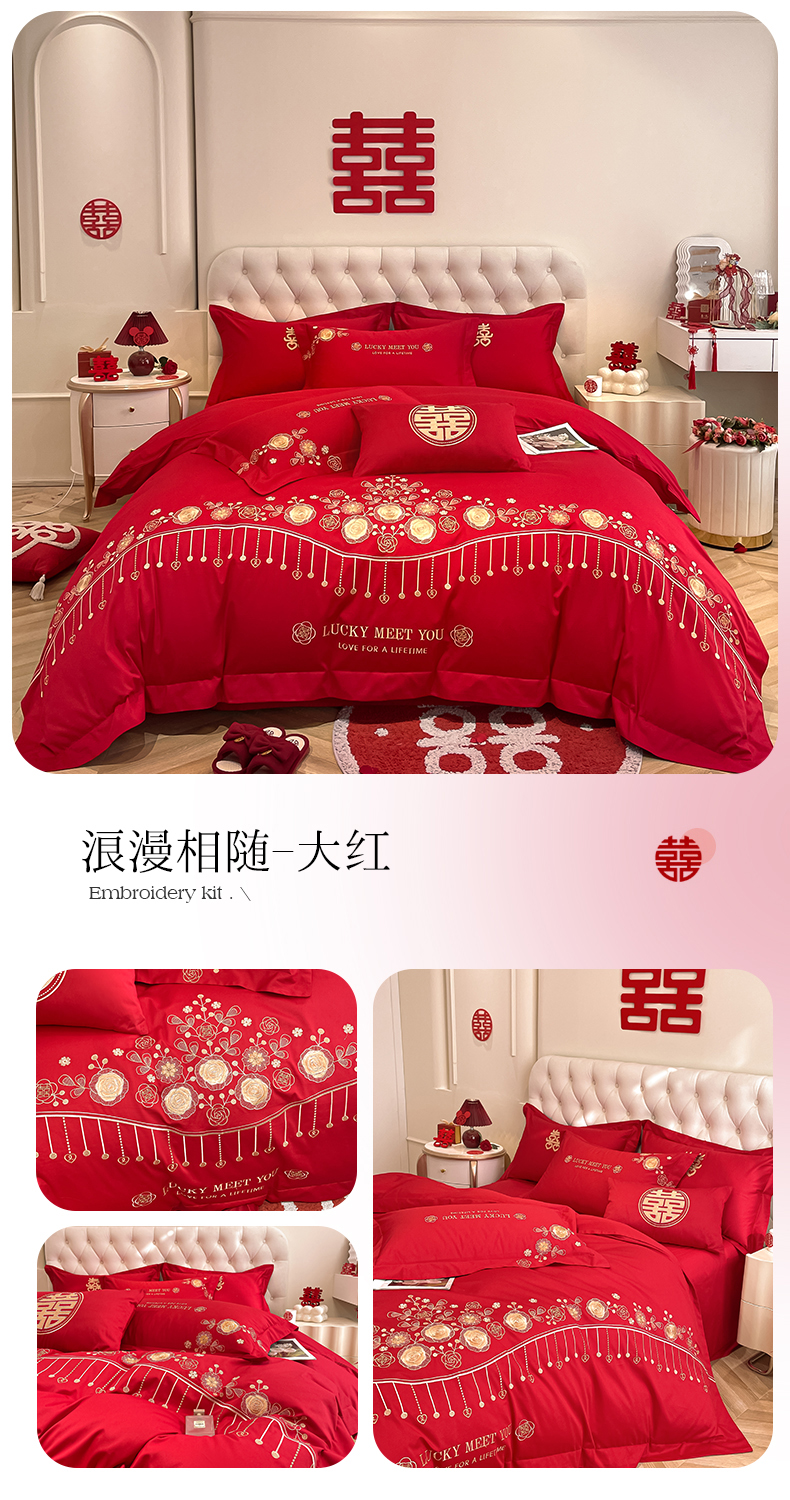 遇见家居生活馆 2024新款全棉刺绣婚庆四件套 浪漫相随-大红
