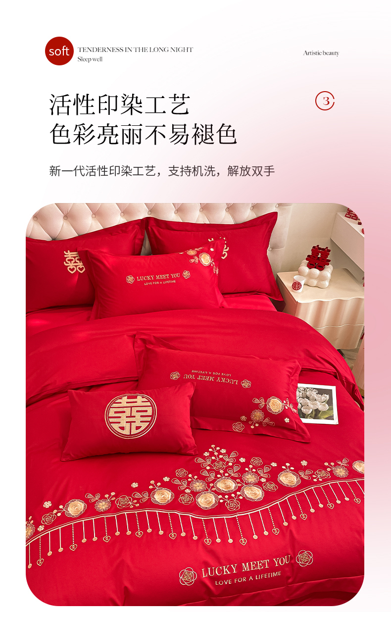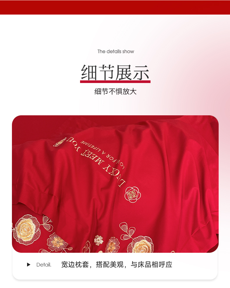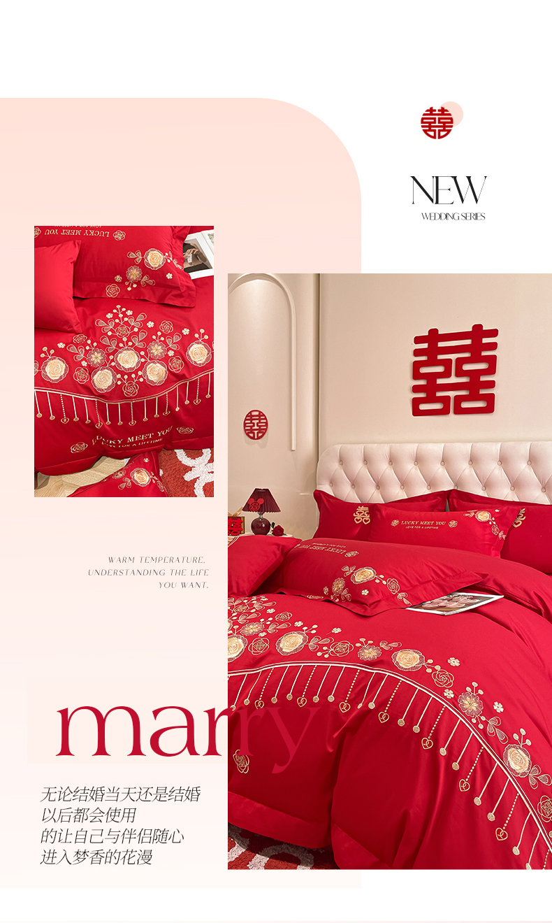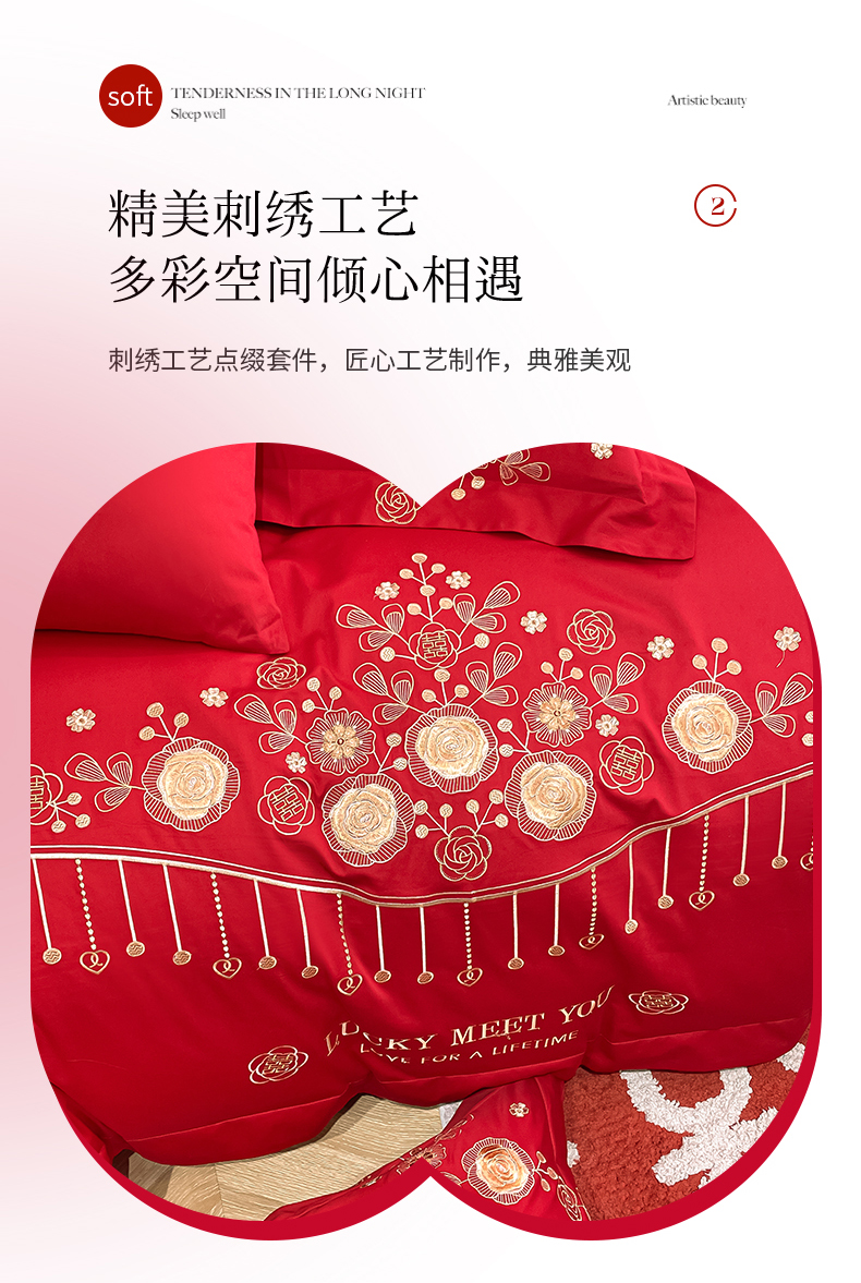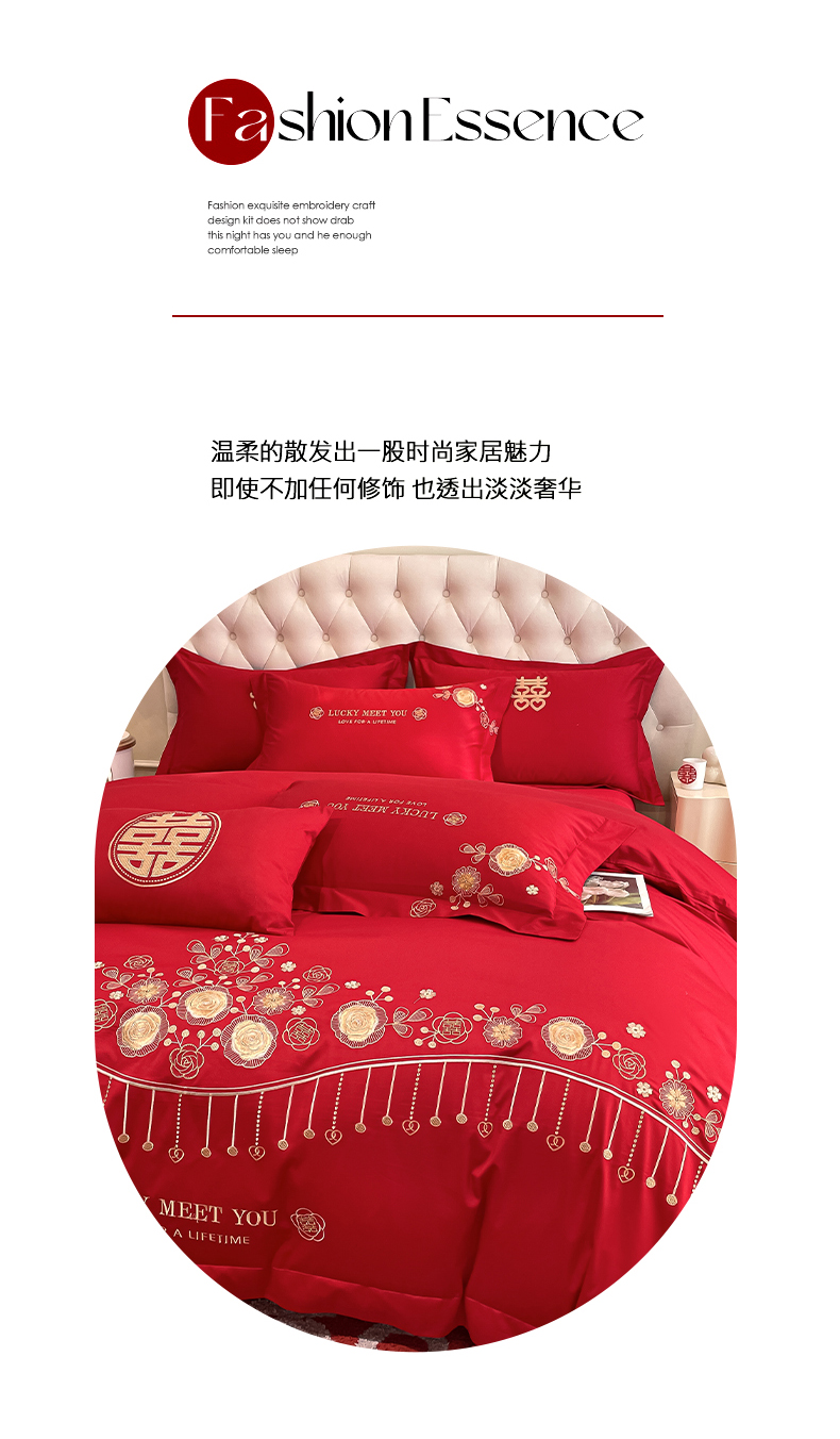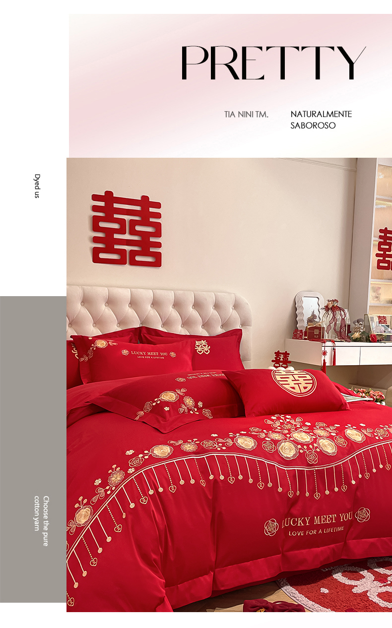 遇见家居生活馆 2024新款全棉刺绣婚庆四件套 浪漫相随-大红