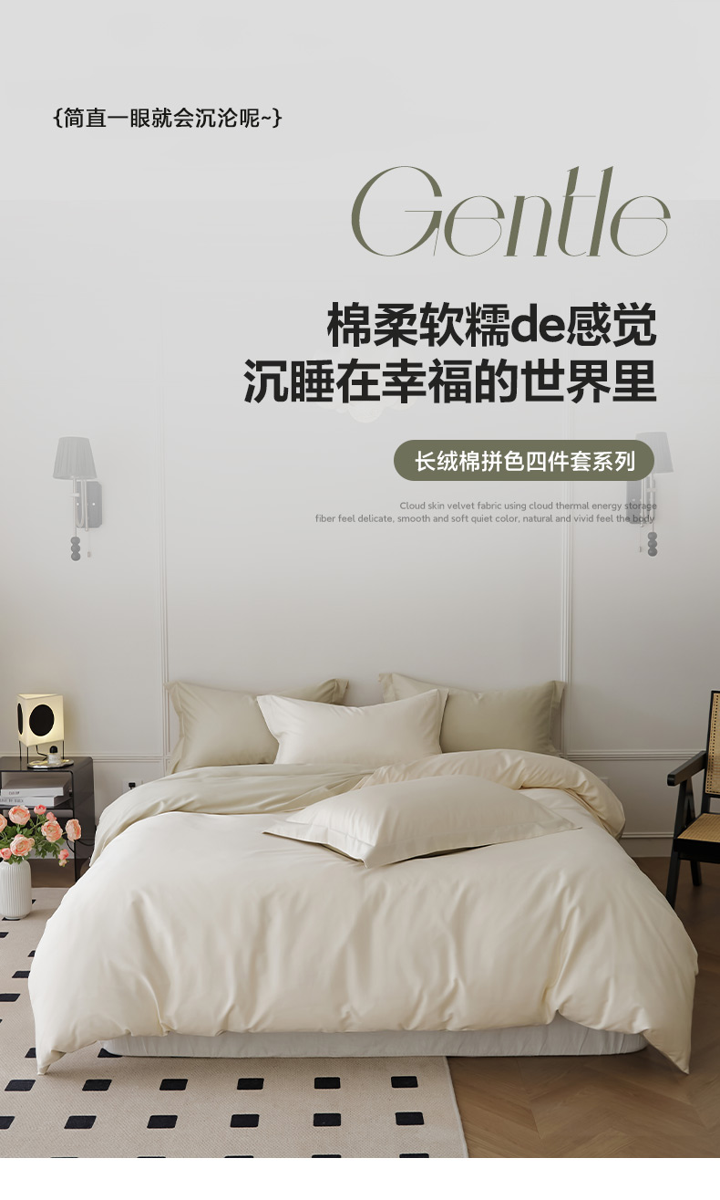 当前位置: 91家纺网 > 商品网购 > 床品套件 > 四件套 > 长绒棉四件套 > 新款绵柔软糯长绒棉拼色四件套 牛奶coco