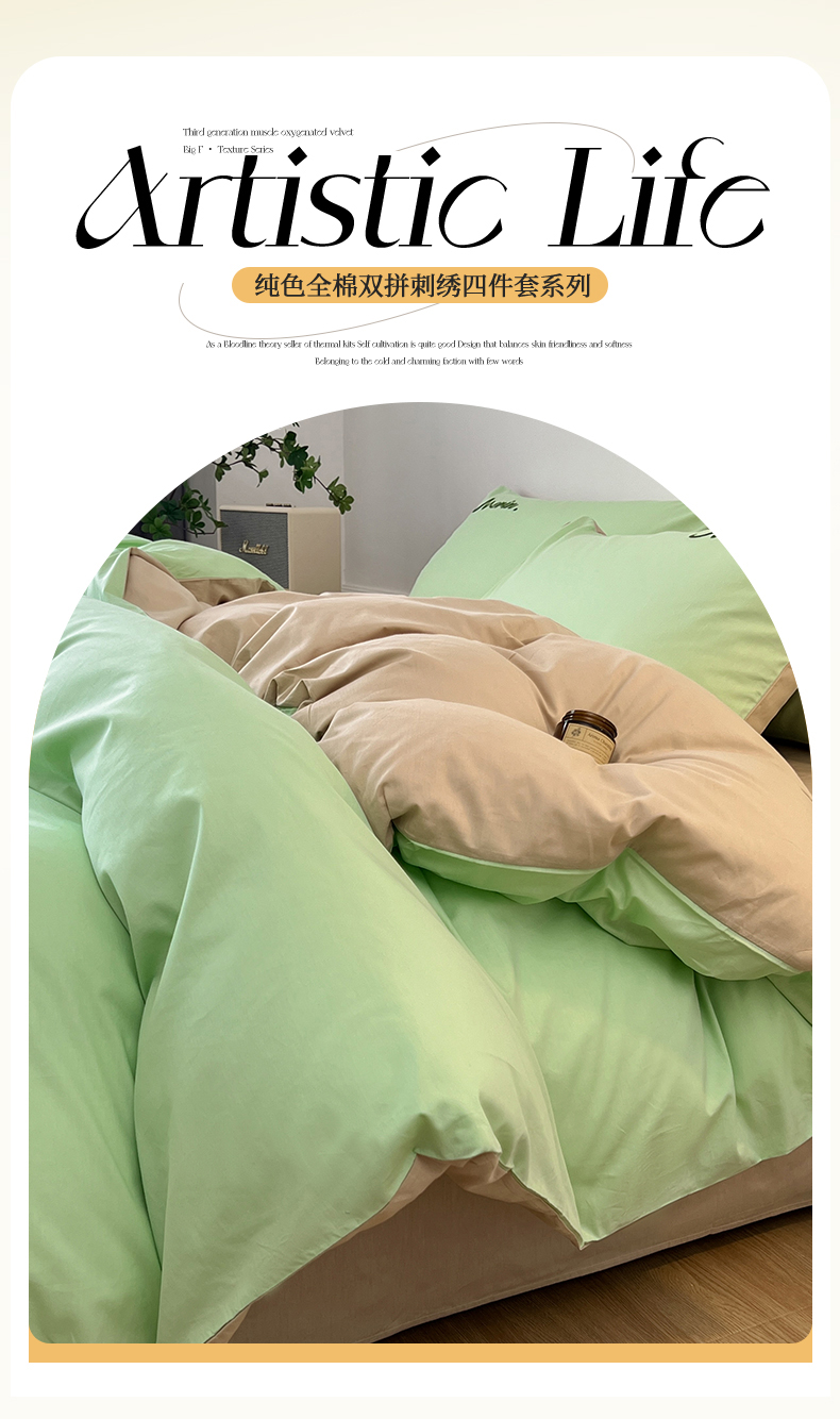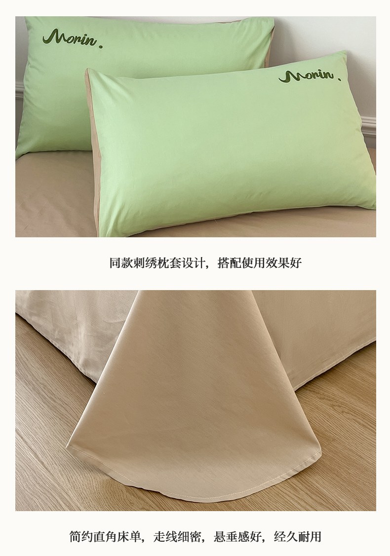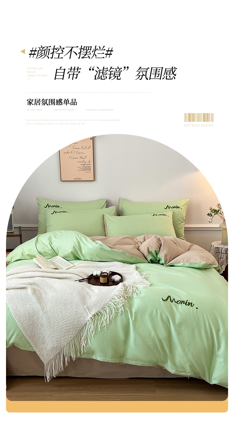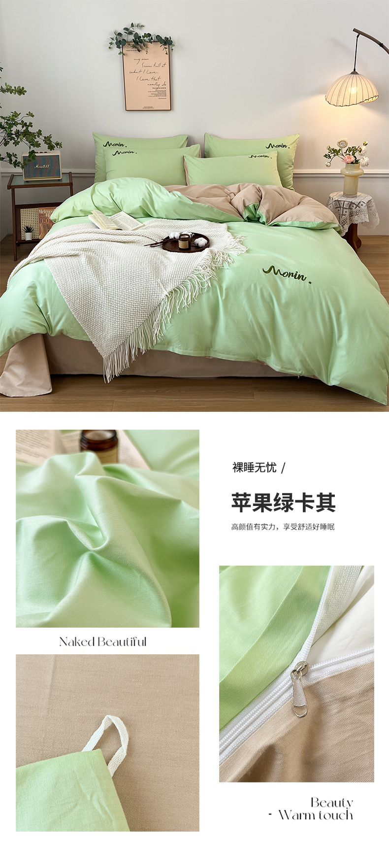 多品家纺 2024新款全棉纯色双拼刺绣四件套 苹果绿卡其
