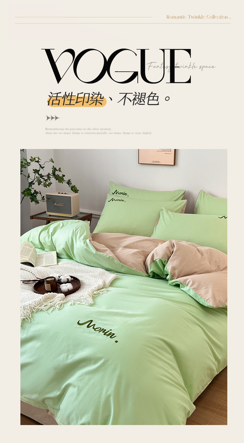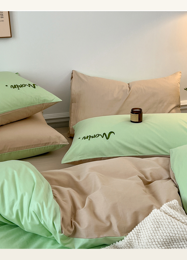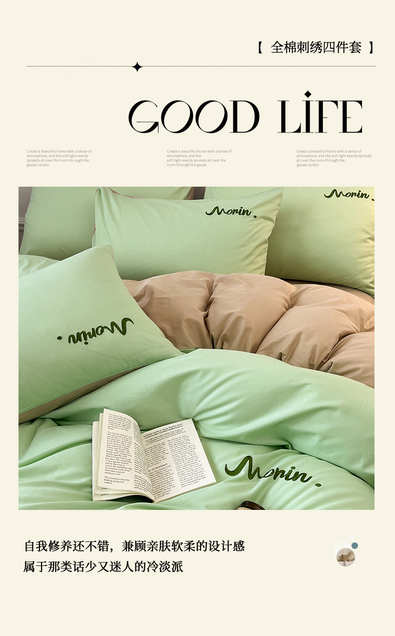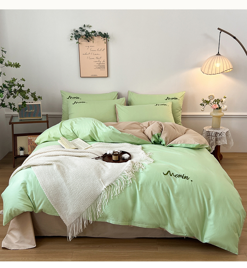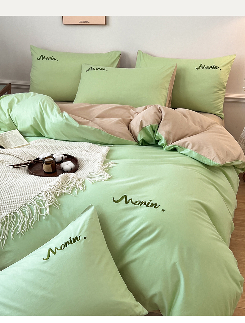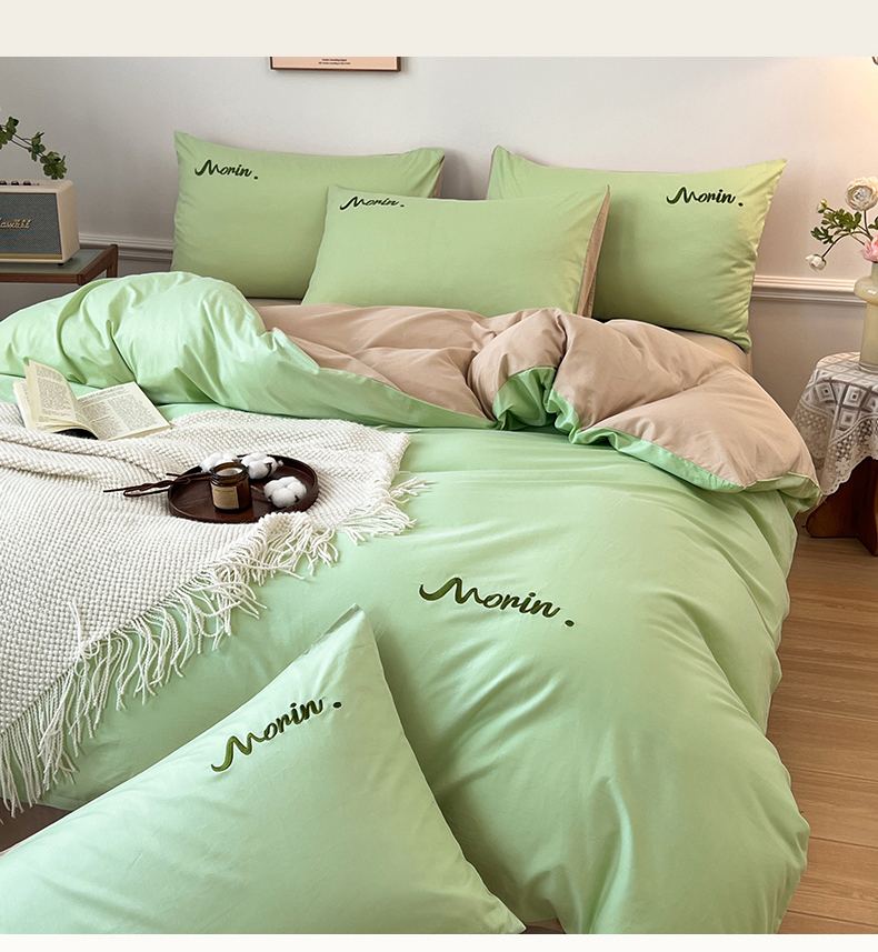 多品家纺 2024新款全棉纯色双拼刺绣四件套 苹果绿卡其