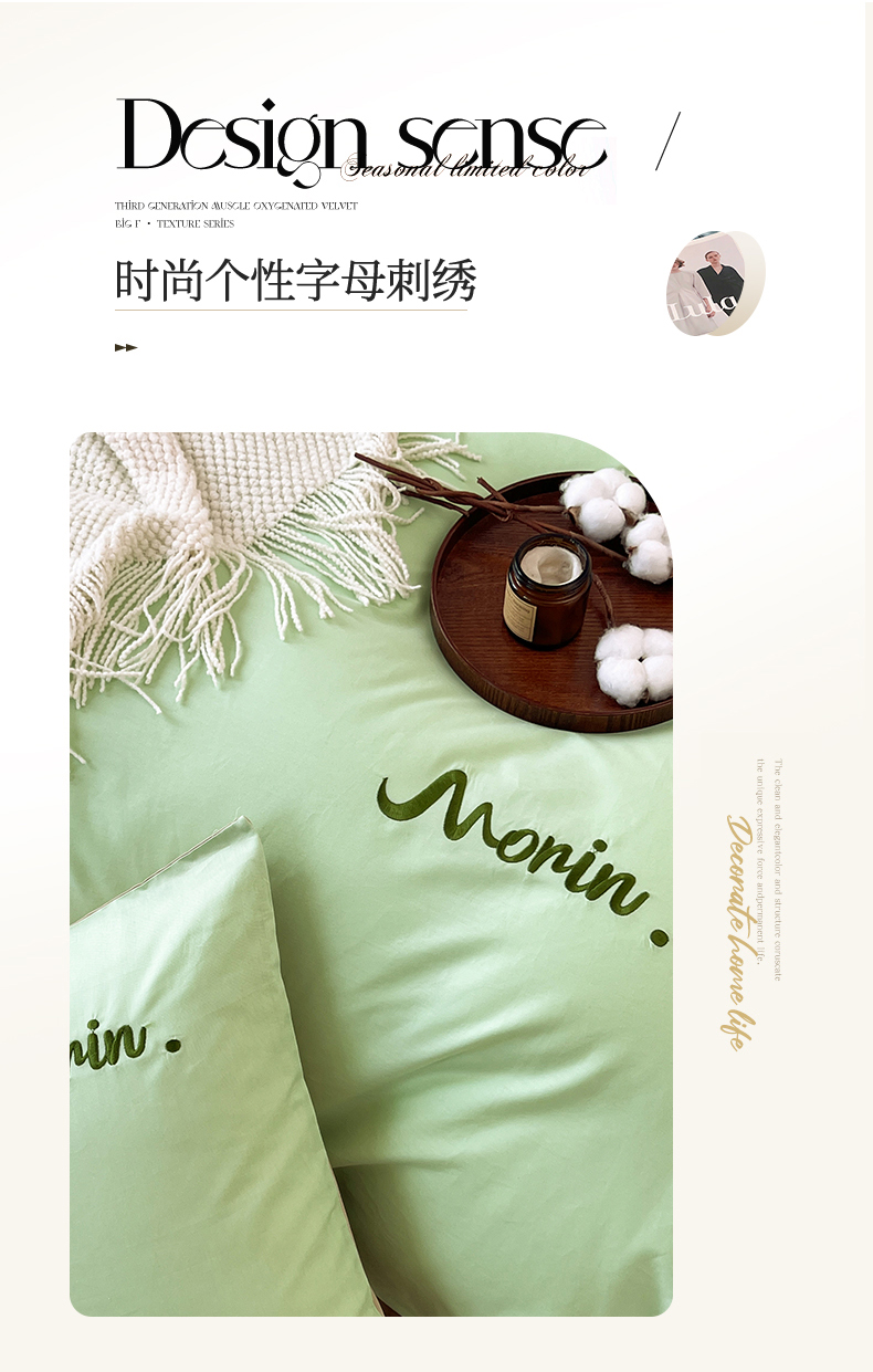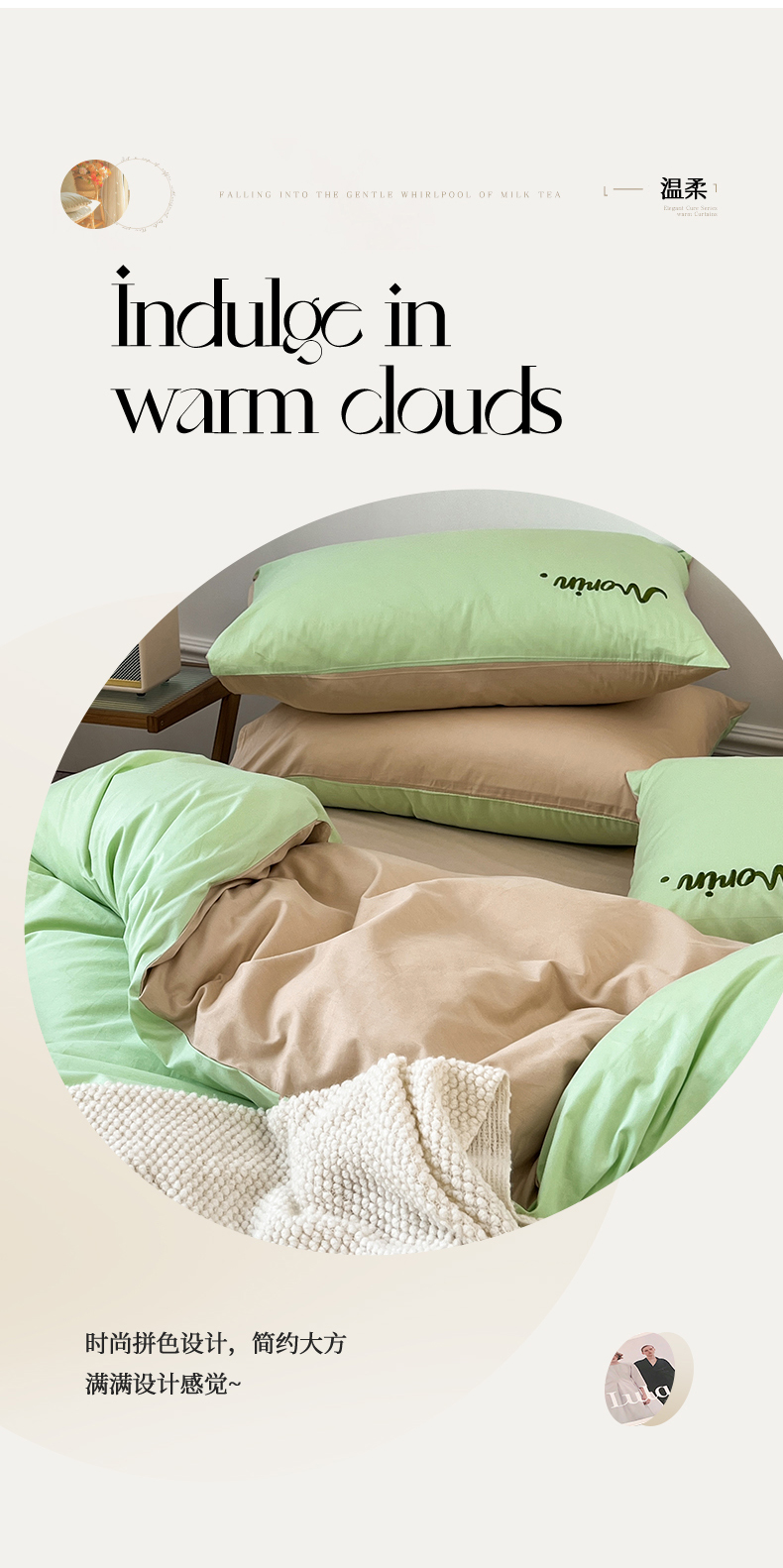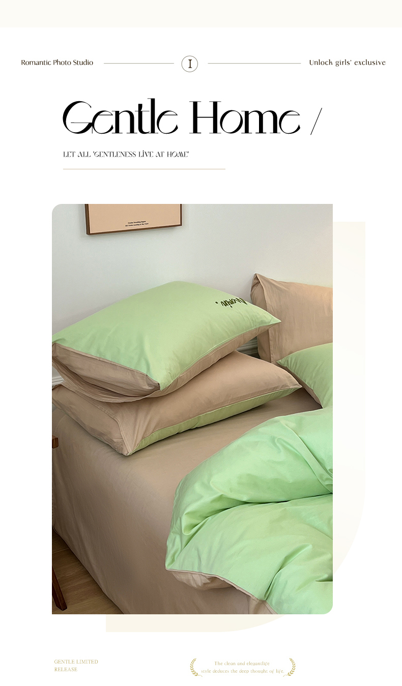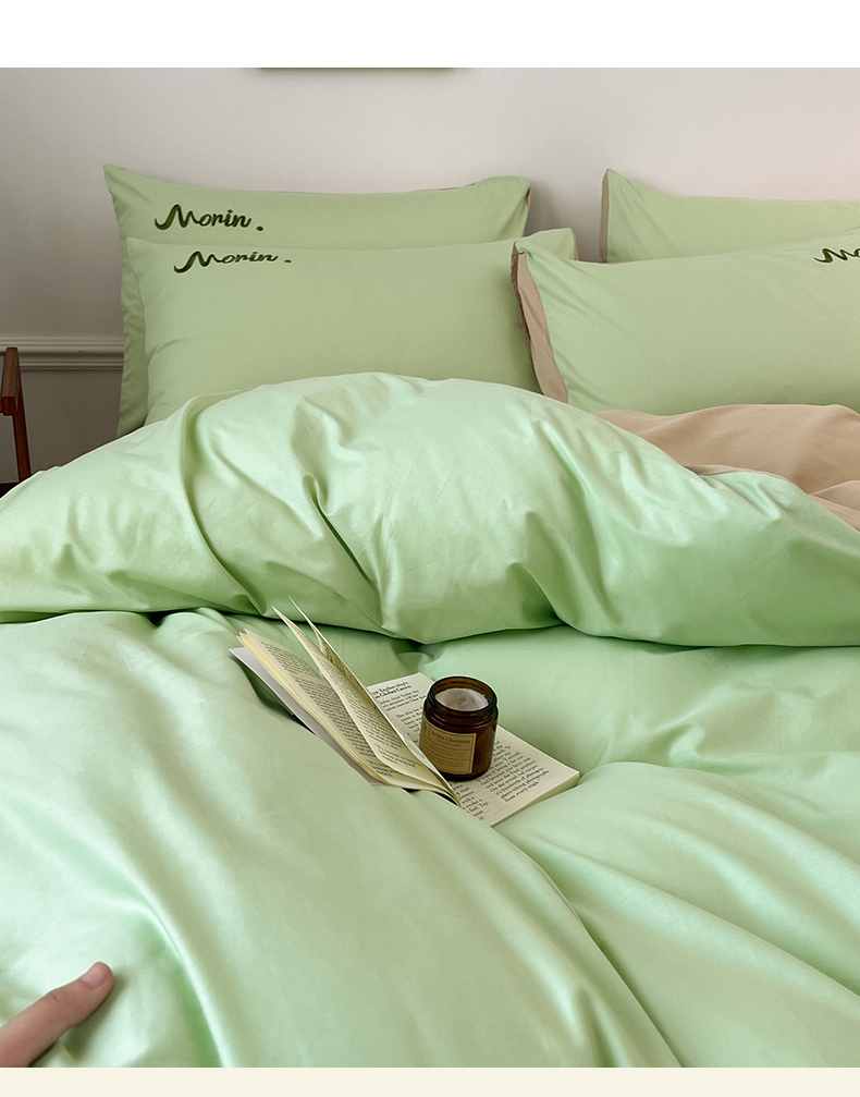 多品家纺 2024新款全棉纯色双拼刺绣四件套 苹果绿卡其