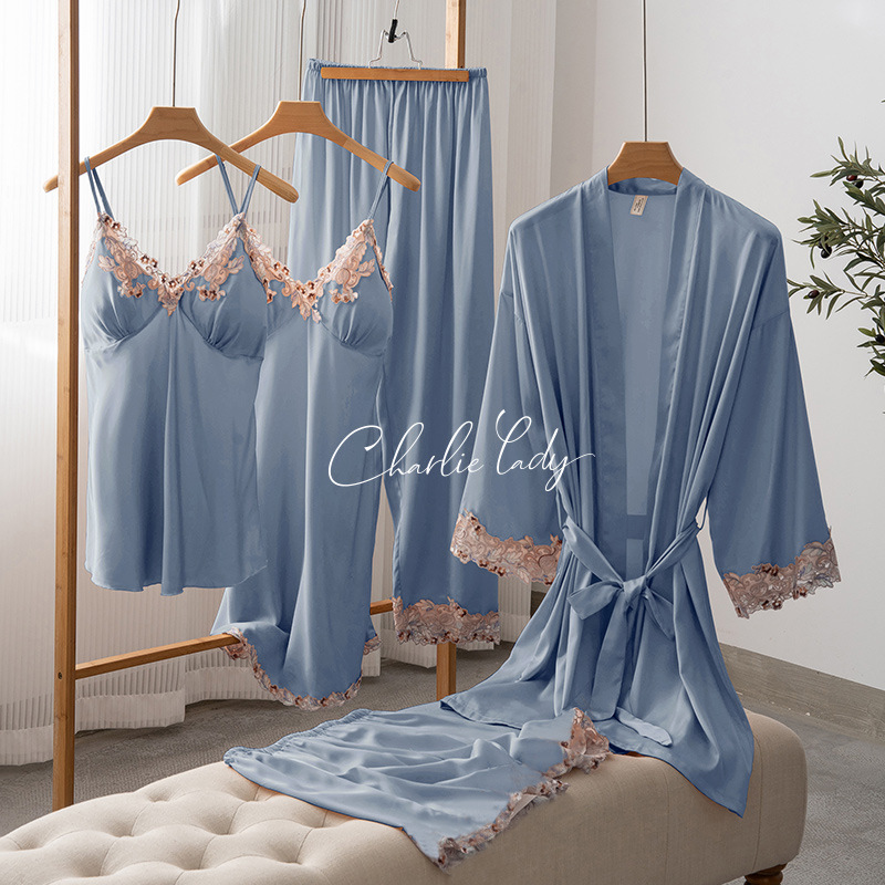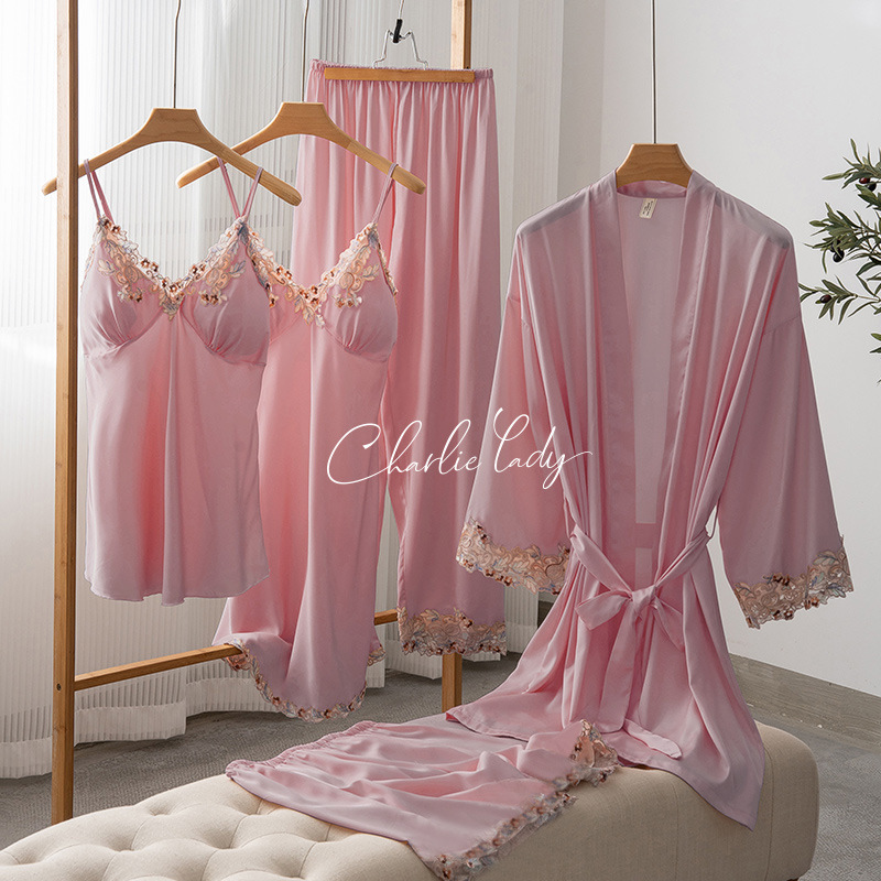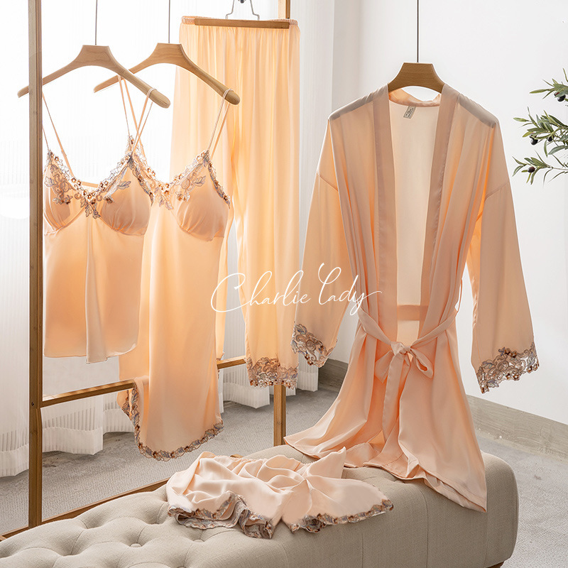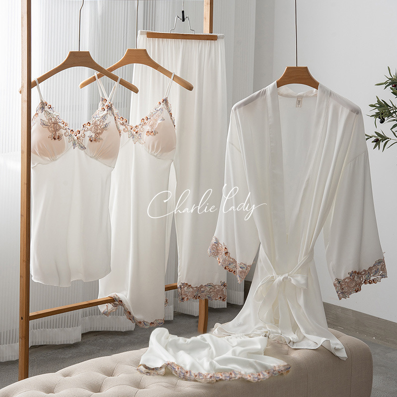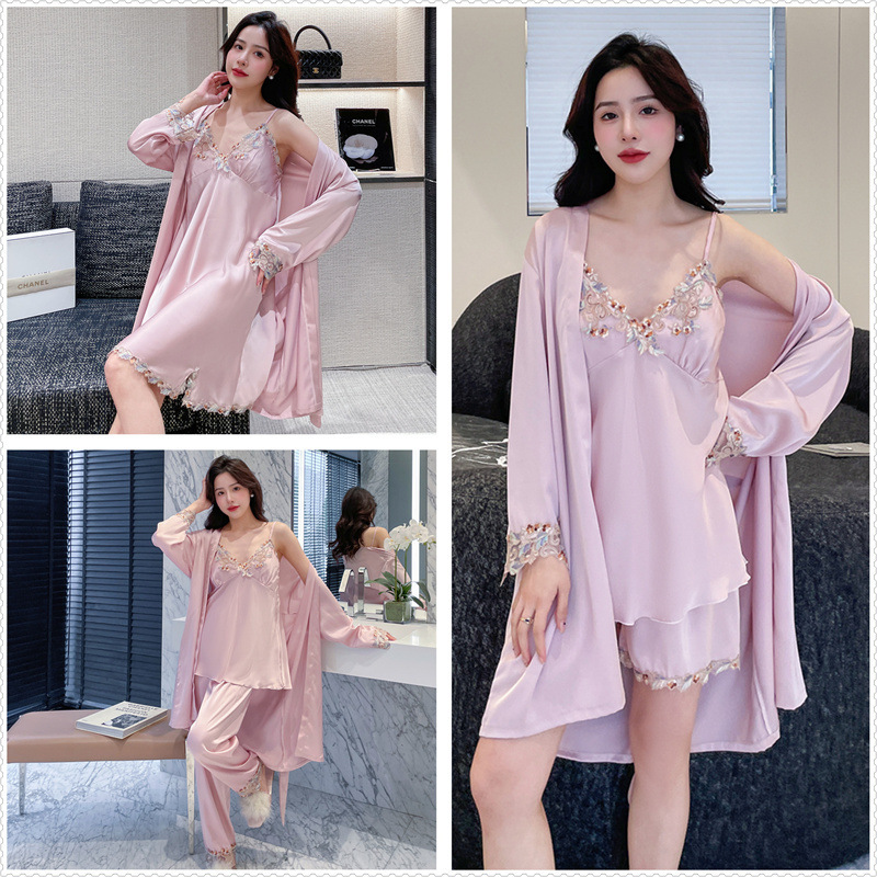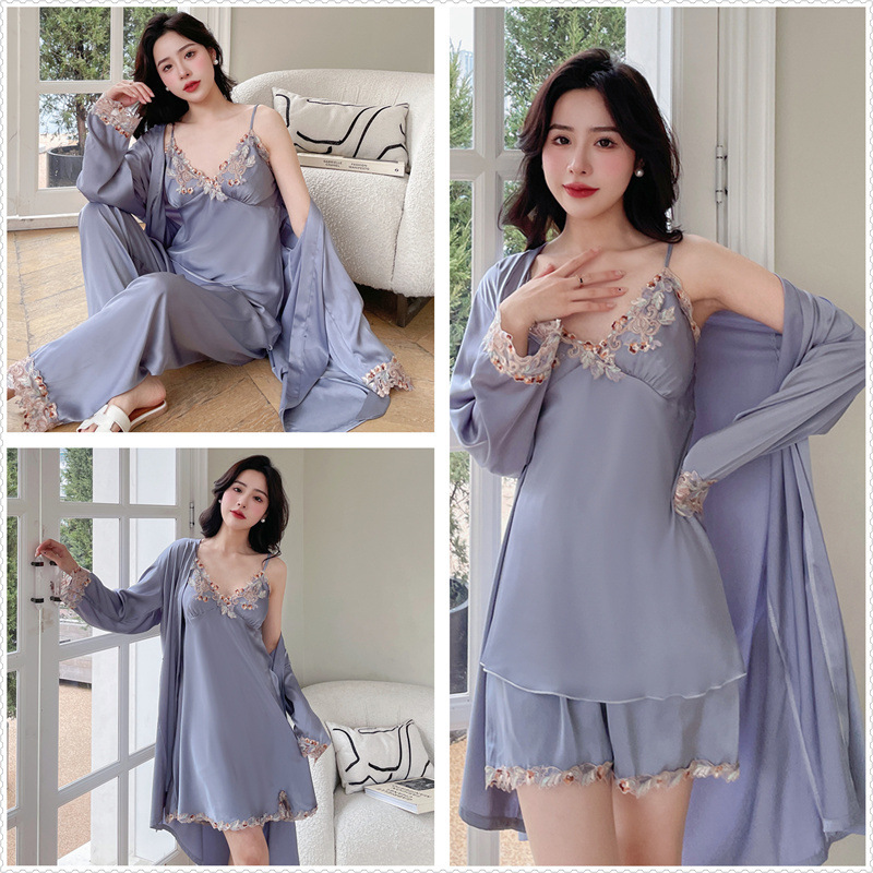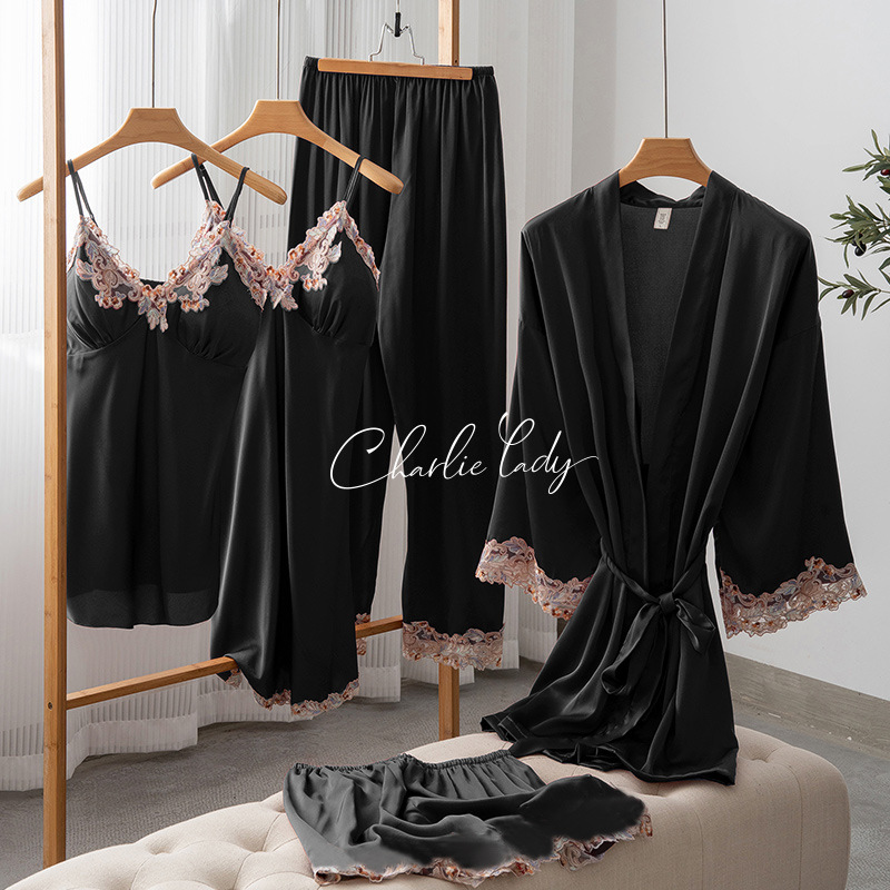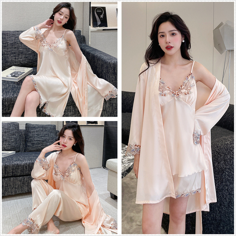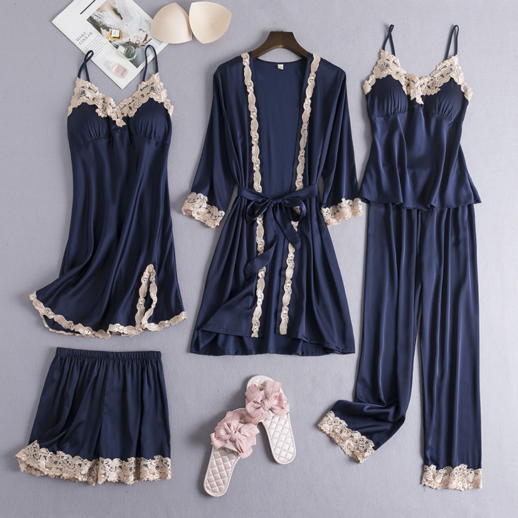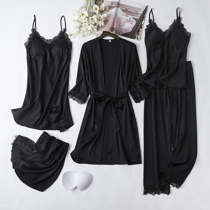 (总)2024新款睡衣睡裙女夏季冰丝薄款性感带胸垫吊带短裤长裤春夏家居服软蕾丝五件套包邮
