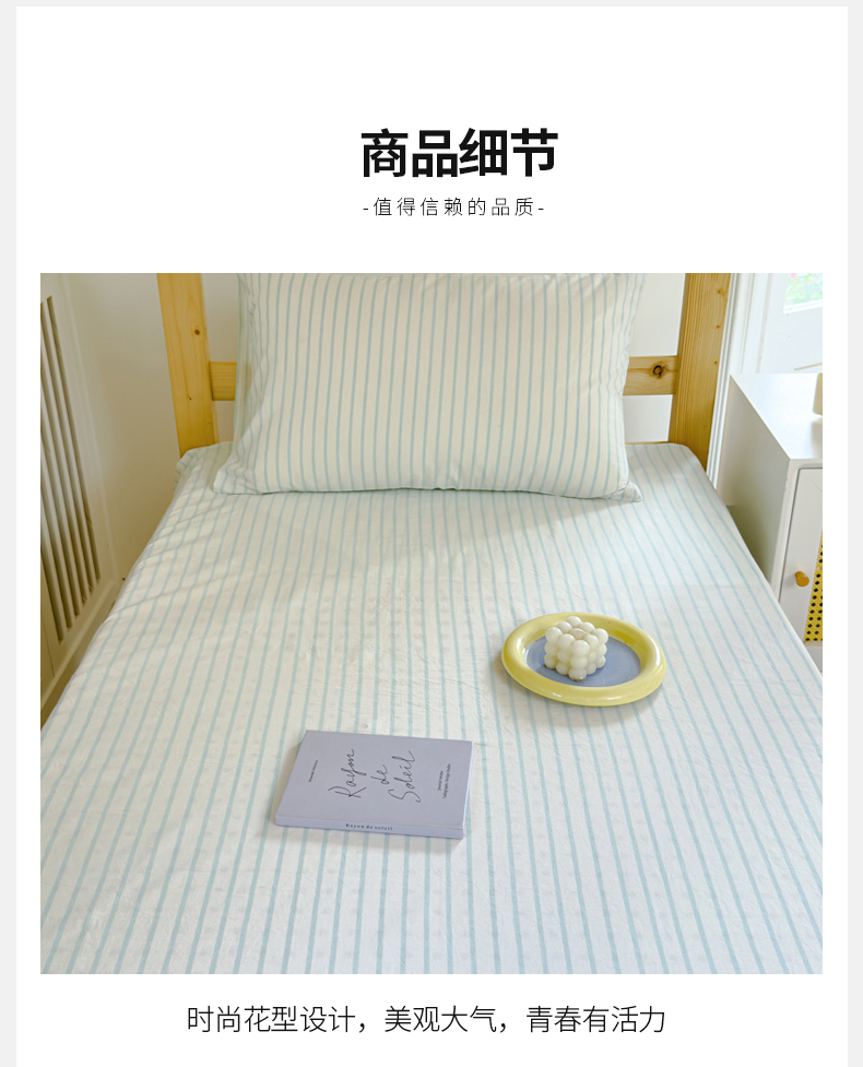 当前位置: 91家纺网 > 商品网购 > 床上用品 > 床单 > 金丝鸟家纺 2024新款A类全棉色织水洗棉单床单系列(学生床) 浅绿中条