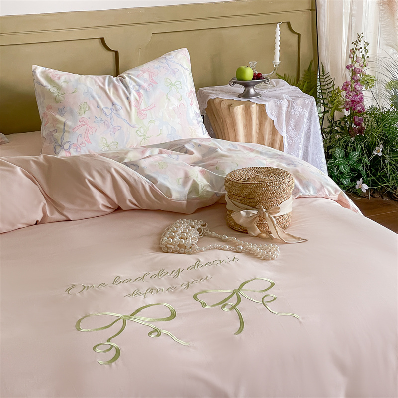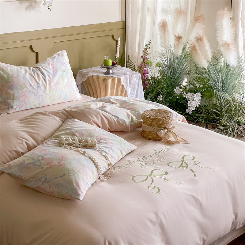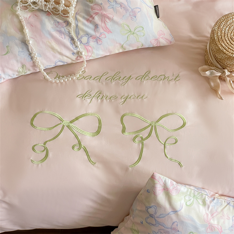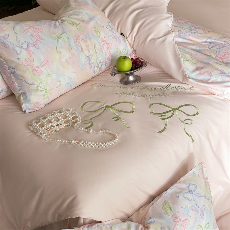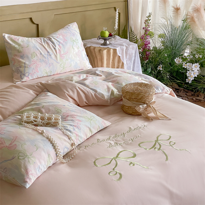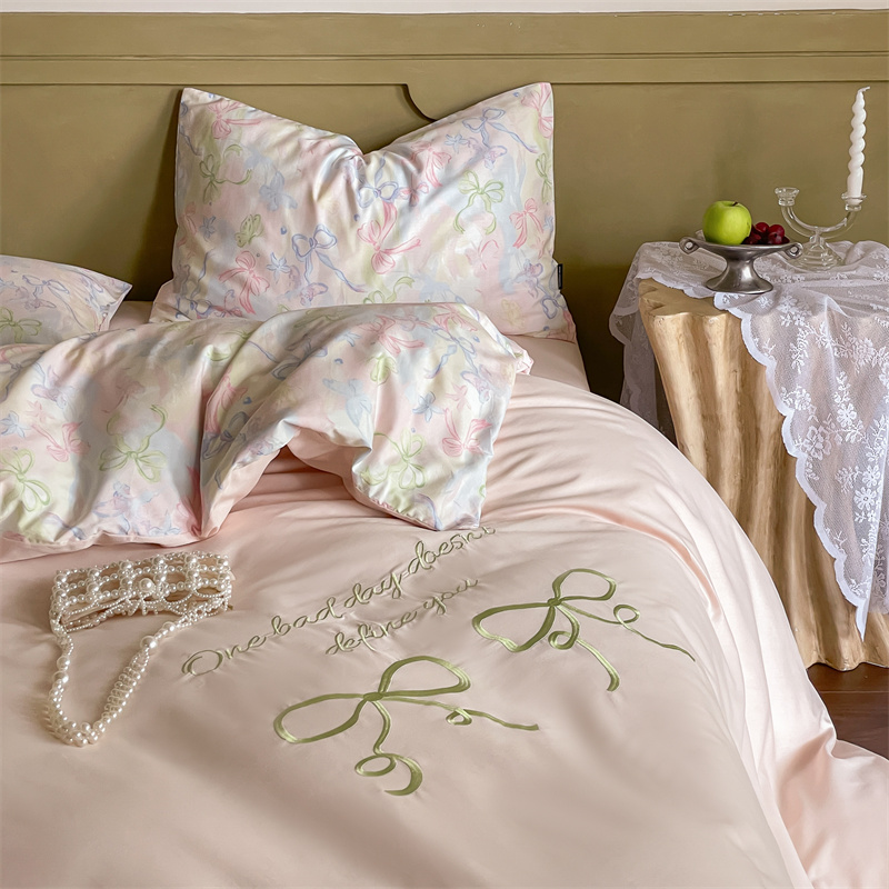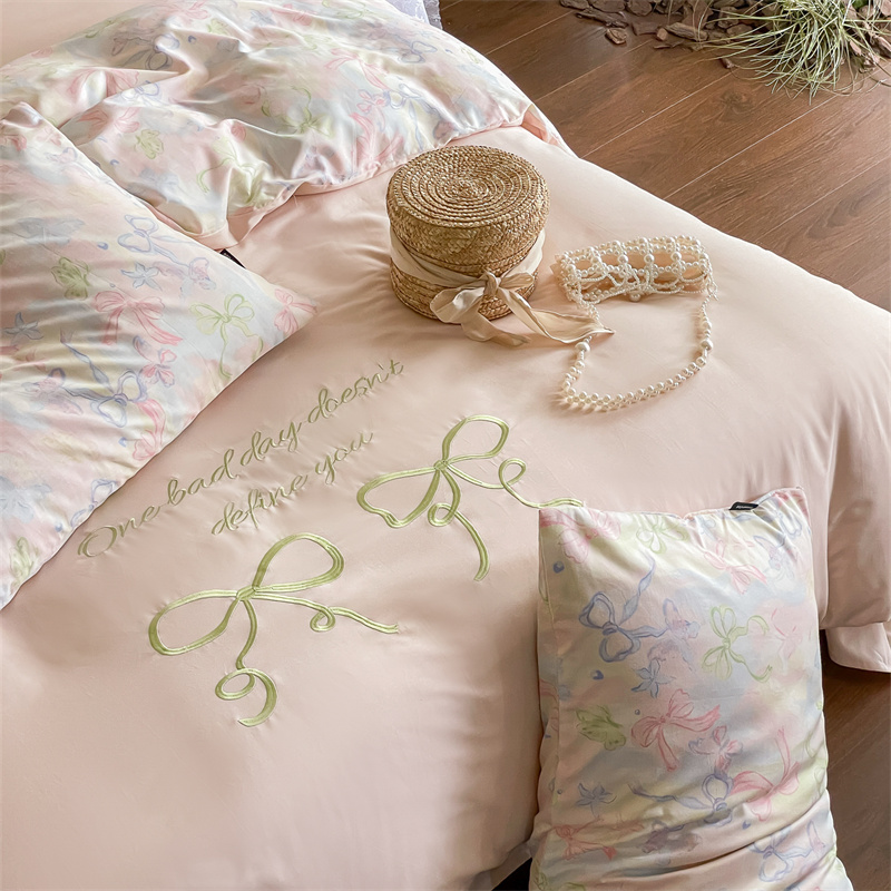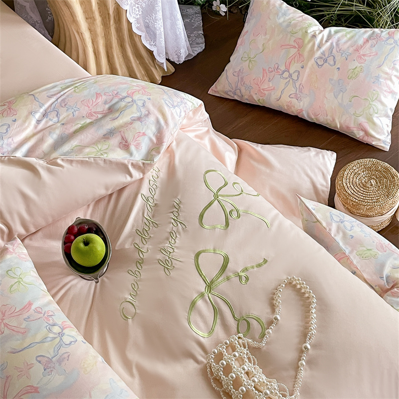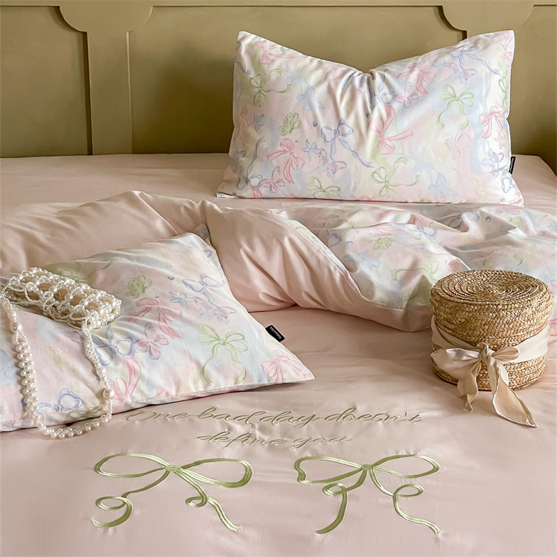 圆岛家纺 2024新款全棉印花蝴蝶结刺绣四件套 蝴蝶结粉