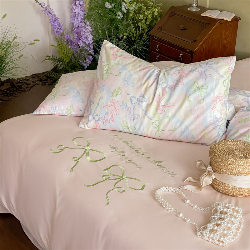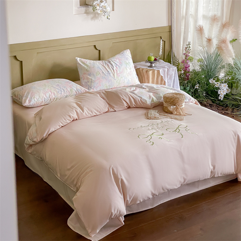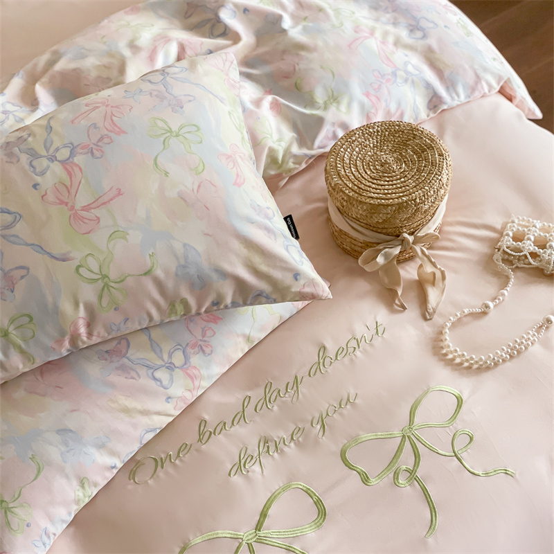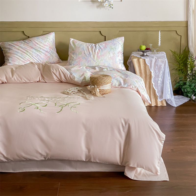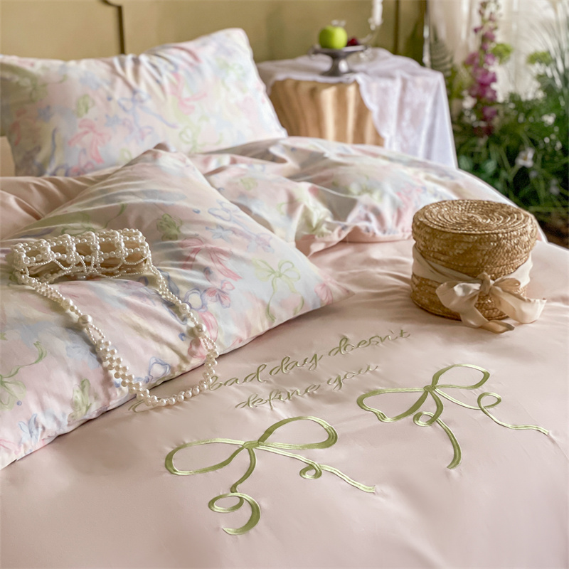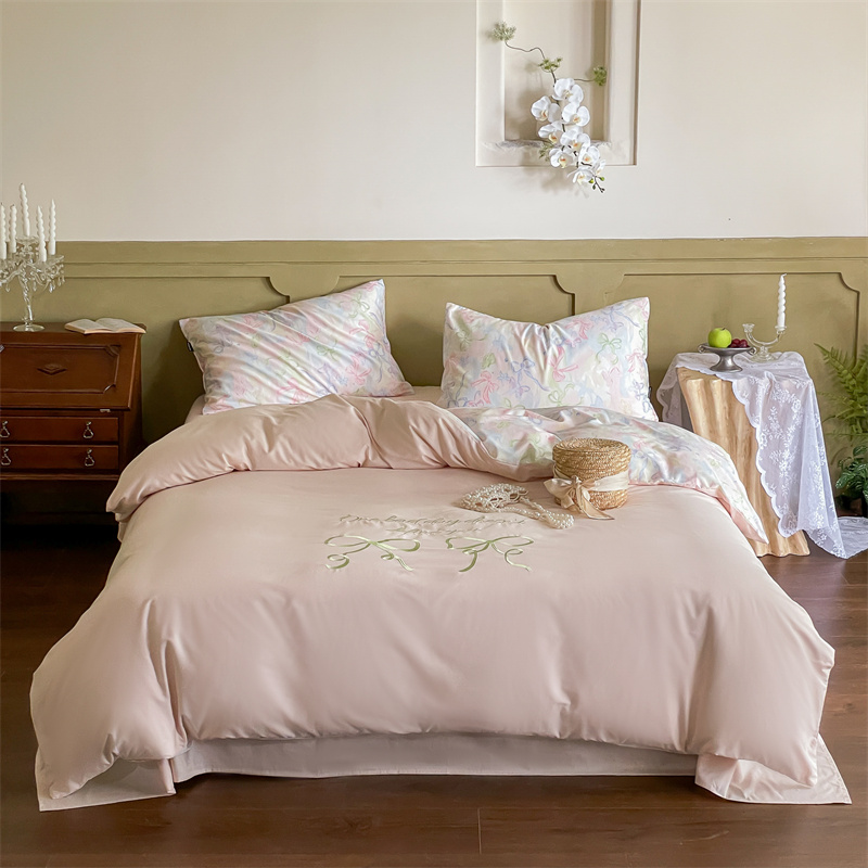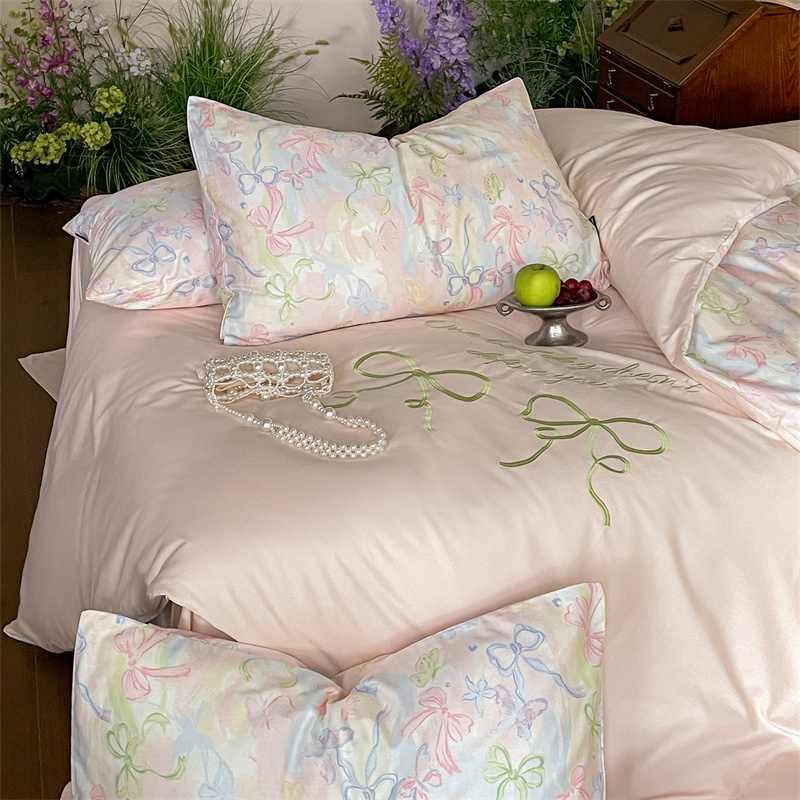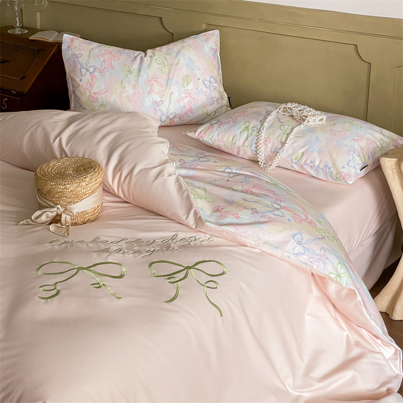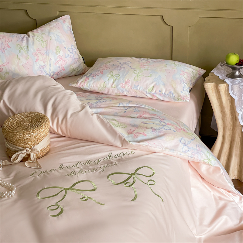 圆岛家纺 2024新款全棉印花蝴蝶结刺绣四件套 蝴蝶结粉